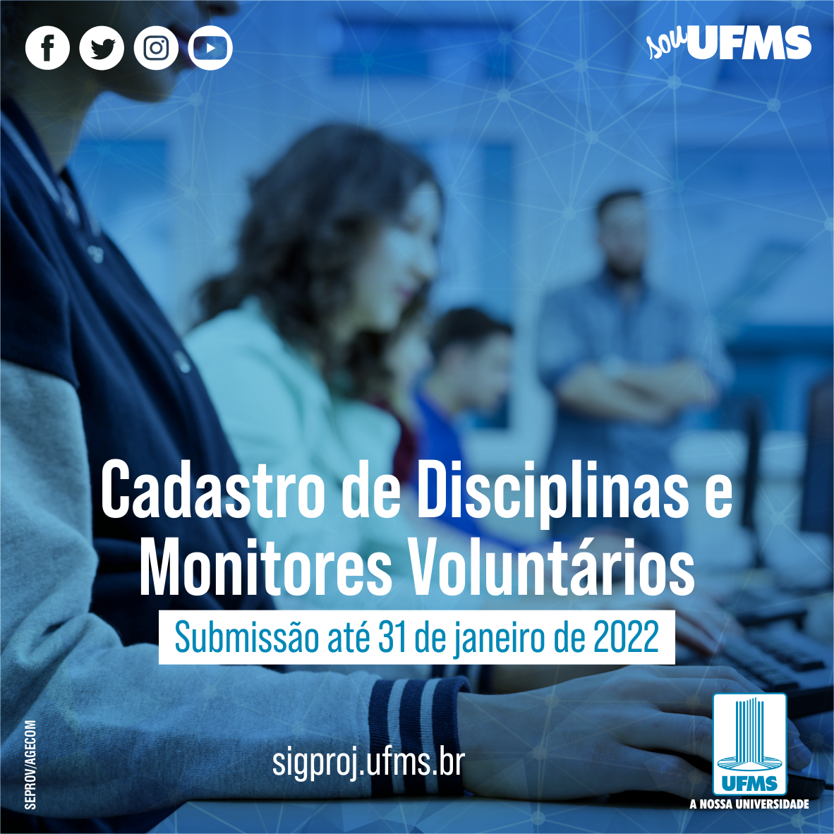 Docentes da UFMS podem cadastrar disciplinas e monitores no Programa Institucional de Monitoria Voluntária. A submissão das propostas deve ser feita no Sigproj, com prazo final em 31 de janeiro de 2022.