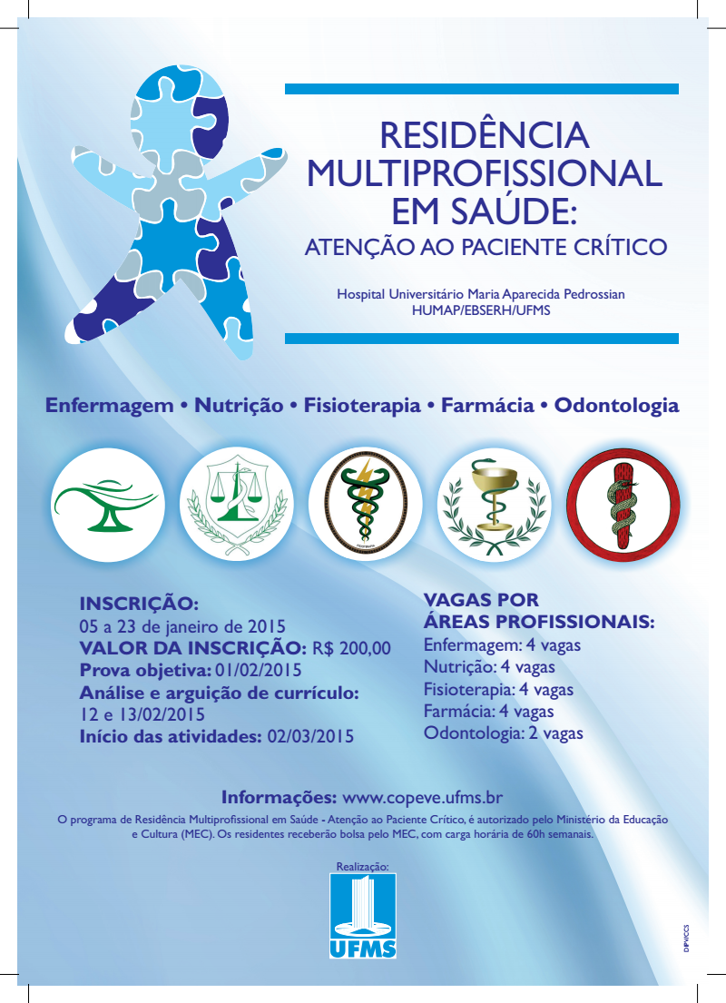 As inscrições para o processo seletivo do Programa de Residência Multiprofissional em Saúde Área Atenção ao Paciente Crítico (Premus-APC), da Universidade Federal de Mato Grosso do Sul e do Hospital Universitário Maria Aparecida Pedrossian, estão abertas até o dia 23 de janeiro.
