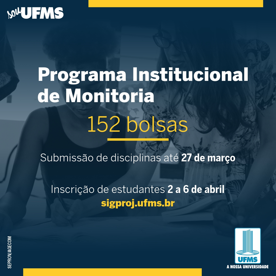 Para submeter as disciplinas e se candidatar à monitoria, professores e estudantes devem acessar o Sigproj utilizando o Passaporte UFMS e a senha. Confirma mais informações no edital. O resultado final deve ser divulgado a partir de 11 de abril.