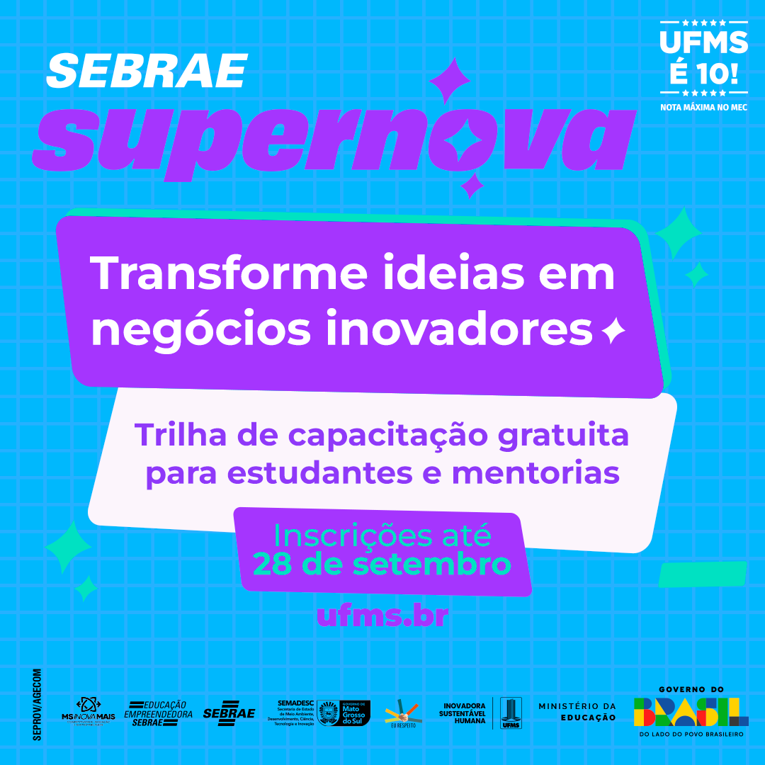 Estudantes de cursos de graduação e de pós-graduação da UFMS podem explorar o universo dos negócios e desenvolver atividades de empreendedorismo e inovação conectadas com a sociedade. A oportunidade será viabilizada pelo Programa Supernova, uma iniciativa do Ministério da Educação (MEC) e do Serviço Brasileiro de Apoio às Micro e Pequenas Empresas (Sebrae). Para participar, os interessados devem se inscrever até domingo, 28, neste link.