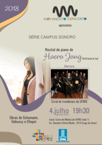 Vencedora de diversos prêmios como solista, Haera apresentará um repertório com grandes nomes da música para piano como Schumann, Debussy e Chopin. A abertura do concerto ficará a cargo do Coral de Trombones da UFMS, dirigido pelo professor do Curso de Música da UFMS Jackes Ângelo.
