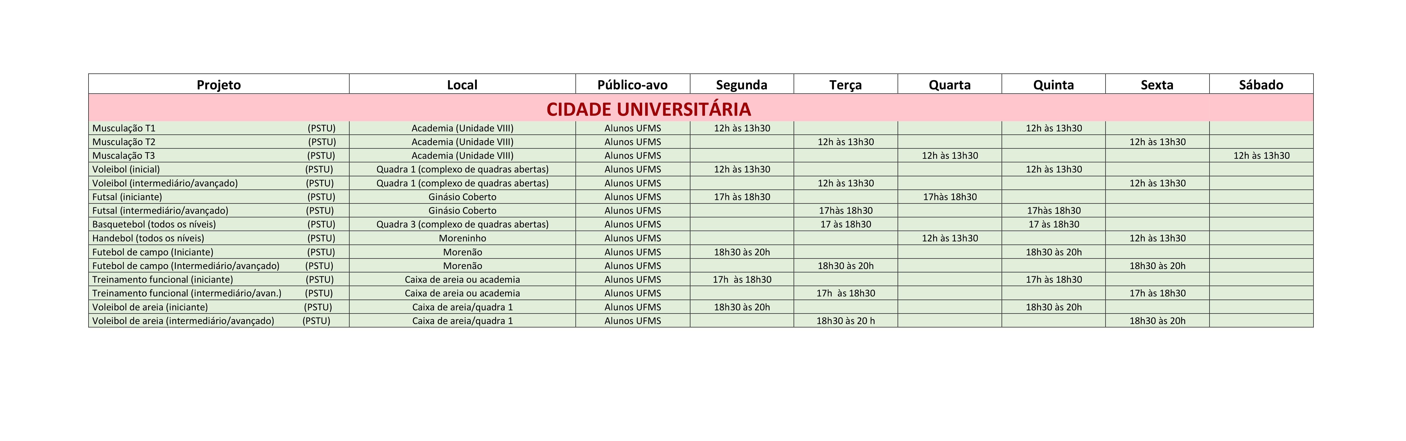 O Programa Segundo Tempo Universitário está com vagas abertas para aulas de musculação, voleibol, futsal, basquetebol, handebol, futebol de campo e treinamento funcional. As aulas serão realizadas de segunda a sábado, dependendo da modalidade, nas dependências da Cidade Universitária.