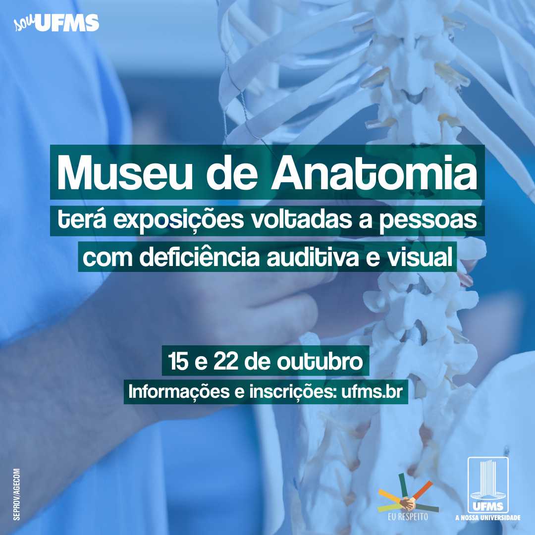 No dia 15 de outubro as exposições serão voltadas às pessoas com deficiência auditiva e no dia 22, às pessoas com deficiência visual. Em ambos os dias, o atendimento será entre 8h30 e 11h30 e 13h e 17h30. “O objetivo é proporcionar a experiência acerca da anatomia humana com atividades adaptadas, com uma exposição sobre os diversos sistemas e estruturas do corpo humano por meio da apresentação de peças biológicas”, informou a coordenadora, Elizangela dos Anjos Silva.