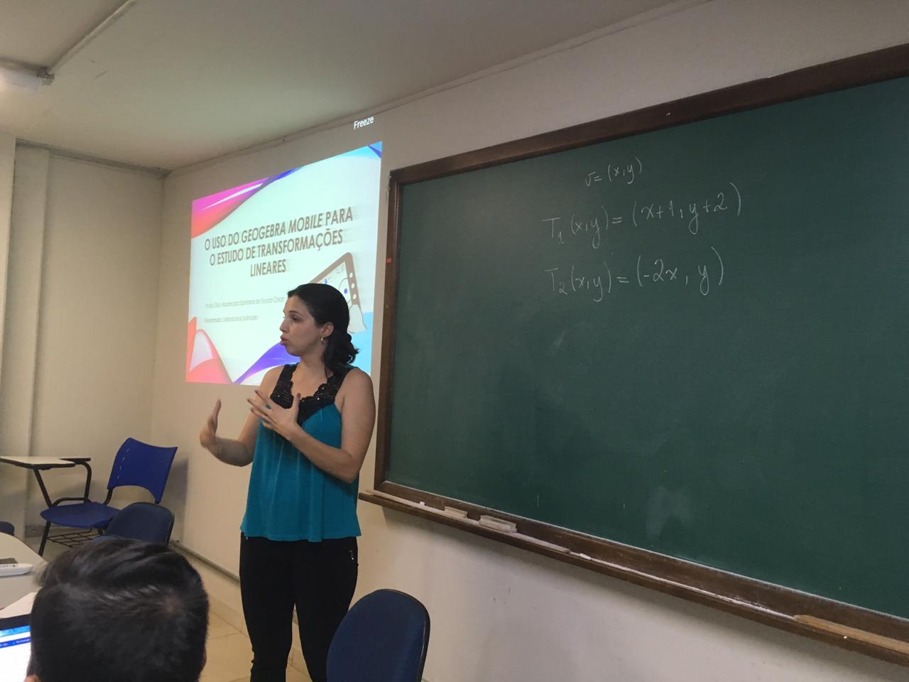 Já com turma de 6ª ano, foram realizadas produções de vídeos sobre quadriláteros, também integrando o GeoGebra. Outros dois orientandos de Mestrado desenvolvem projetos de ensino de graduação para os acadêmicos de Licenciatura em Matemática da UFMS, o primeiro sobre Transformações Lineares, conteúdo visto na disciplina de Álgebra Linear, e o segundo sobre Integrais Múltiplas, ensinadas em Cálculo III.