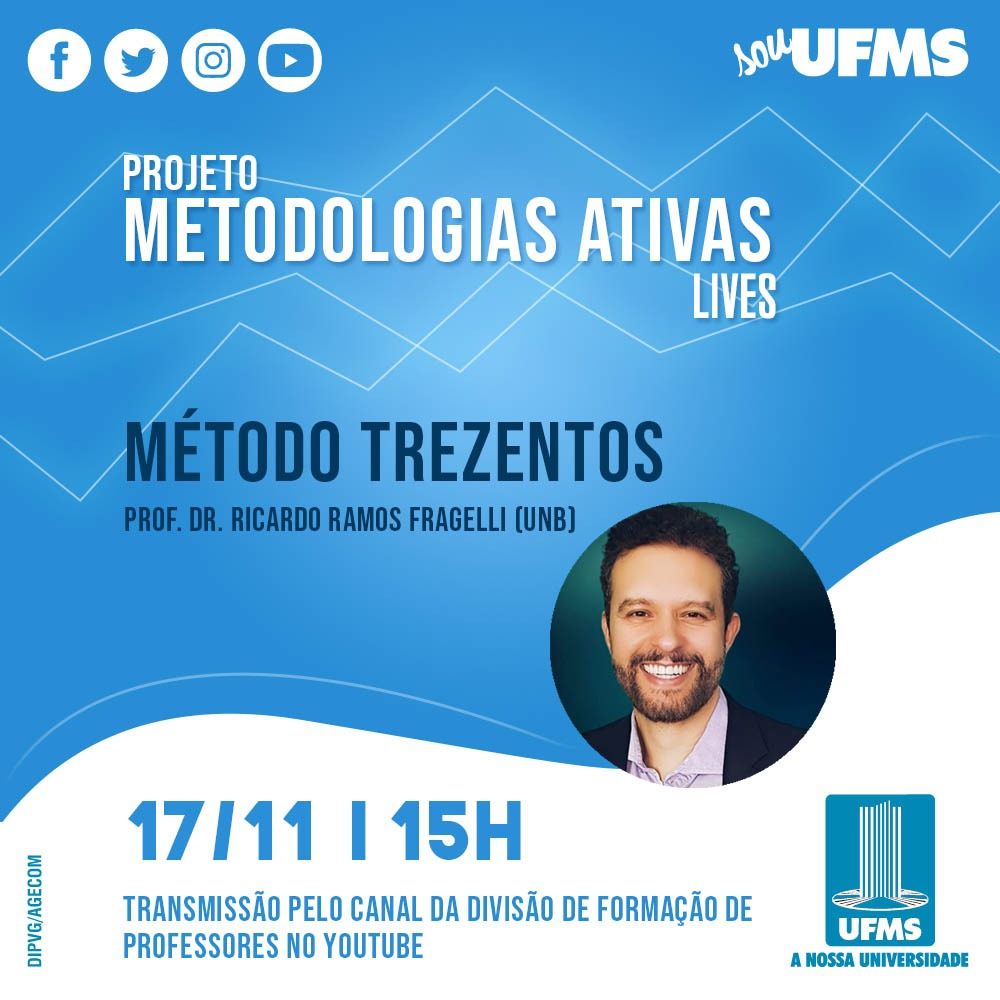 O Projeto Metodologias Ativas realiza amanhã (17), às 15h, a última de uma série de lives que estão sendo promovidas desde outubro. Desta vez o tema é Método Trezentos – Second Edition, com o professor Ricardo Ramos Fragelli, da Universidade de Brasília (UnB).