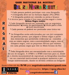 Visibilizar a beleza, a cultura e a ancestralidade negra existentes no Mato Grosso do Sul, historicamente apagados e fora dos padrões estéticos eurocêntricos é a proposta do Projeto Negritude em Debate, que este ano realiza a Mostra Fotográfica “Beleza Negra Resiste”, ação interinstitucional da UFMS, Campus de Aquidauana.