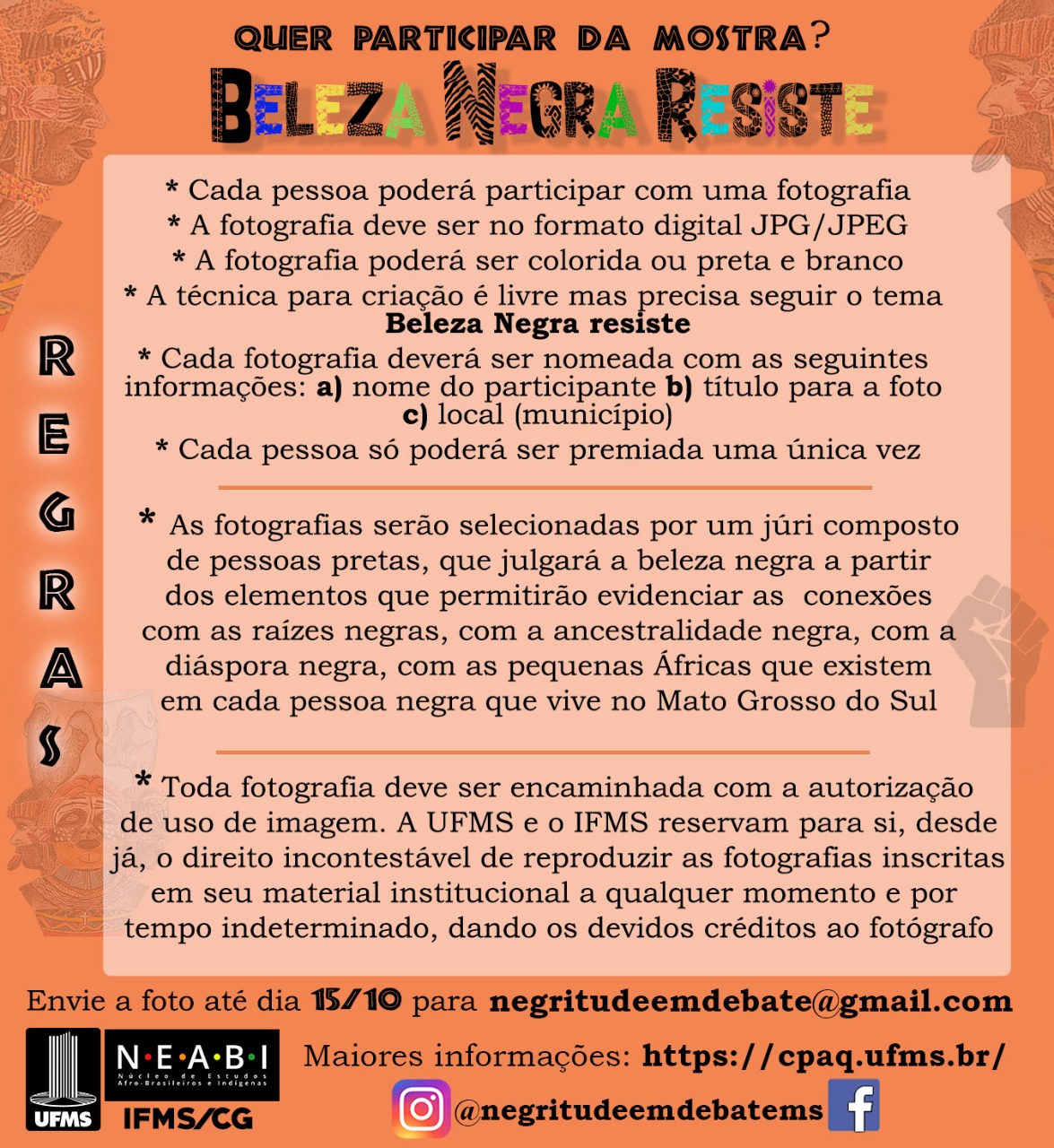 Mais informações podem ser obtidas pelo e-mail negritudeemdebate@gmail.com e o projeto pode ser acompanhado pelo Facebook @negritudeemdebatems e no Instagram @negritudeemdebatems.