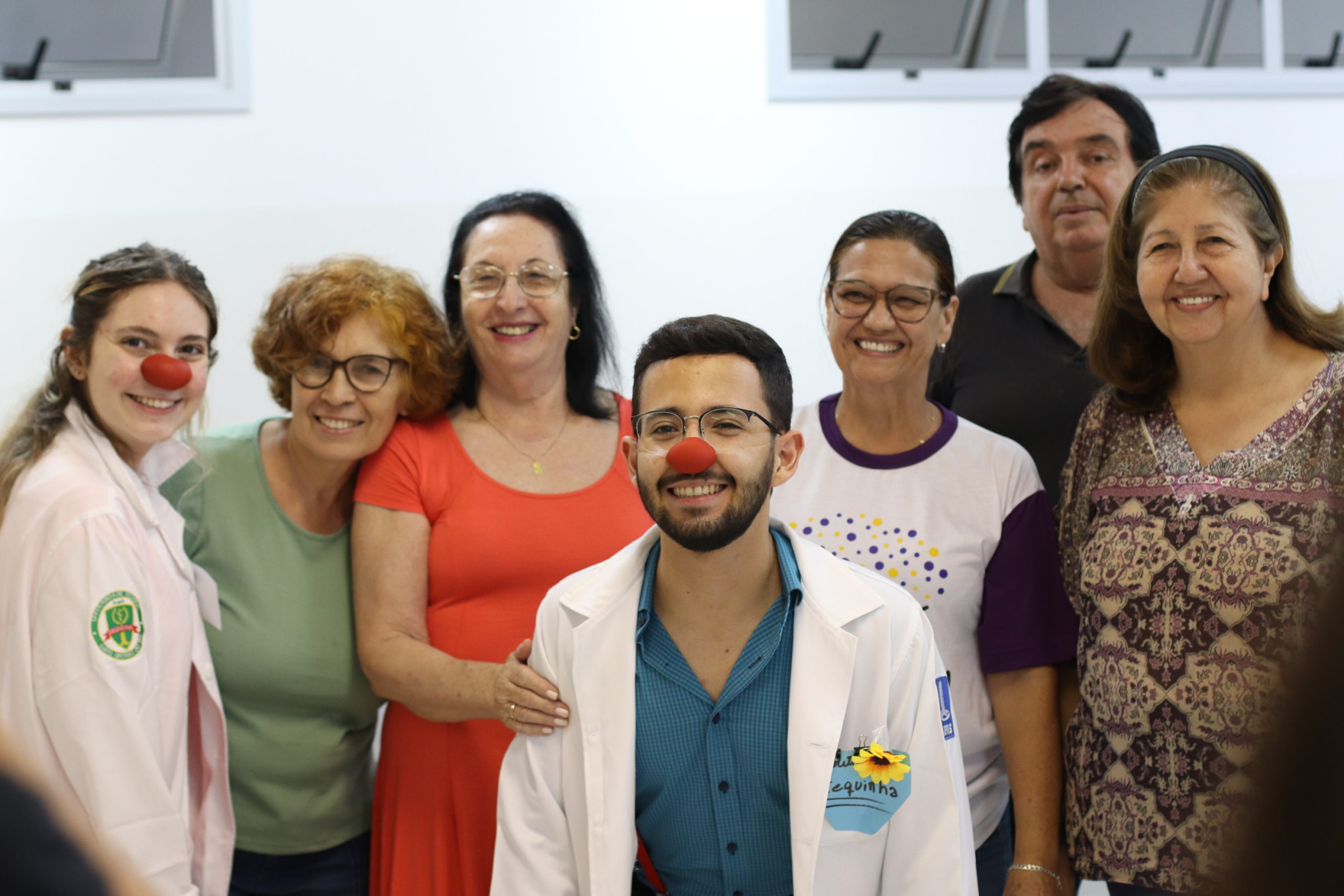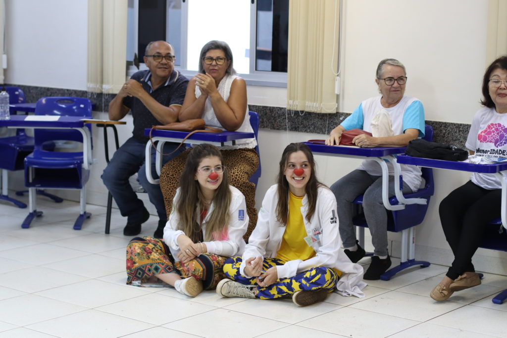 A primeira atividade da tarde consistiu em jogo de telefone sem fio, em que os estudantes do projeto Rir instigaram os idosos a nomearem instrumentos médicos com nomes fictícios, para depois averiguar se eles acertariam o objeto de cada palhaço trouxe para a brincadeira, de forma a mobilizar a memória de curto prazo dos participantes. Em um segundo momento, os integrantes da Unapi e os doutores palhaços se dividiram em grupos para imaginar e desenvolver cenas de teatro que representassem alguma emoção específica, para que os membros dos outros grupos adivinhassem quais seriam elas, provocando muitas risadas entre os envolvidos.