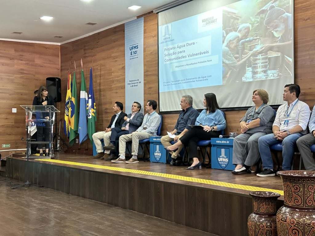 A professora da Faculdade de Engenharias, Arquitetura e Urbanismo e Geografia Keila de Oliveira é coordenadora do projeto Água Dura: soluções para comunidades vulneráveis. “Nosso projeto traz uma solução para o abastecimento e tratamento de água a populações que não possuem isso nas localidades. Temos regiões em MS que sofrem bastante com a água salobra, salina ou água dura. Beber essa água gera muitos impactos na saúde, como doenças gastrointestinais e, também, impacto econômico para a agricultura e pecuária, e social. Como solução desenvolvemos um sistema de filtração acessível e eficiente, baseado em energia solar, garantindo uma autonomia para as comunidades”, destacou.