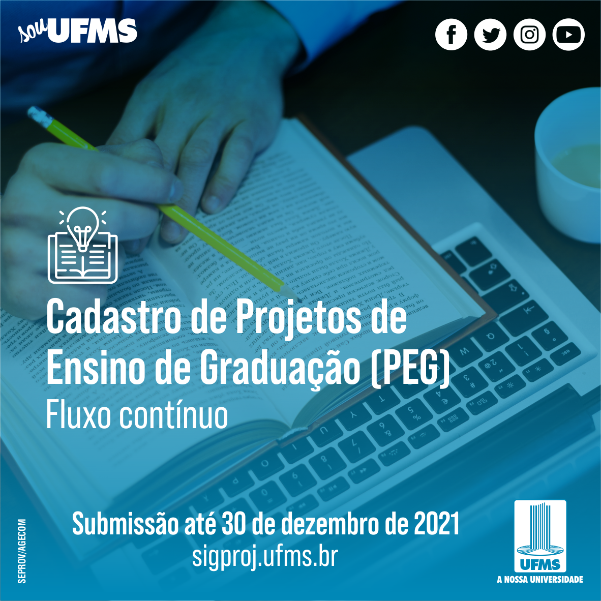 Professores da Universidade devem inscrever Projetos de Ensino de Graduação – PEG sob sua coordenação no edital de fluxo contínuo que encerra em 30 de dezembro de 2021. O cadastro é necessário para que as atividades dos projetos possam ser realizadas.