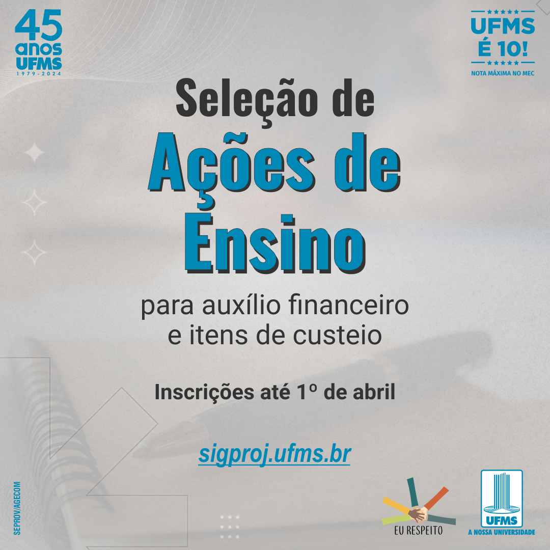 Docentes e técnicos-administrativos que possuem propostas de Ações de Ensino cadastradas e aprovadas podem solicitar concessão de itens de custeio e auxílio financeiro até o dia 1º de abril. As submissões devem ser enviadas no Sistema de Informação e Gestão de Projetos (Sigproj) e a previsão é que os recursos sejam liberados até o dia 8 de maio.
