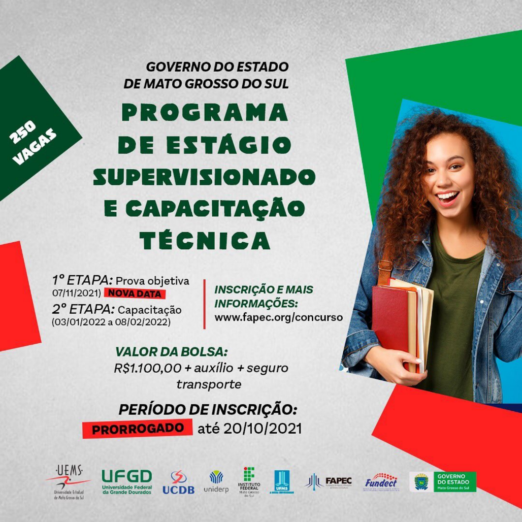 Foram prorrogadas para até 20 de outubro as inscrições para o “Programa de estágio supervisionado e capacitação técnica do Governo do Estado de Mato Grosso do Sul”. Os estudantes interessados devem realizar o procedimento pela internet no site da Fundação de Apoio à Pesquisa, ao Ensino e à Cultura (Fapec).