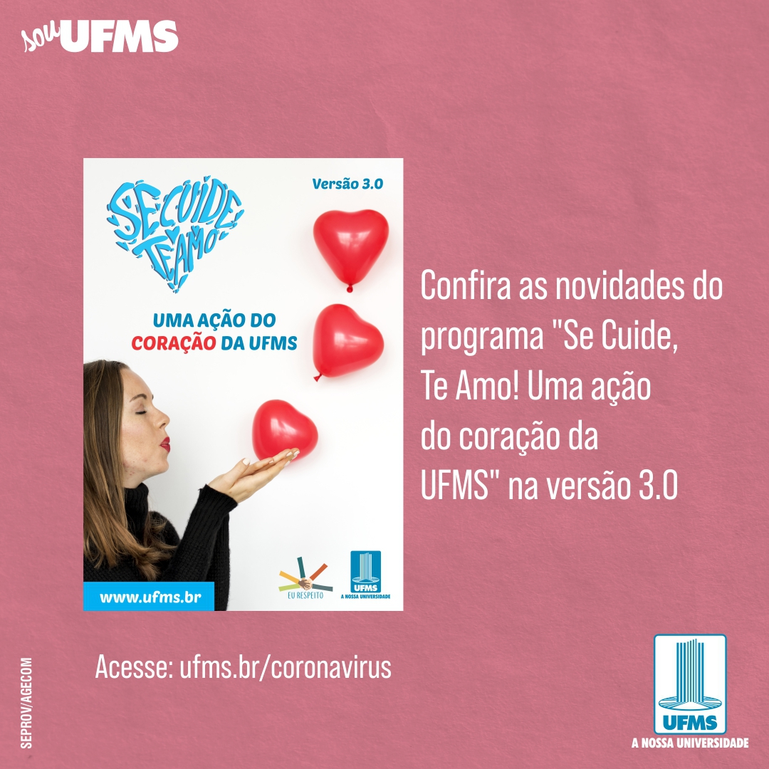 Já pode ser acessada na página ufms.br/coronavirus a versão 3.0 do programa “Se Cuide, Te Amo! Uma ação do coração da UFMS”. O documento traz as ações promovidas pela Universidade em prol de melhorias na qualidade de vida e os cuidados para a proteção de toda a comunidade no momento de pandemia.