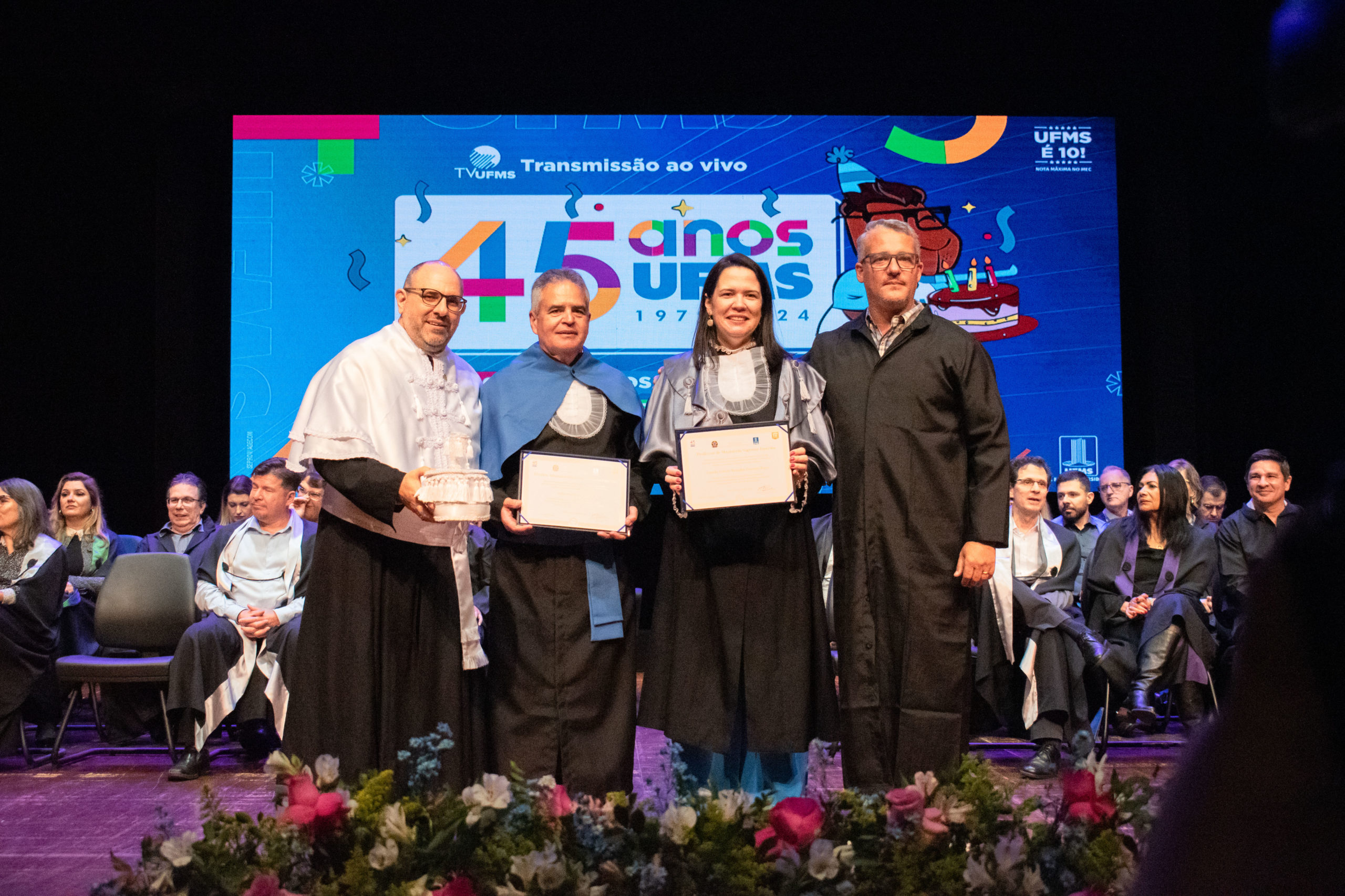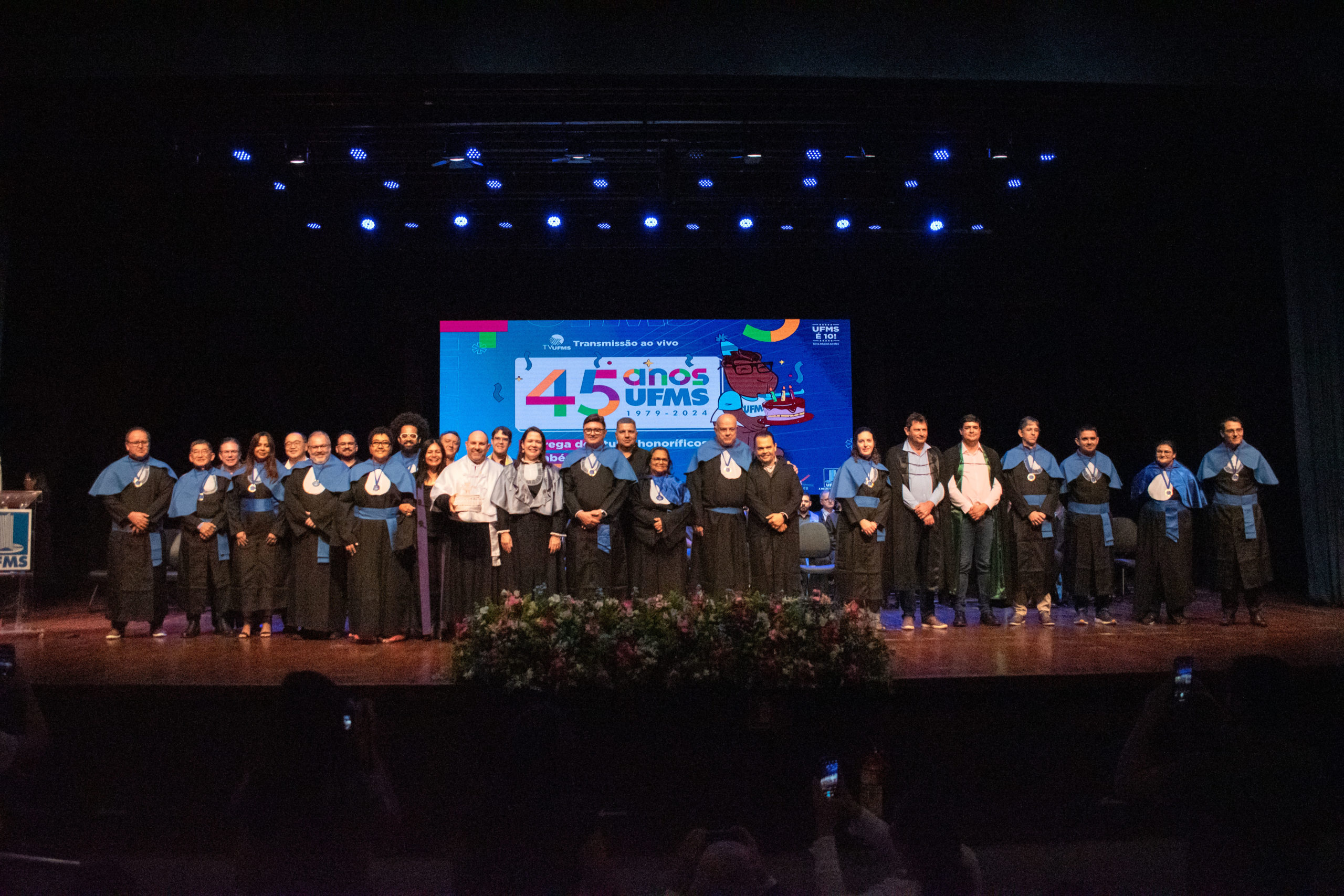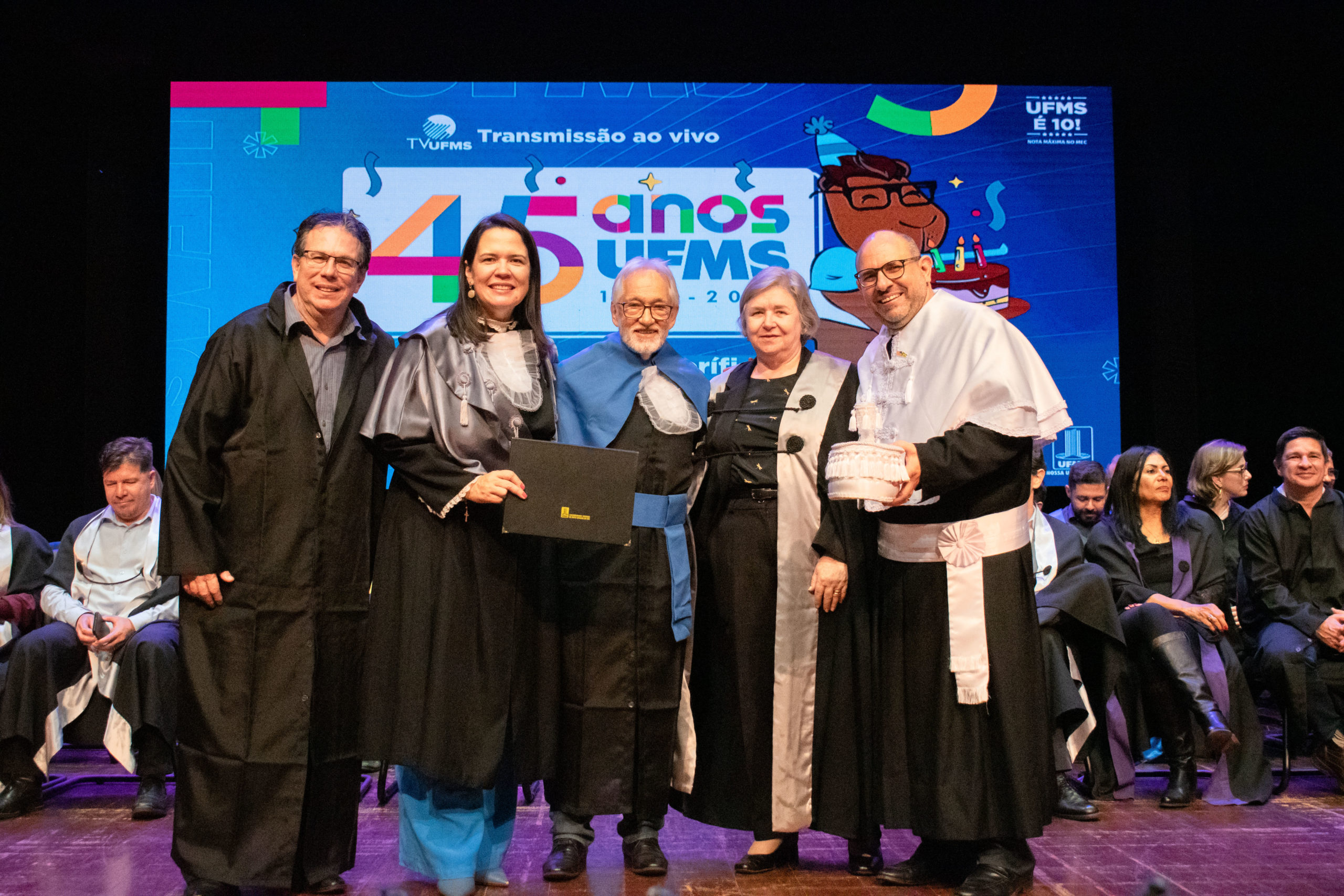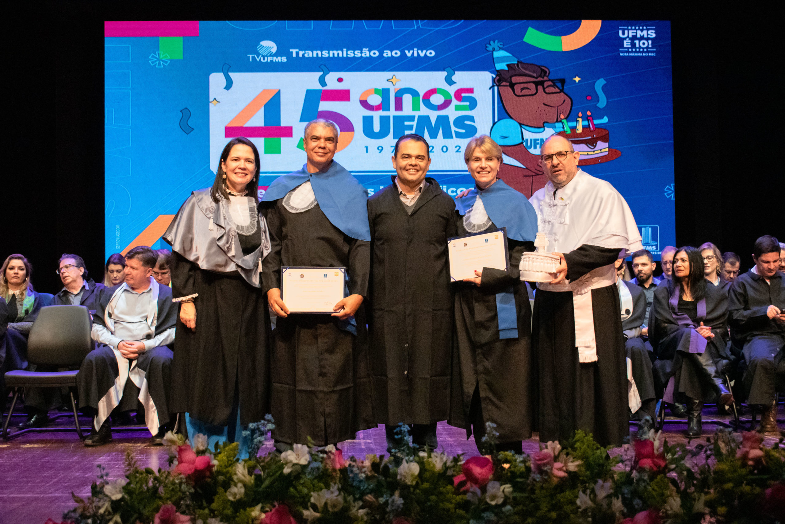 Em celebração aos 45 anos de Federal, o Teatro Glauce Rocha recebeu na manhã desta terça-feira, 2, a cerimônia com a entrega dos títulos honoríficos e de ordem de mérito àqueles que contribuíram e contribuem para a história de sucesso da Universidade. Autoridades, gestores e diretores das unidades, professores, técnicos-administrativos, estudantes, egressos e familiares estiveram presentes e cantaram parabéns para a UFMS.