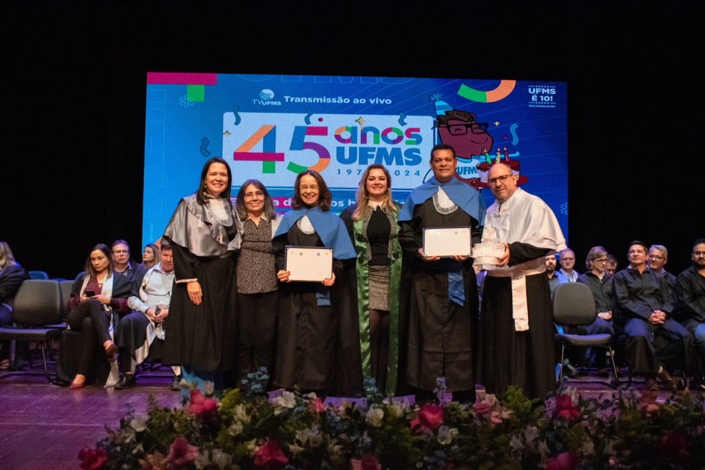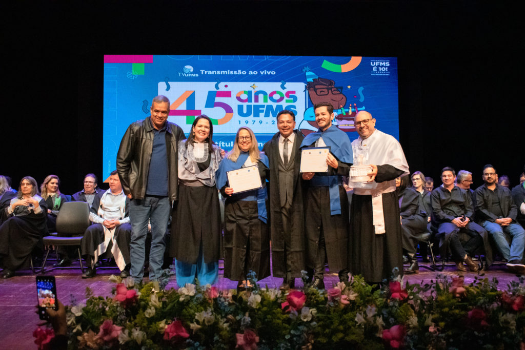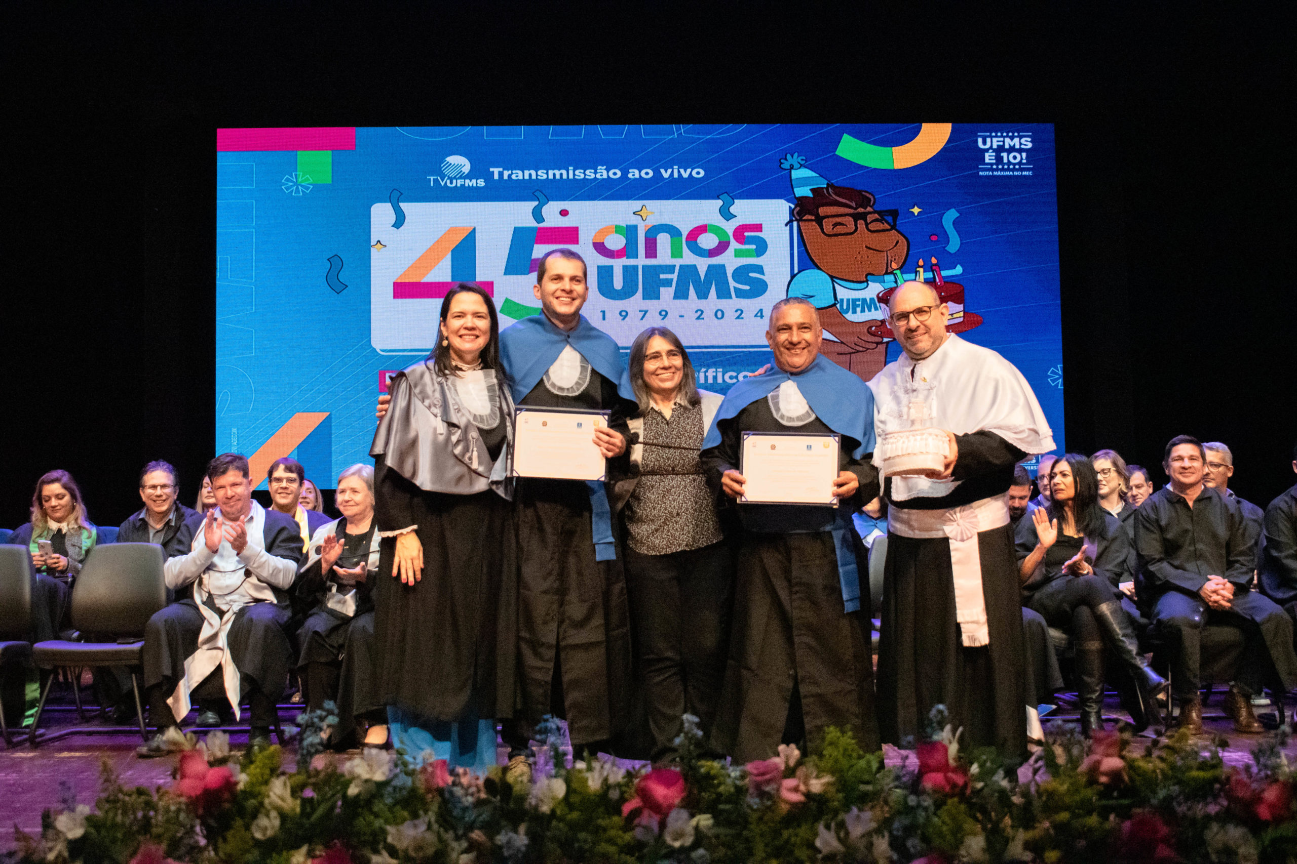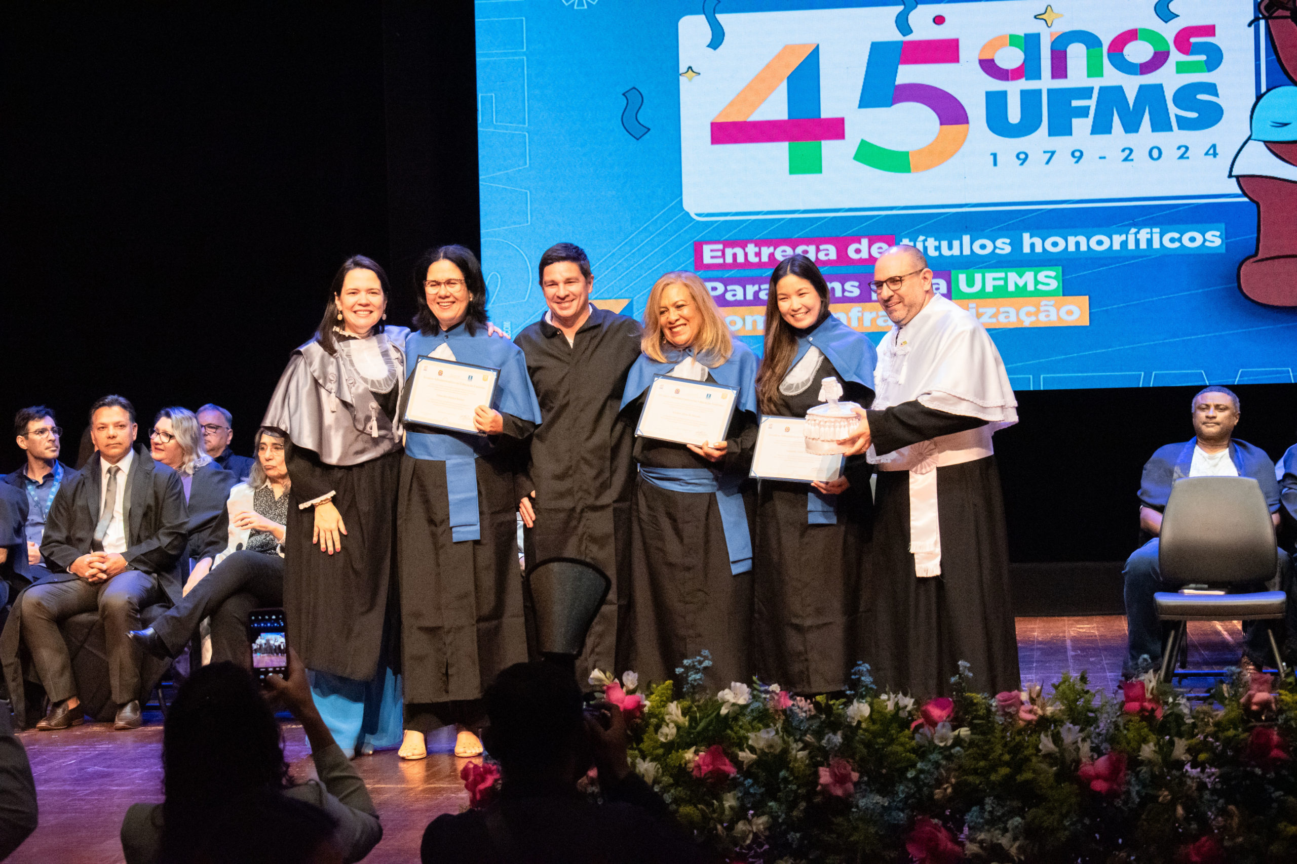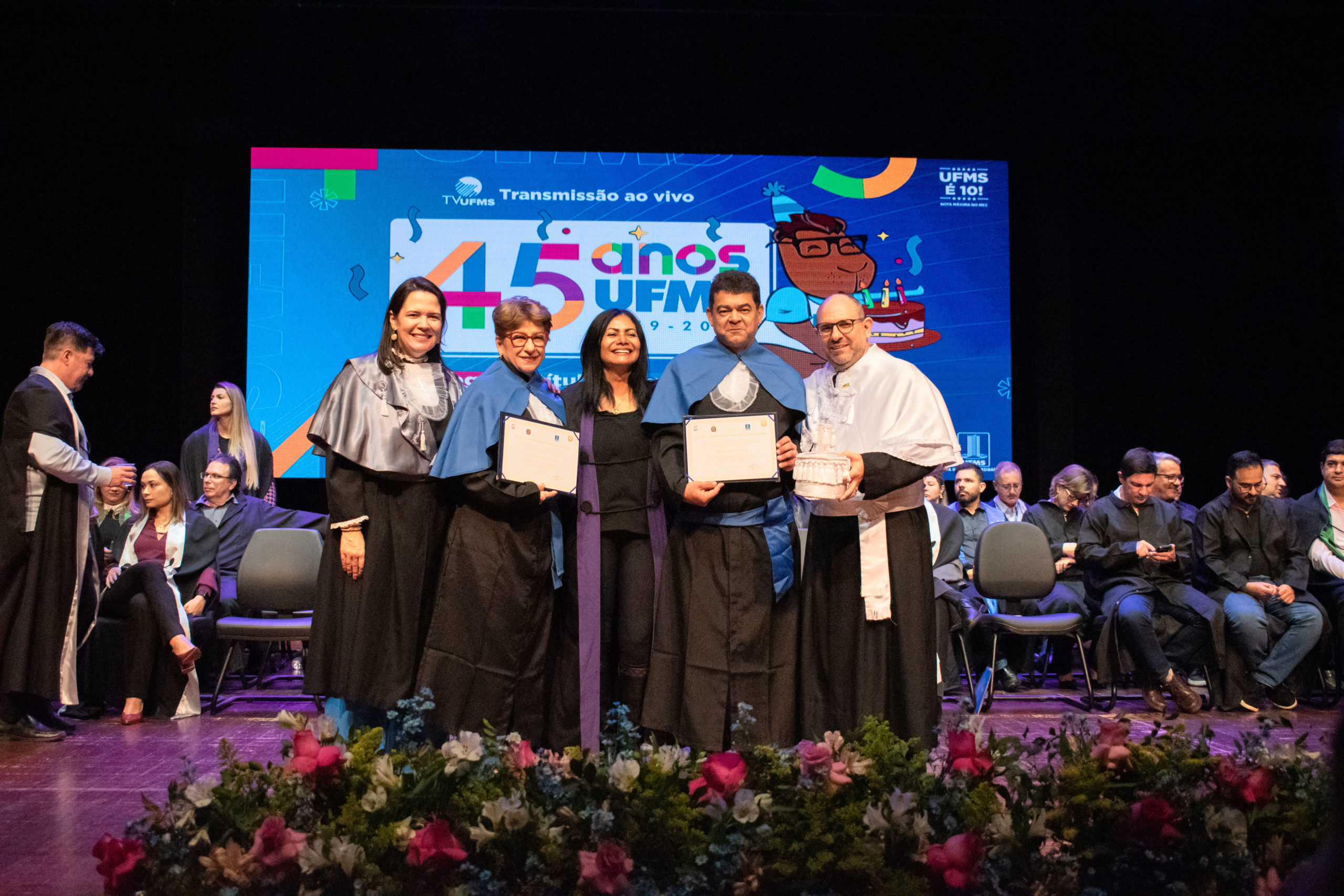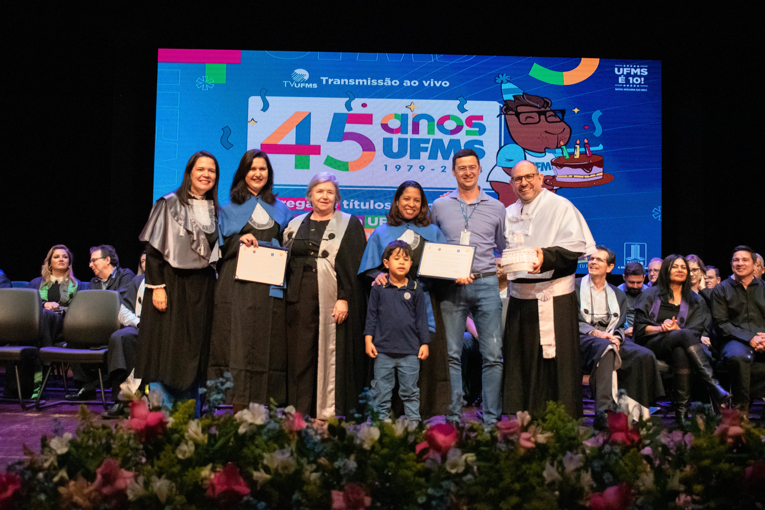 Em celebração aos 45 anos de Federal, o Teatro Glauce Rocha recebeu na manhã desta terça-feira, 2, a cerimônia com a entrega dos títulos honoríficos e de ordem de mérito àqueles que contribuíram e contribuem para a história de sucesso da Universidade. Autoridades, gestores e diretores das unidades, professores, técnicos-administrativos, estudantes, egressos e familiares estiveram presentes e cantaram parabéns para a UFMS.