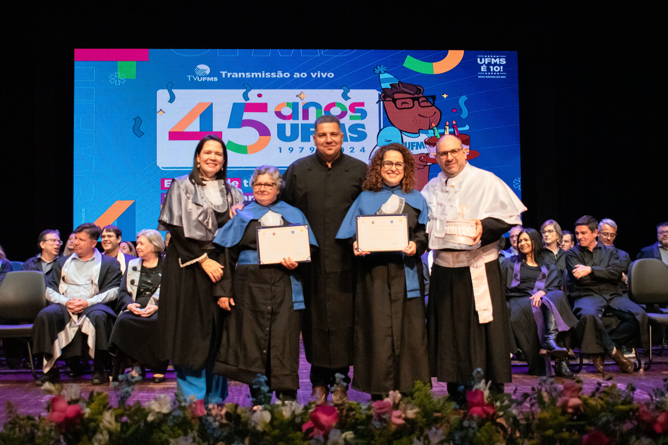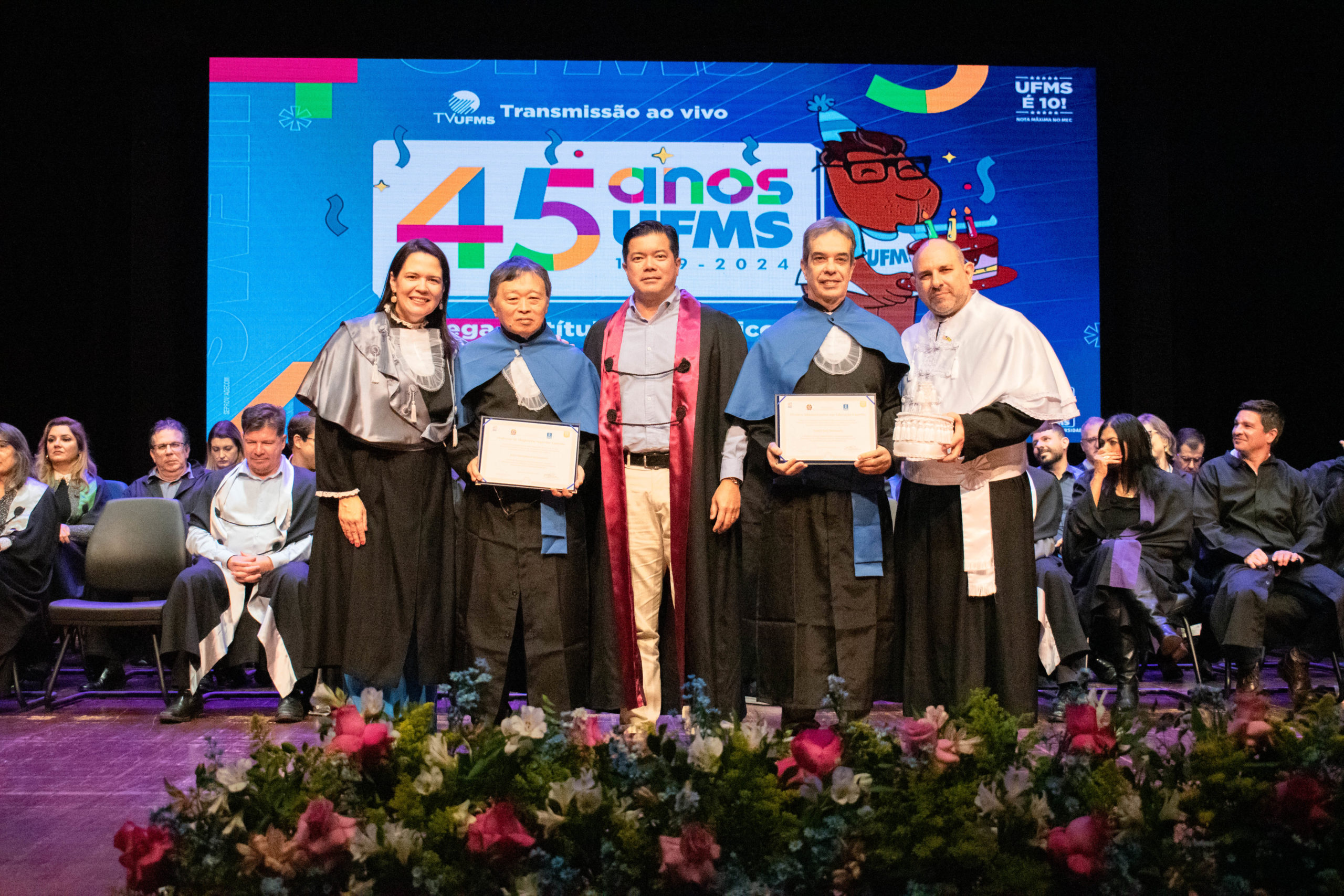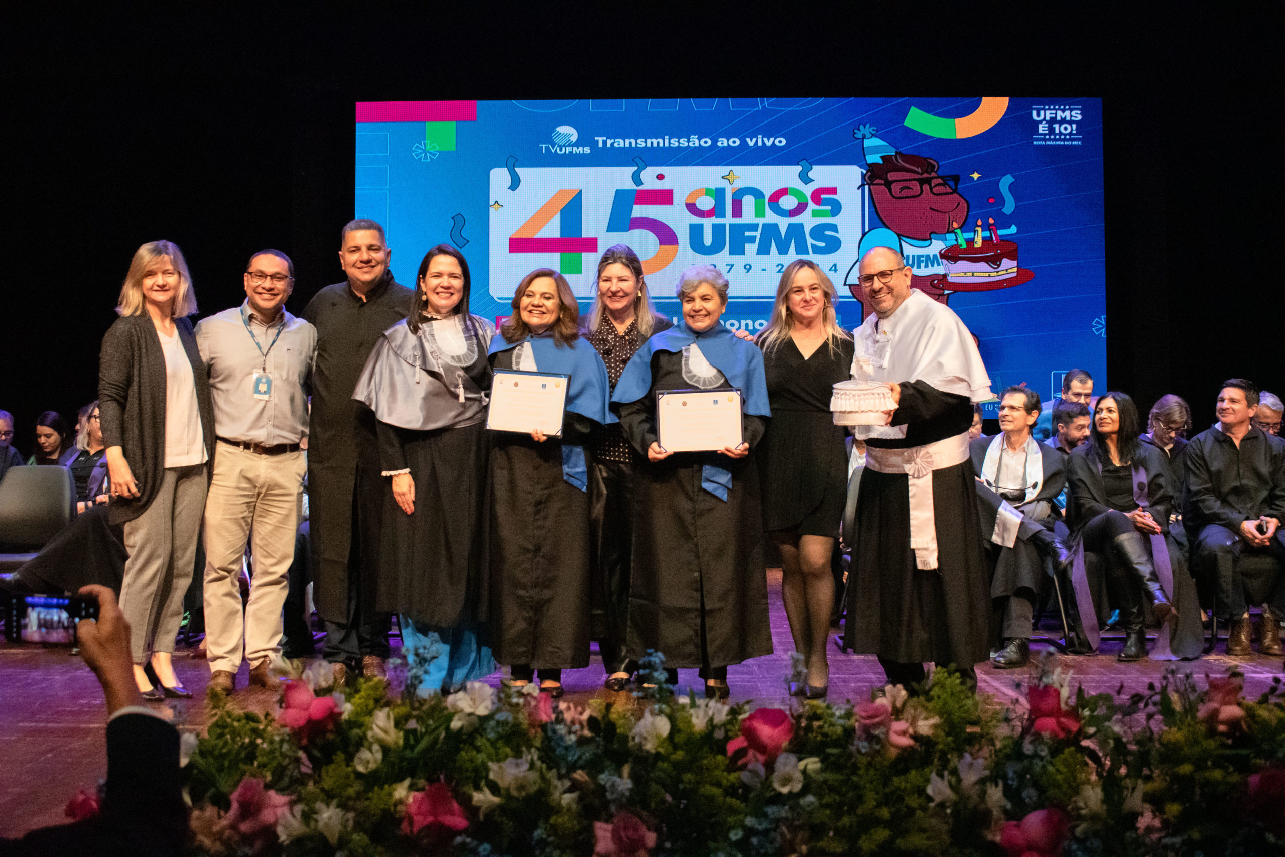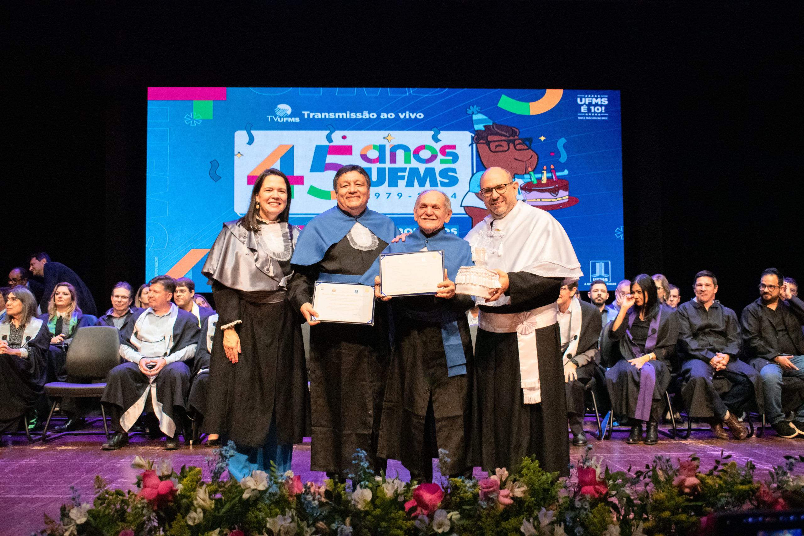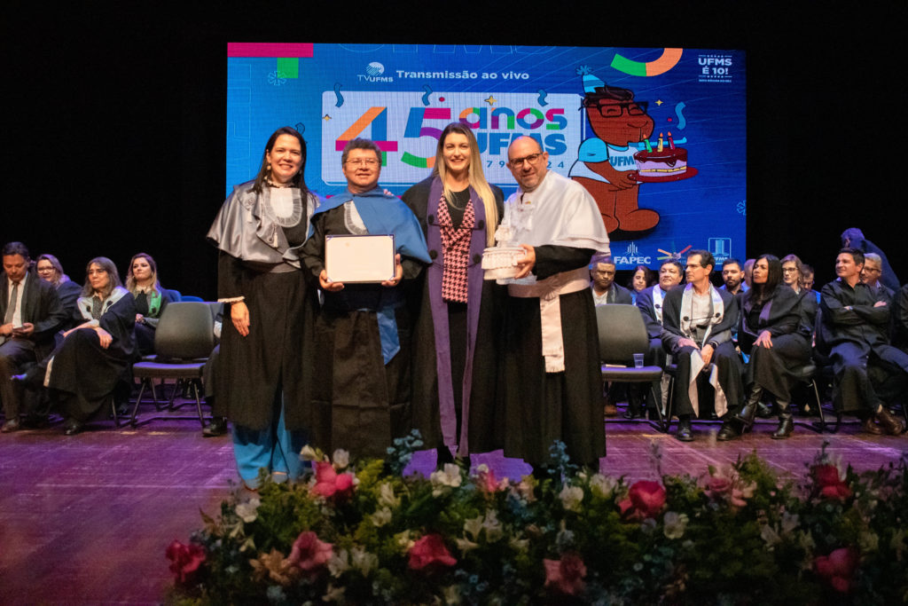 Em celebração aos 45 anos de Federal, o Teatro Glauce Rocha recebeu na manhã desta terça-feira, 2, a cerimônia com a entrega dos títulos honoríficos e de ordem de mérito àqueles que contribuíram e contribuem para a história de sucesso da Universidade. Autoridades, gestores e diretores das unidades, professores, técnicos-administrativos, estudantes, egressos e familiares estiveram presentes e cantaram parabéns para a UFMS.