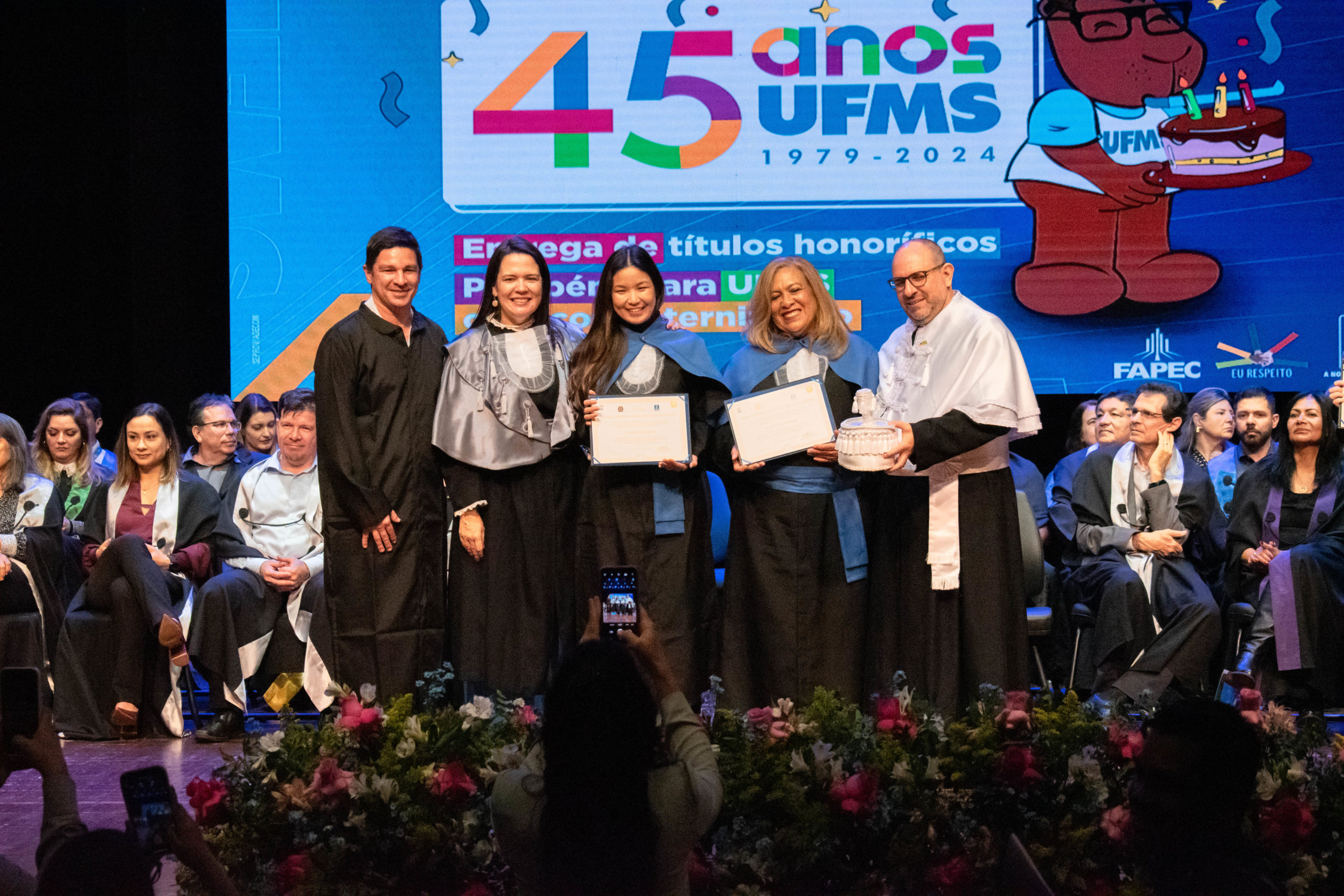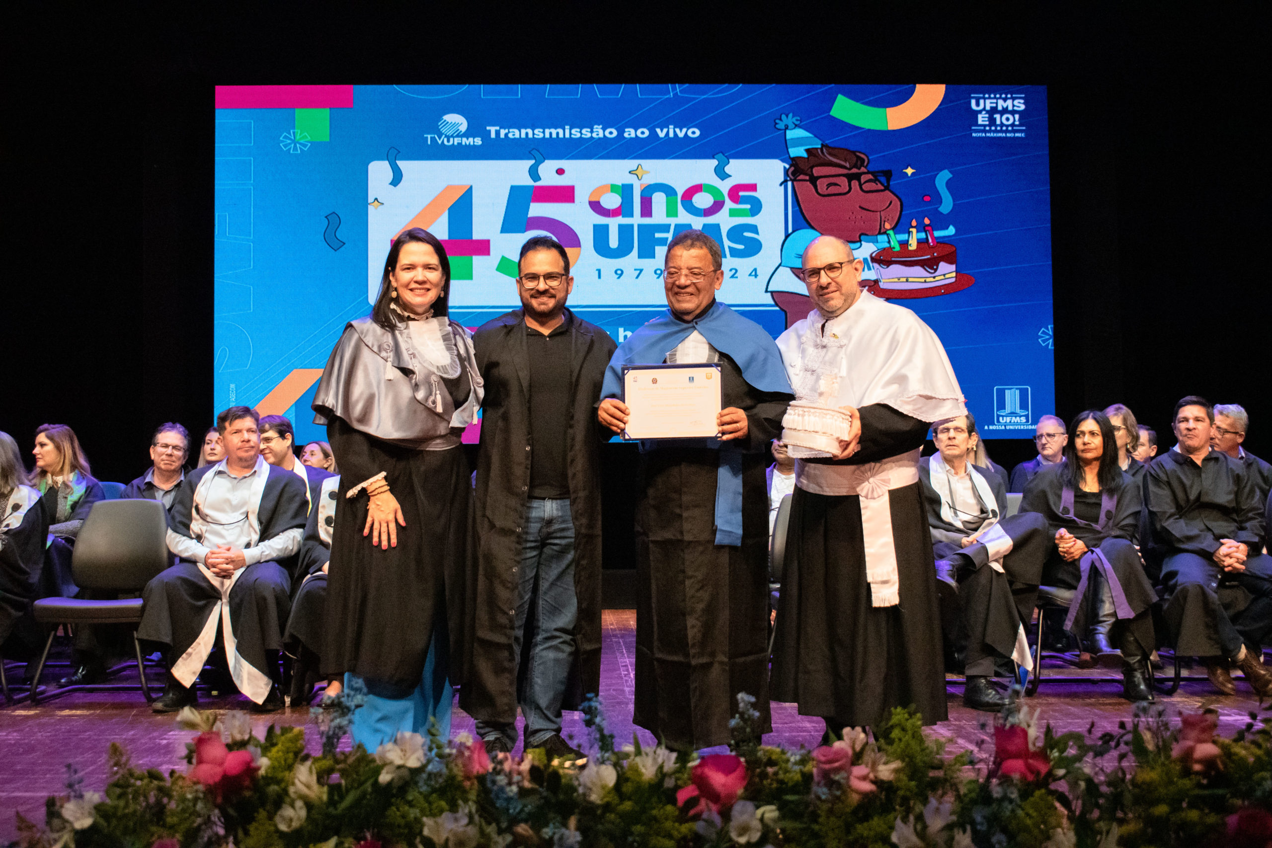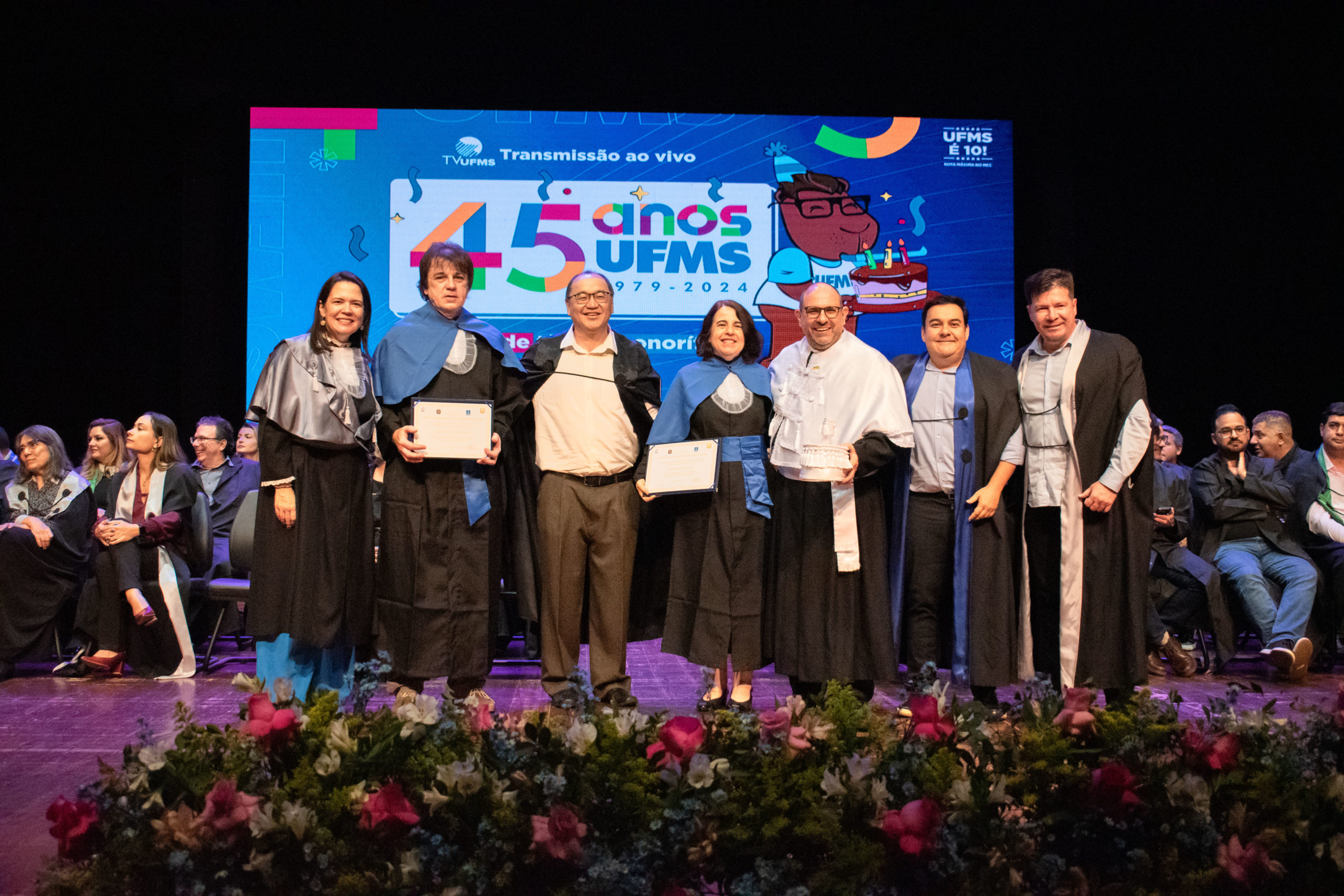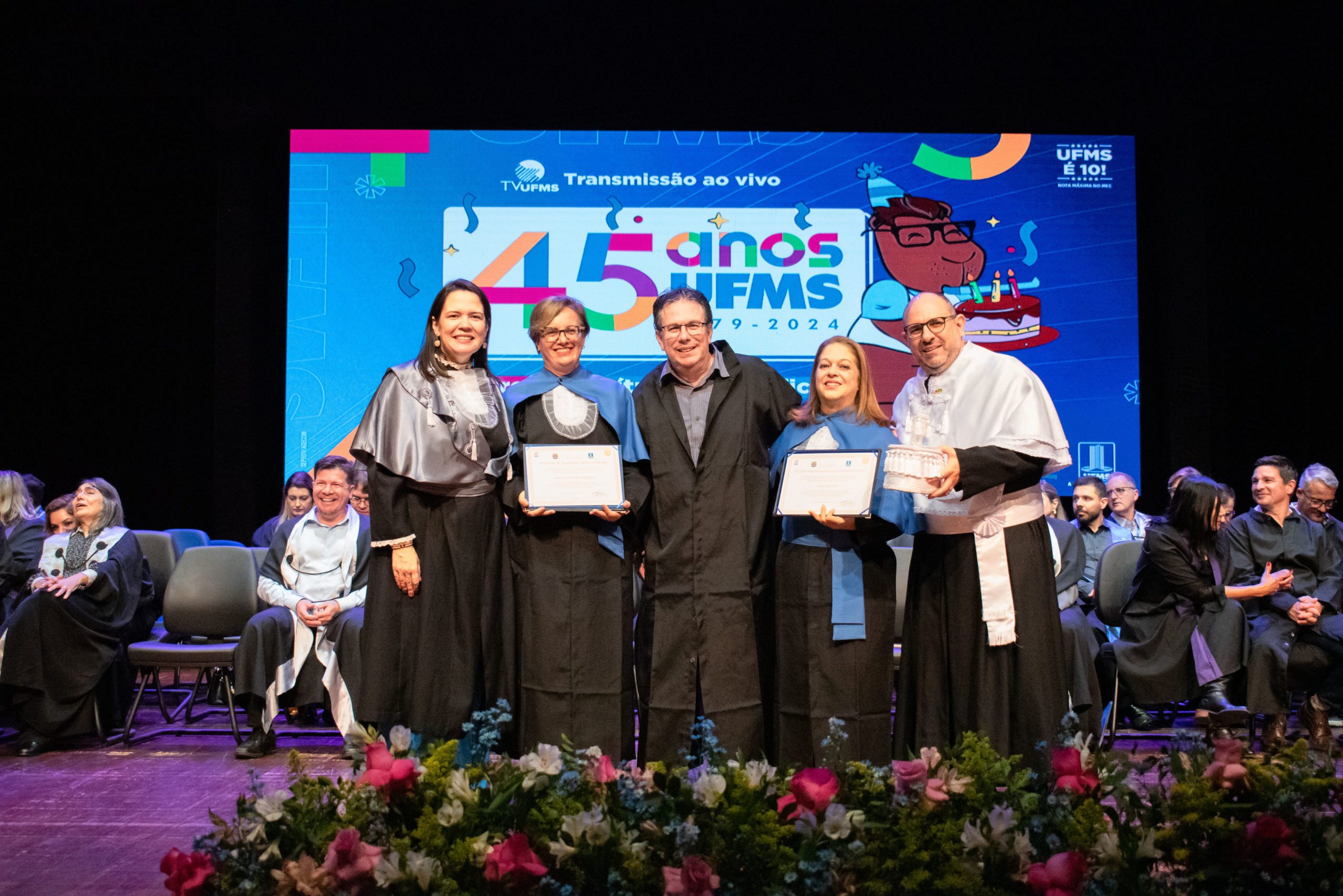 Em celebração aos 45 anos de Federal, o Teatro Glauce Rocha recebeu na manhã desta terça-feira, 2, a cerimônia com a entrega dos títulos honoríficos e de ordem de mérito àqueles que contribuíram e contribuem para a história de sucesso da Universidade. Autoridades, gestores e diretores das unidades, professores, técnicos-administrativos, estudantes, egressos e familiares estiveram presentes e cantaram parabéns para a UFMS.