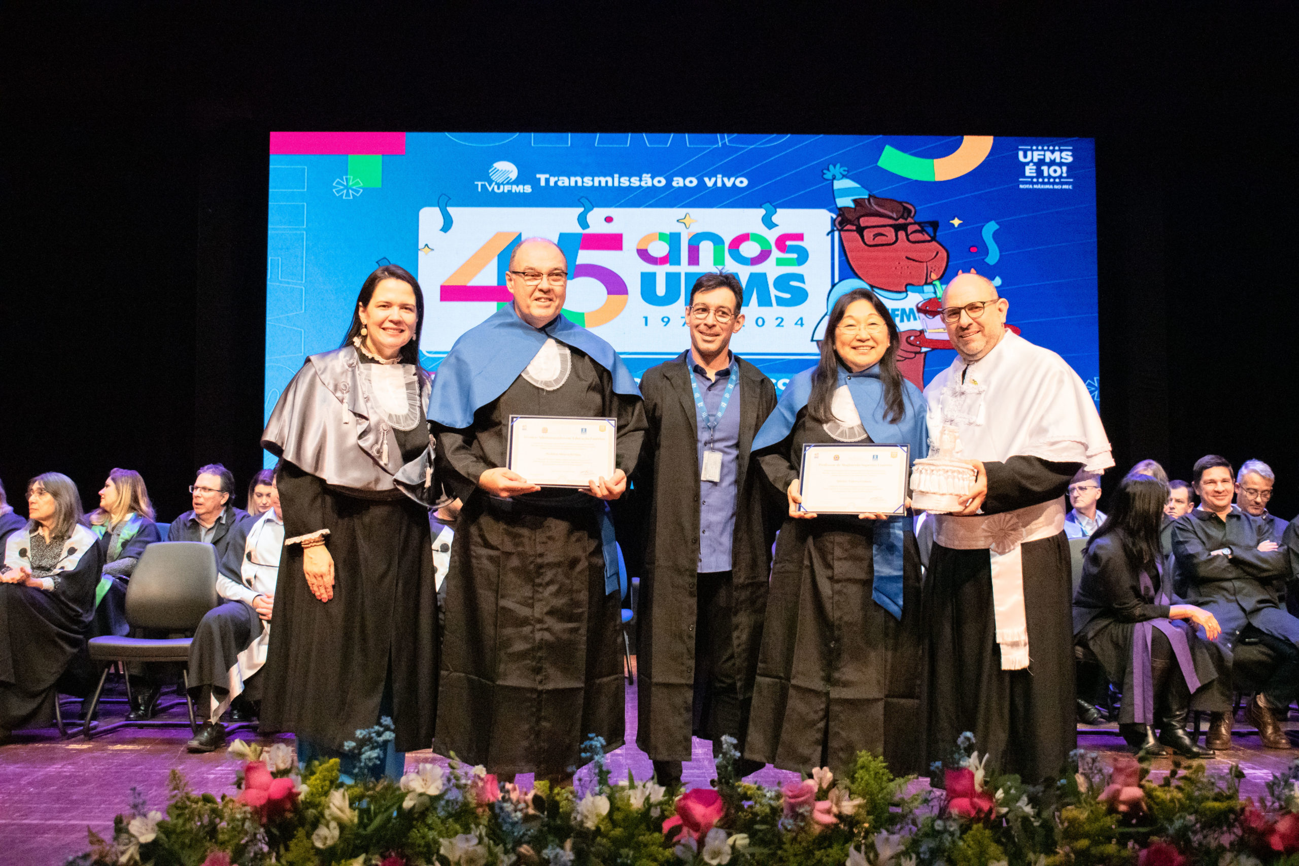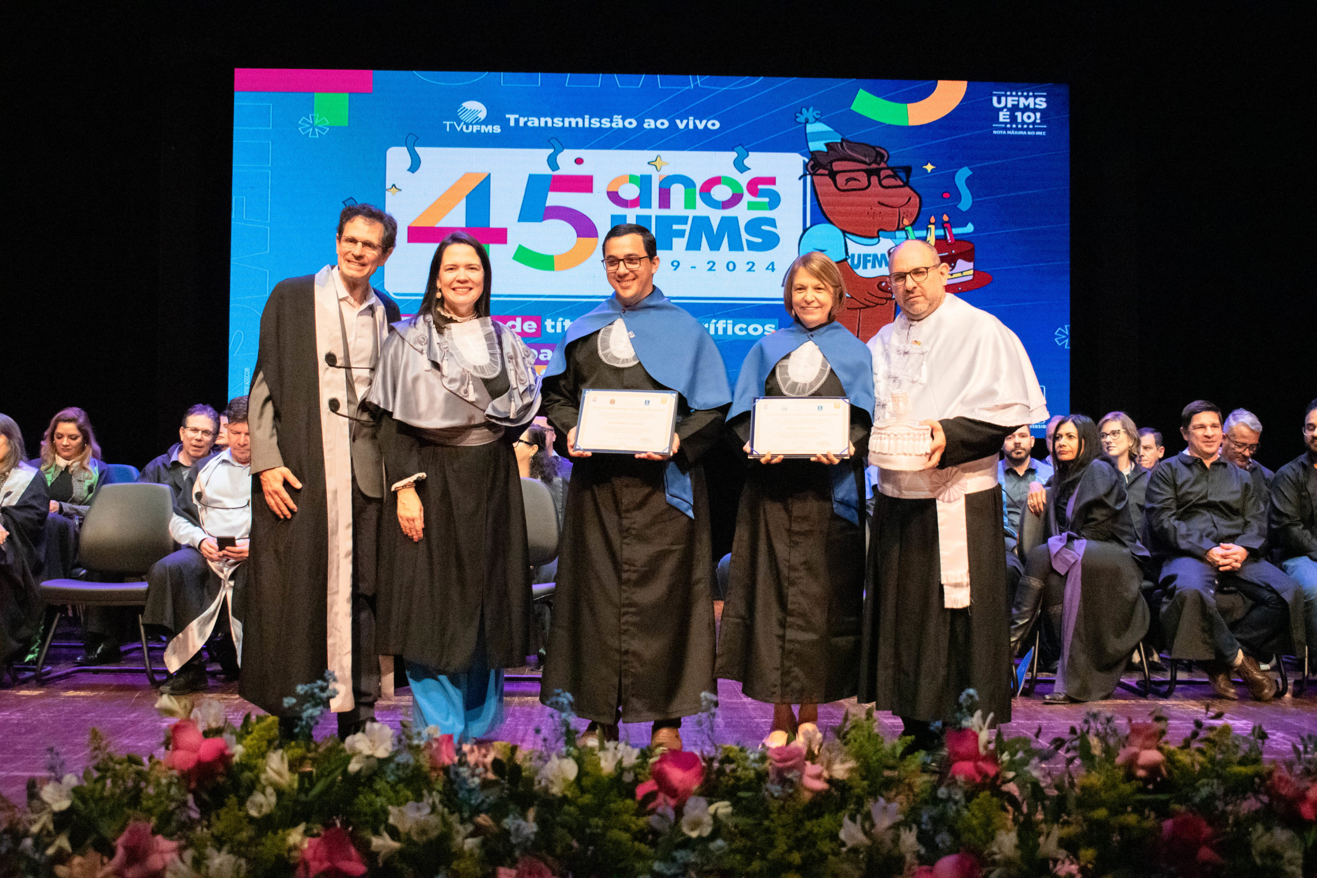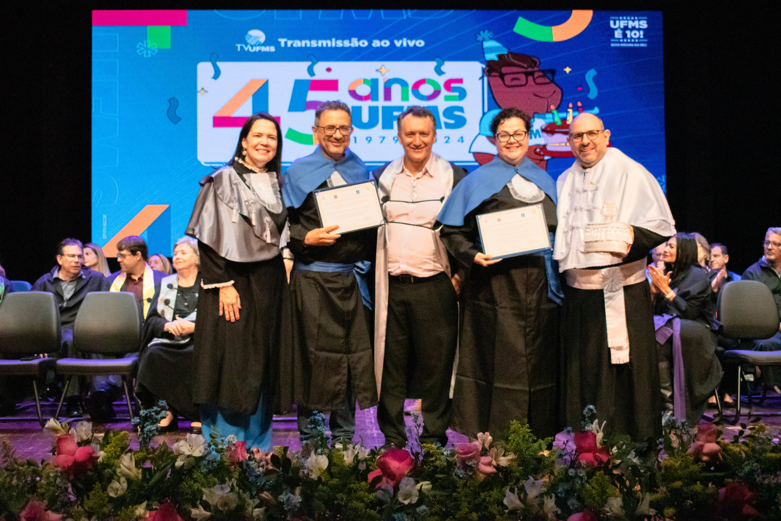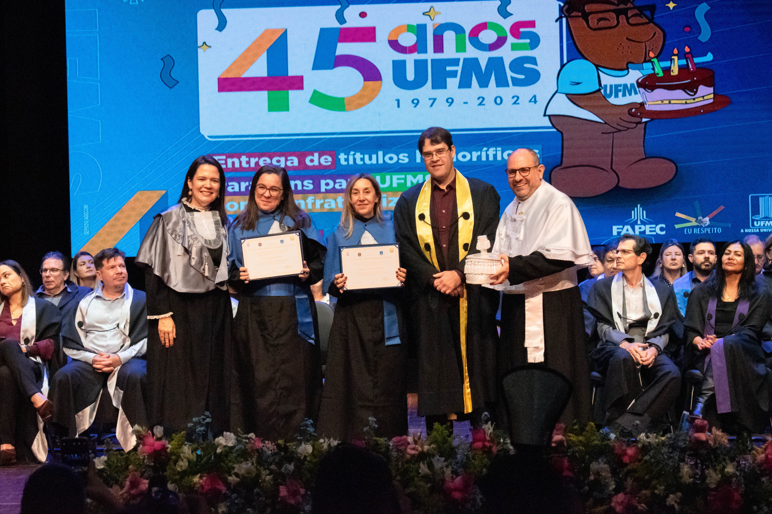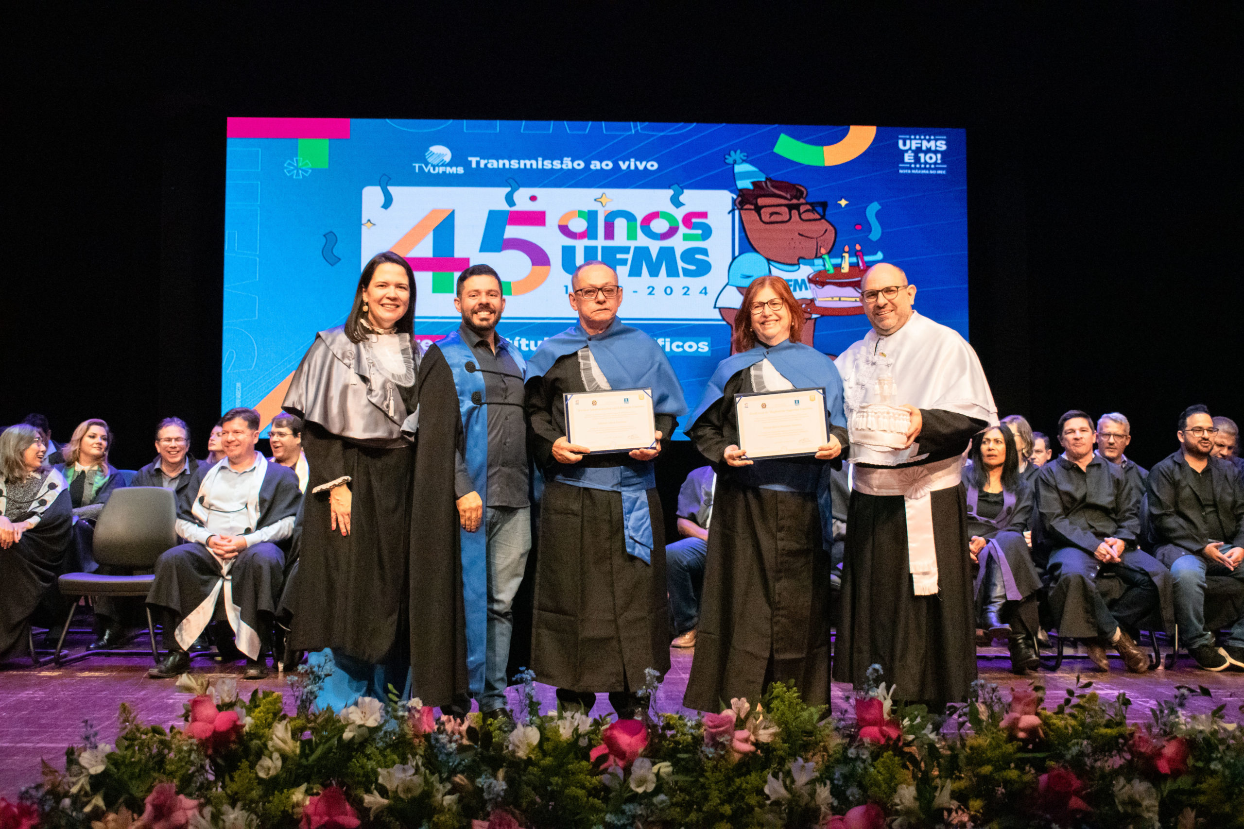 Em celebração aos 45 anos de Federal, o Teatro Glauce Rocha recebeu na manhã desta terça-feira, 2, a cerimônia com a entrega dos títulos honoríficos e de ordem de mérito àqueles que contribuíram e contribuem para a história de sucesso da Universidade. Autoridades, gestores e diretores das unidades, professores, técnicos-administrativos, estudantes, egressos e familiares estiveram presentes e cantaram parabéns para a UFMS.