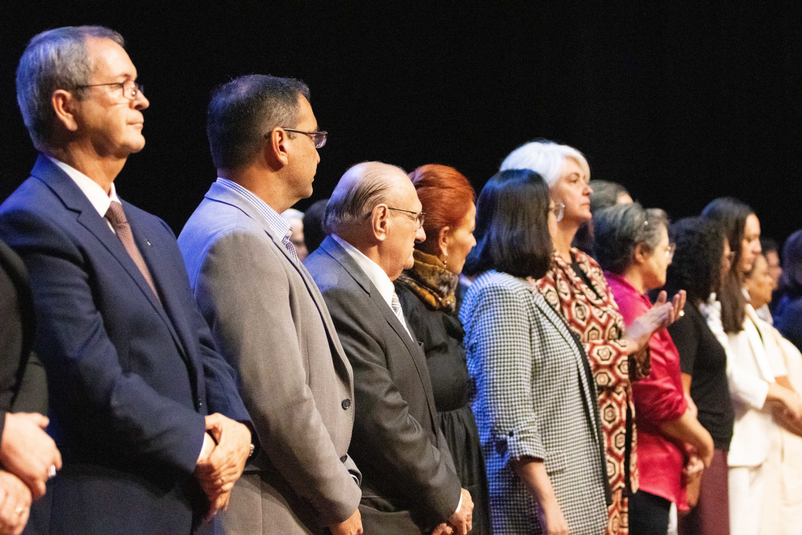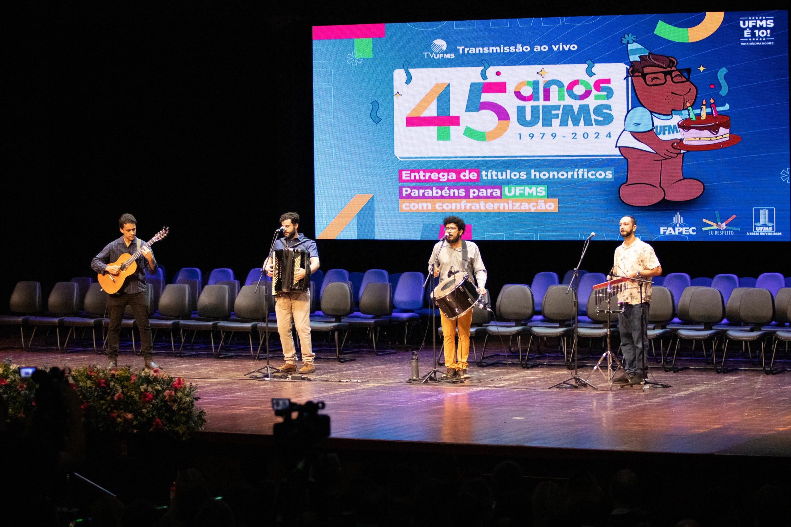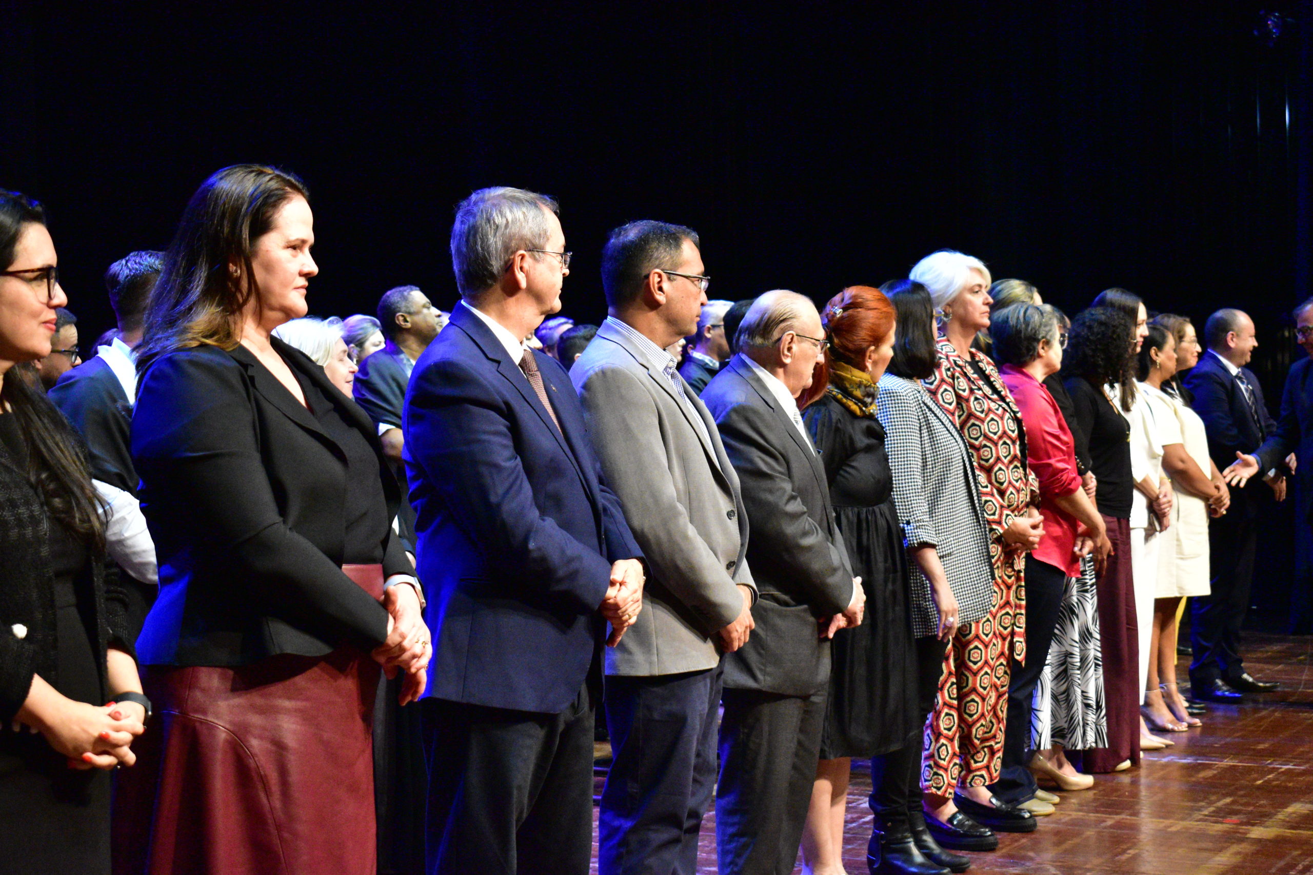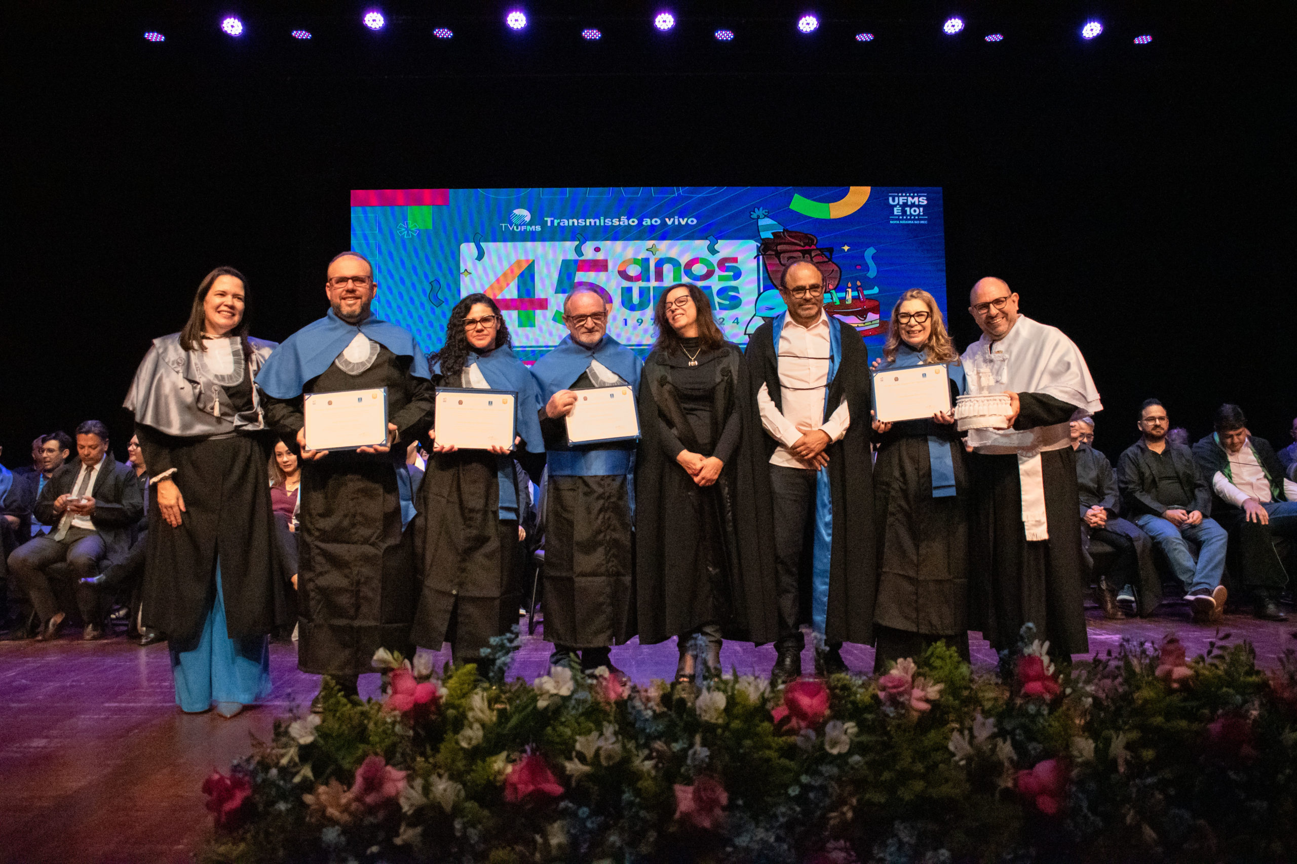 Em celebração aos 45 anos de Federal, o Teatro Glauce Rocha recebeu na manhã desta terça-feira, 2, a cerimônia com a entrega dos títulos honoríficos e de ordem de mérito àqueles que contribuíram e contribuem para a história de sucesso da Universidade. Autoridades, gestores e diretores das unidades, professores, técnicos-administrativos, estudantes, egressos e familiares estiveram presentes e cantaram parabéns para a UFMS.