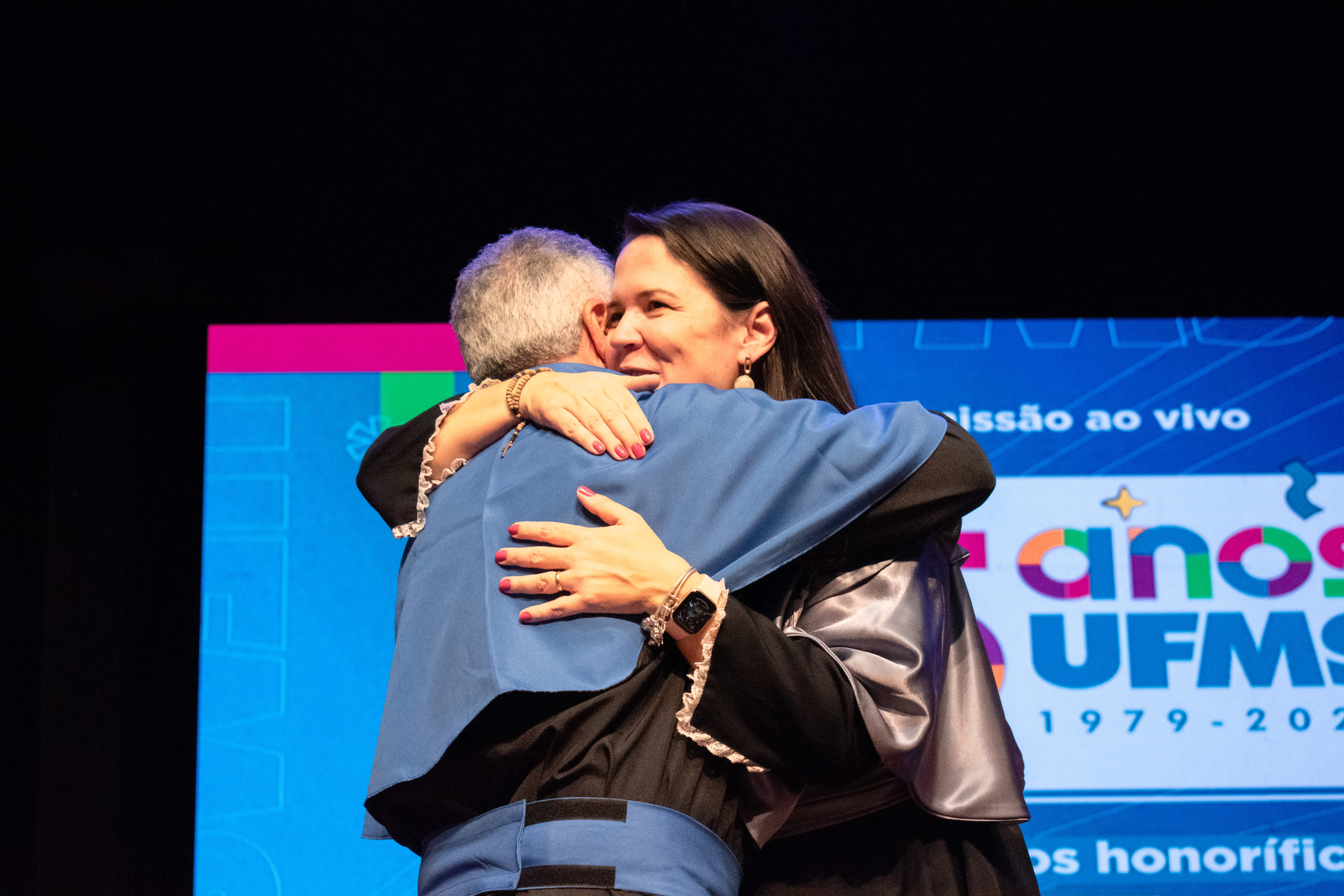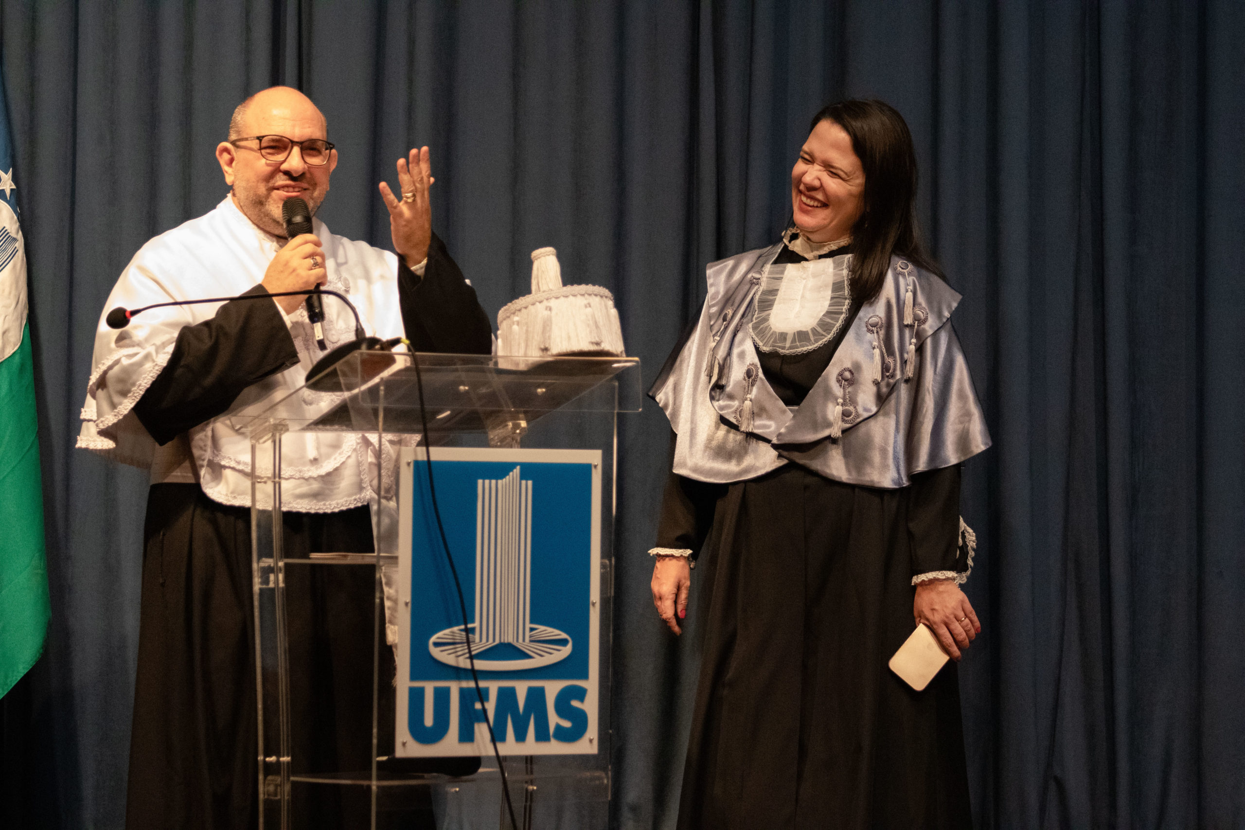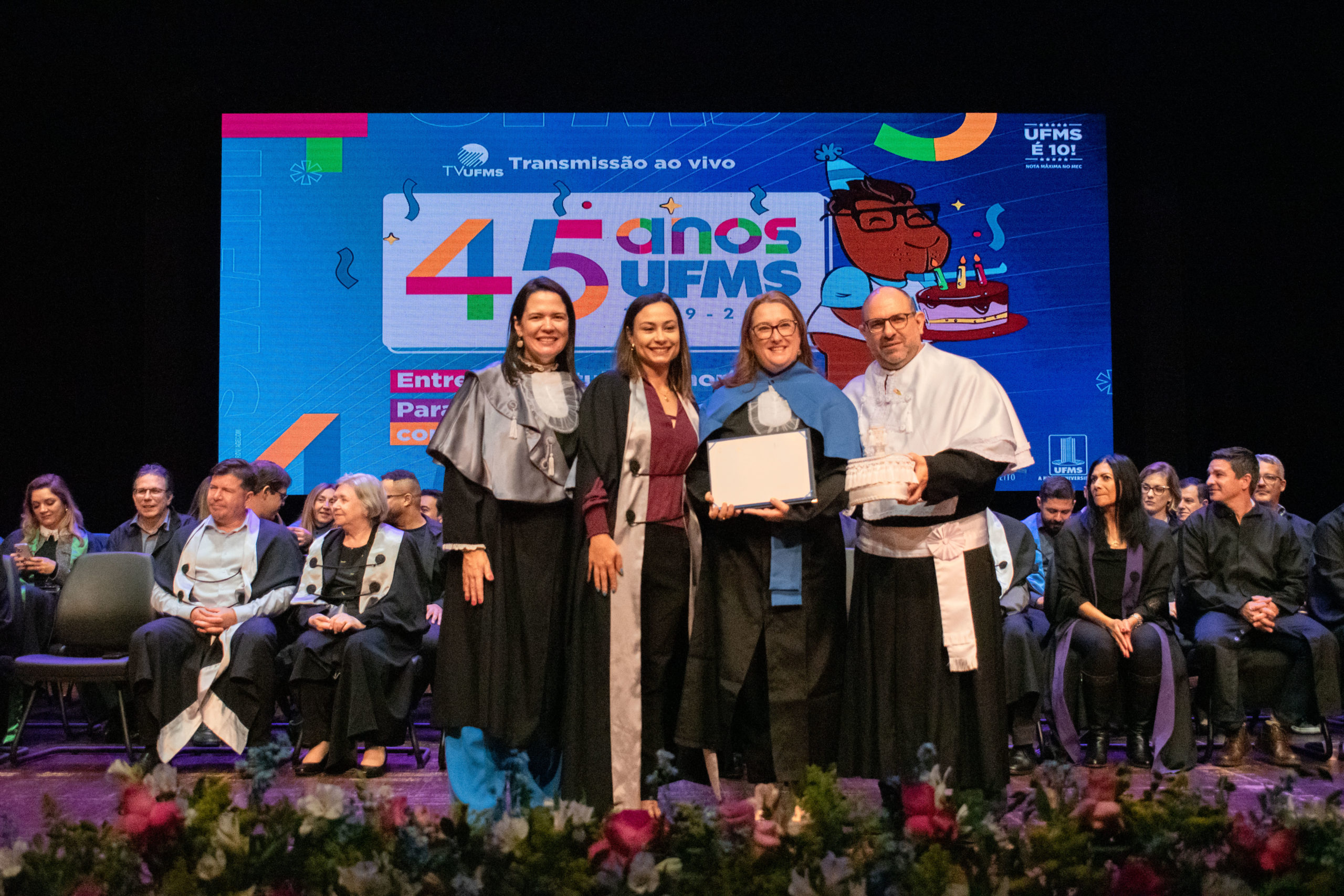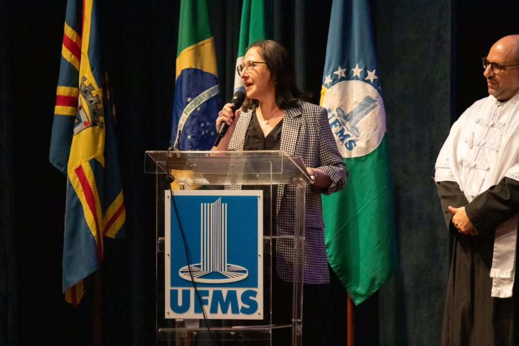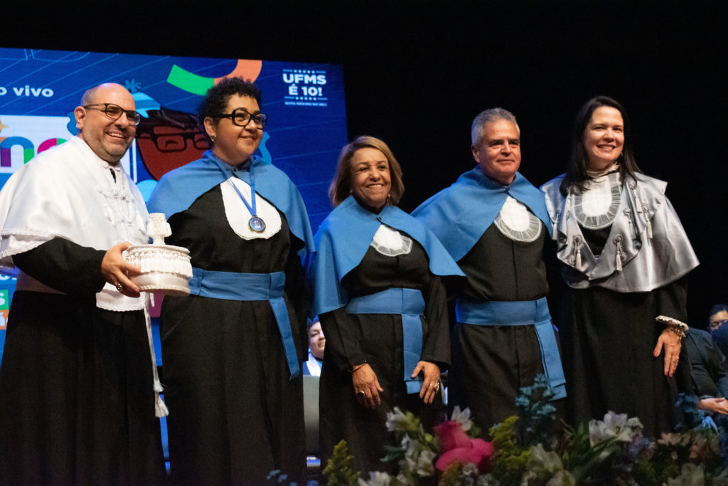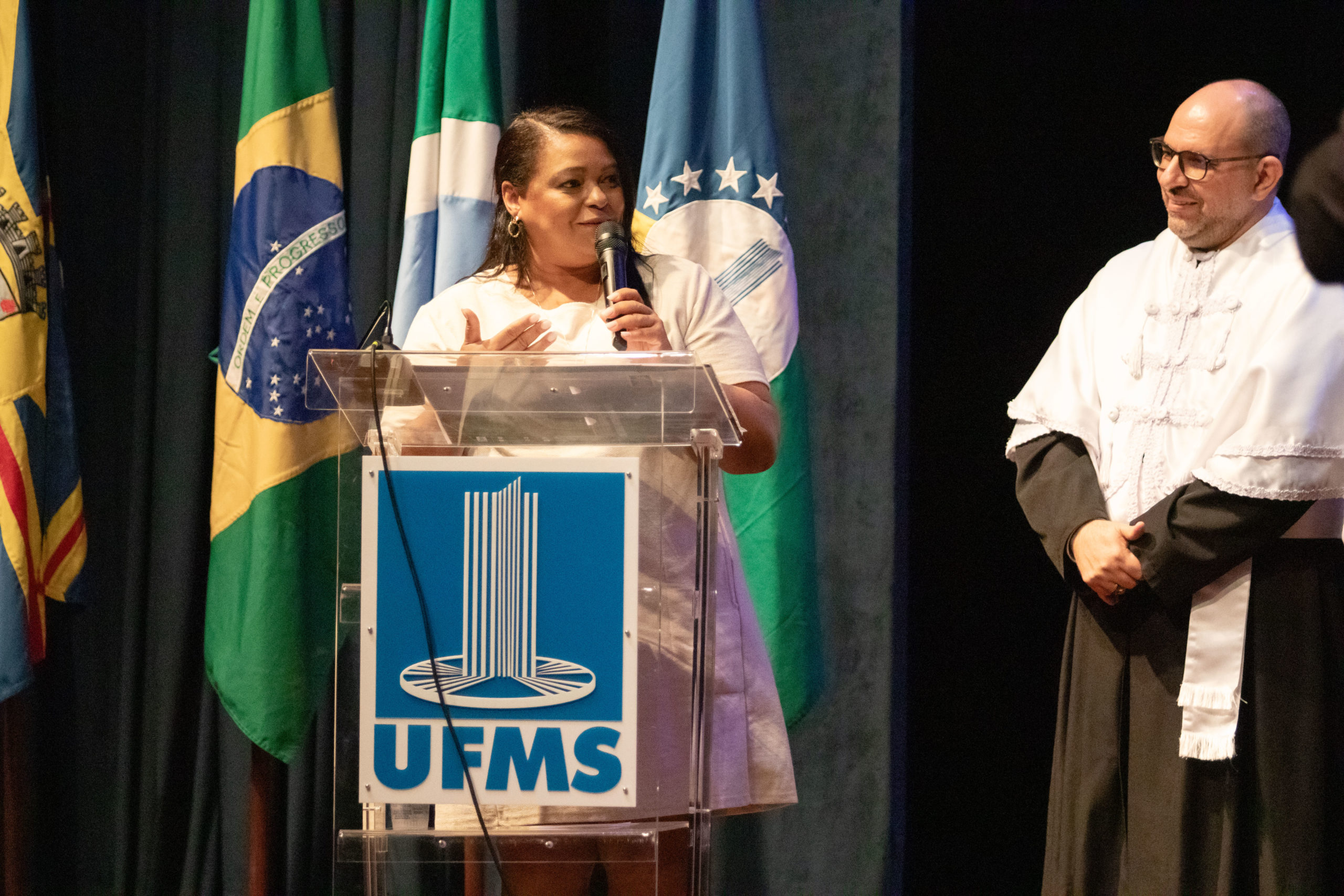 “É uma alegria, honra, satisfação, felicidade em ter esse momento de fala para homenagear nossos professores e técnicos. A entrega desses títulos só se tornou realidade a partir de 2021, apesar de estar em nosso estatuto há muito tempo. Essa iniciativa enobrece a nossa Instituição e contribui para que ela alcance mais sucesso, pois é por meio dos nossos servidores que a UFMS conseguiu nota 10 e se transforma cada vez mais em uma Instituição maior em números e qualidade”, disse a pró-reitora de Gestão de Pessoas e presidente da Comissão de Análise dos Títulos Honoríficos, Gislene Walter da Silva.