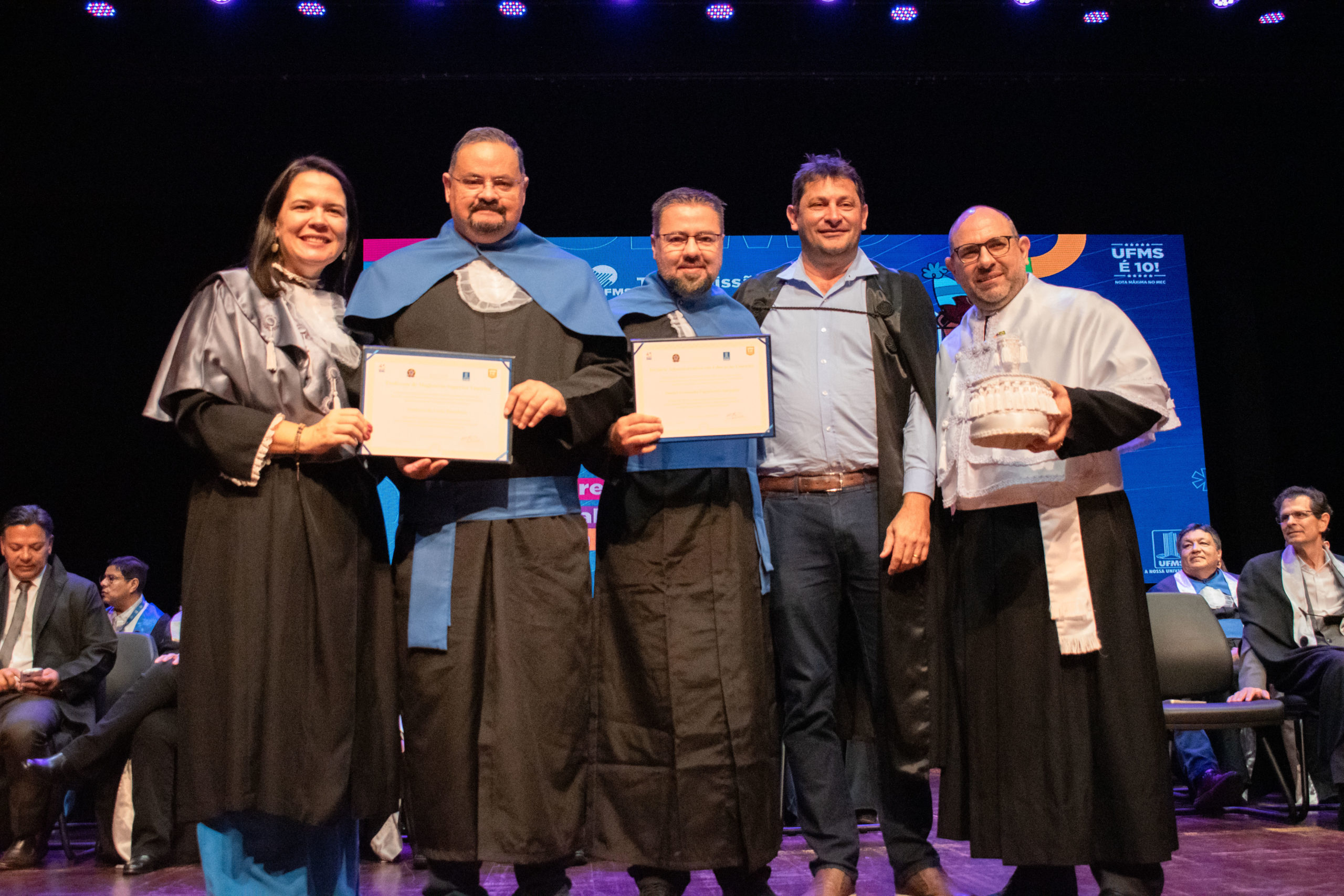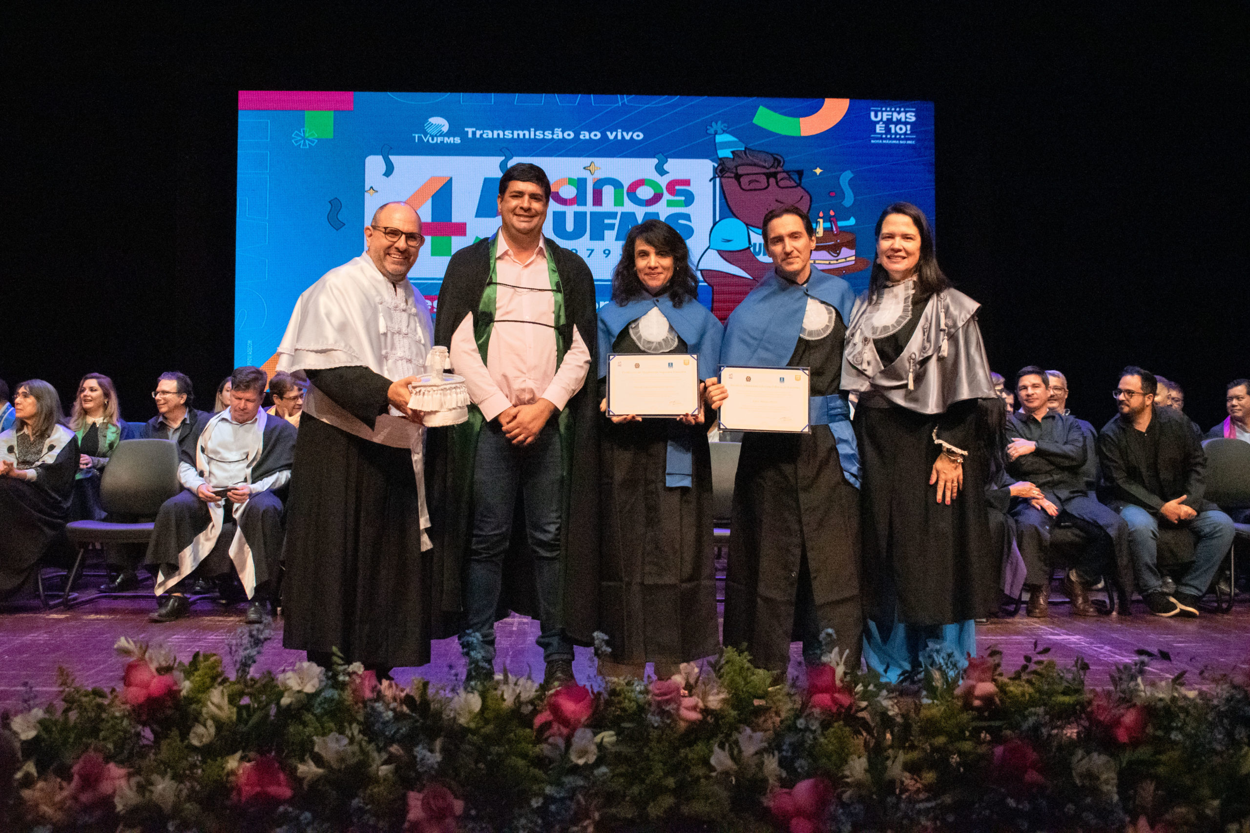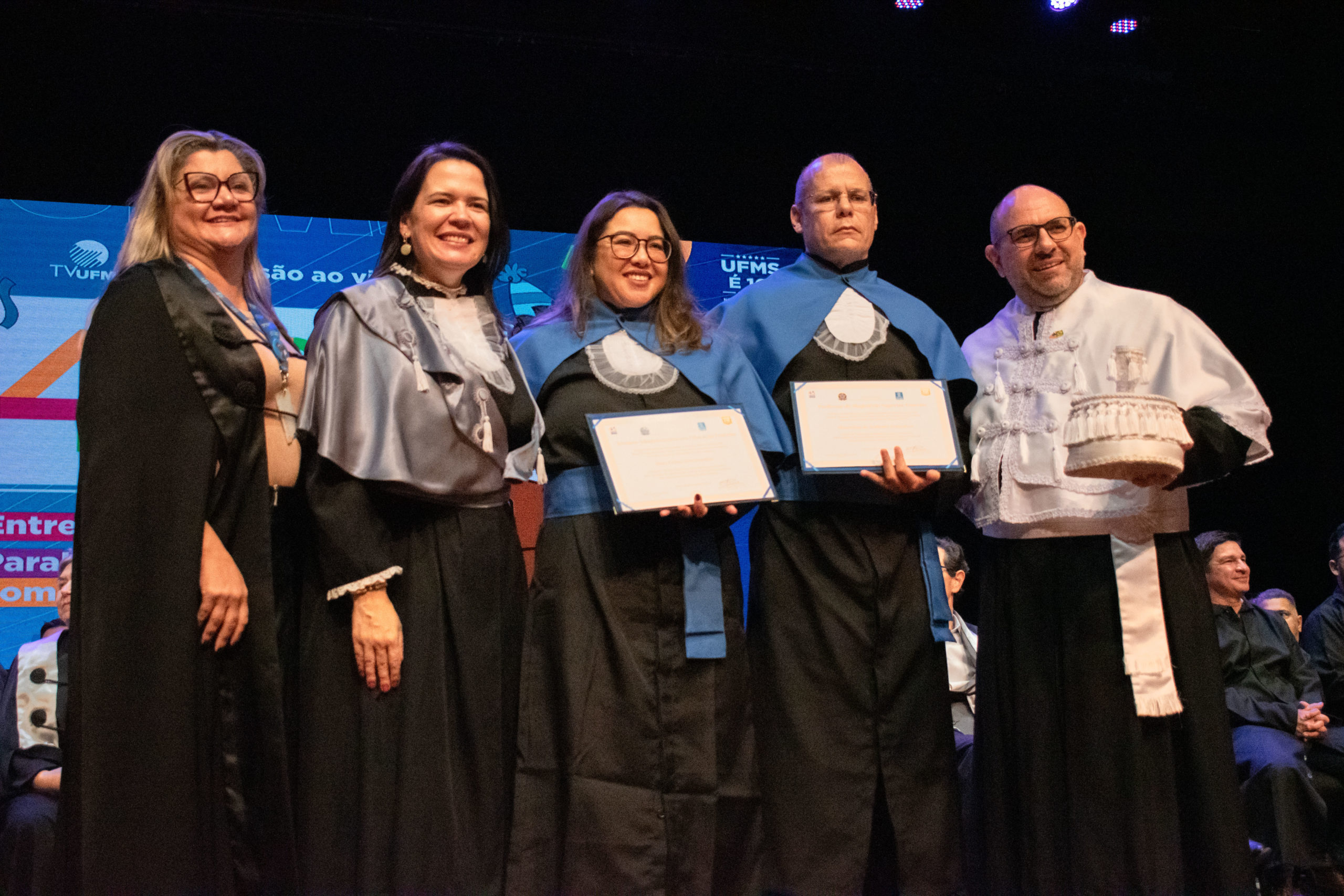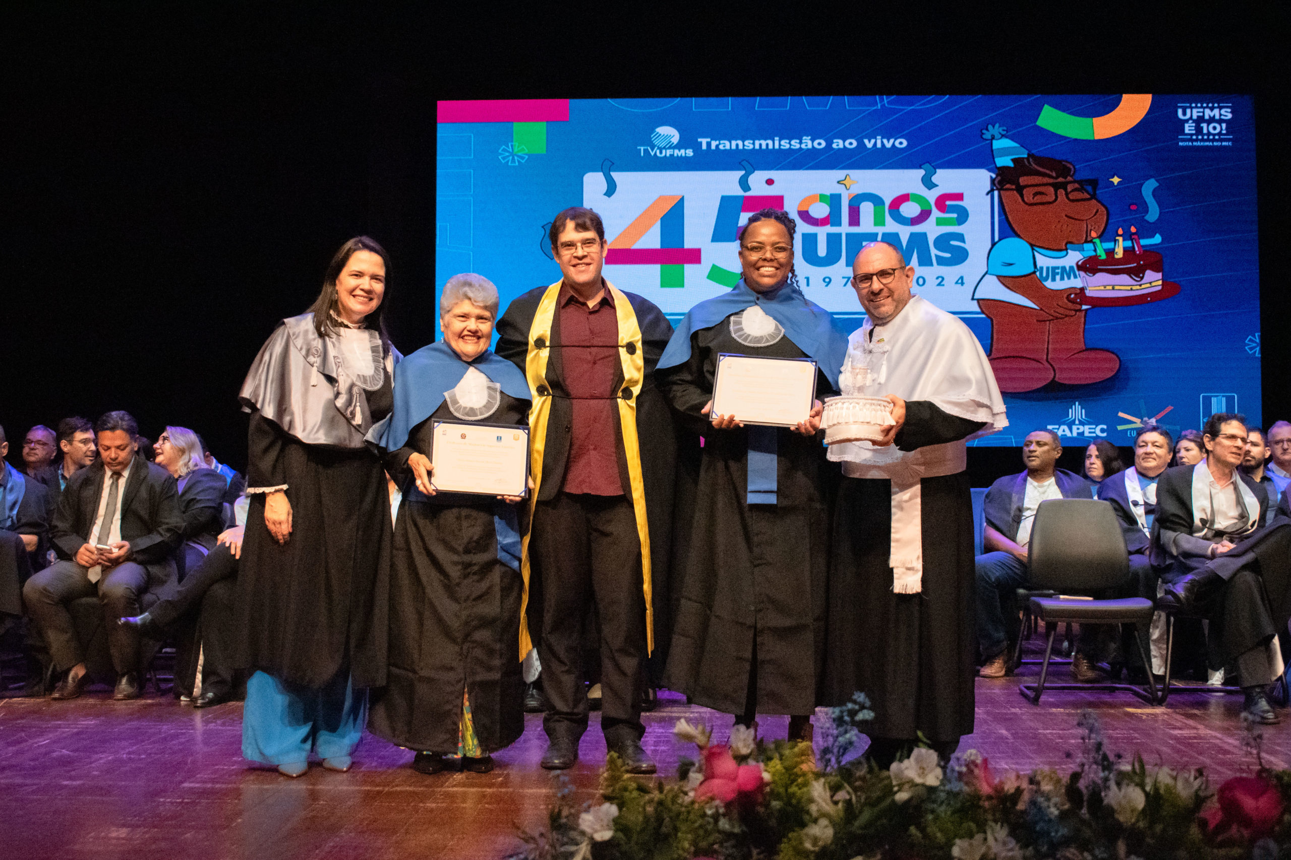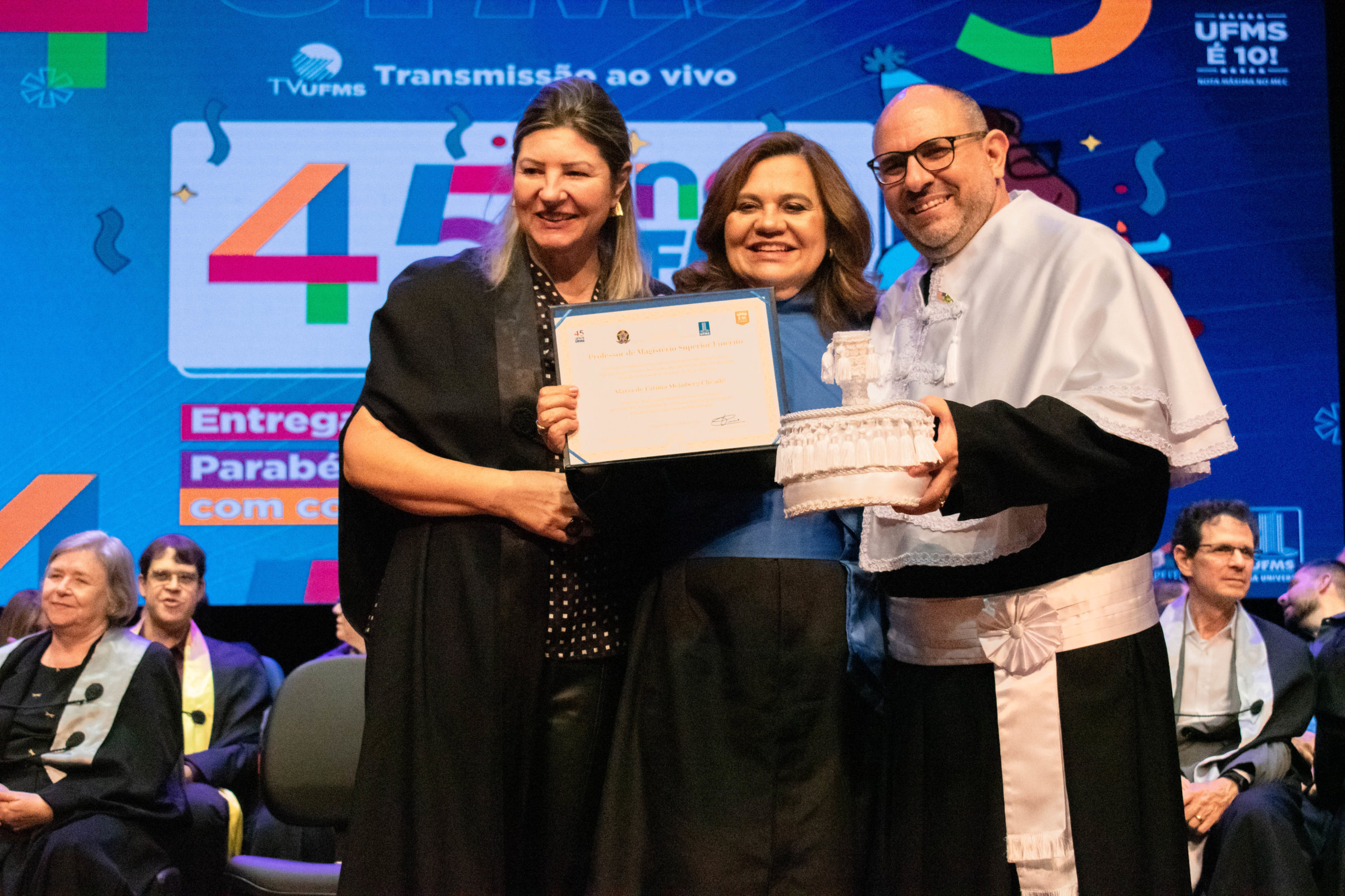 “É uma alegria, honra, satisfação, felicidade em ter esse momento de fala para homenagear nossos professores e técnicos. A entrega desses títulos só se tornou realidade a partir de 2021, apesar de estar em nosso estatuto há muito tempo. Essa iniciativa enobrece a nossa Instituição e contribui para que ela alcance mais sucesso, pois é por meio dos nossos servidores que a UFMS conseguiu nota 10 e se transforma cada vez mais em uma Instituição maior em números e qualidade”, disse a pró-reitora de Gestão de Pessoas e presidente da Comissão de Análise dos Títulos Honoríficos, Gislene Walter da Silva.