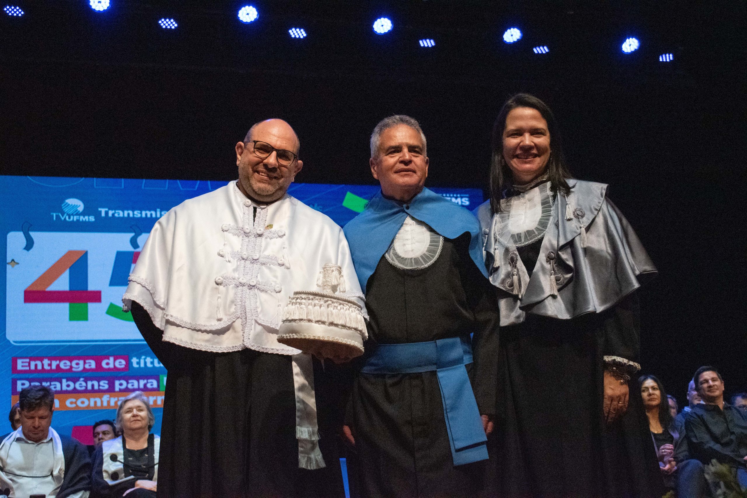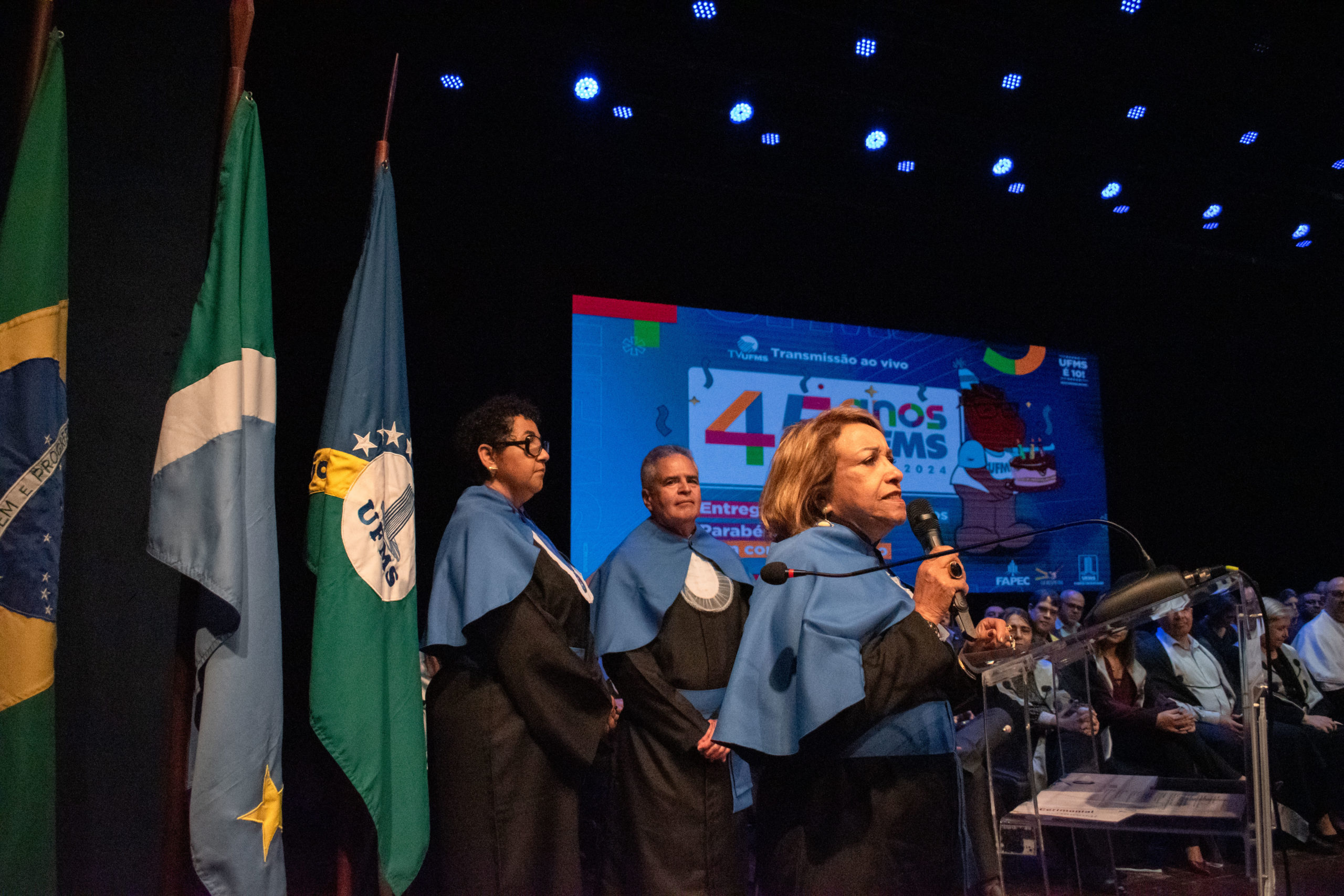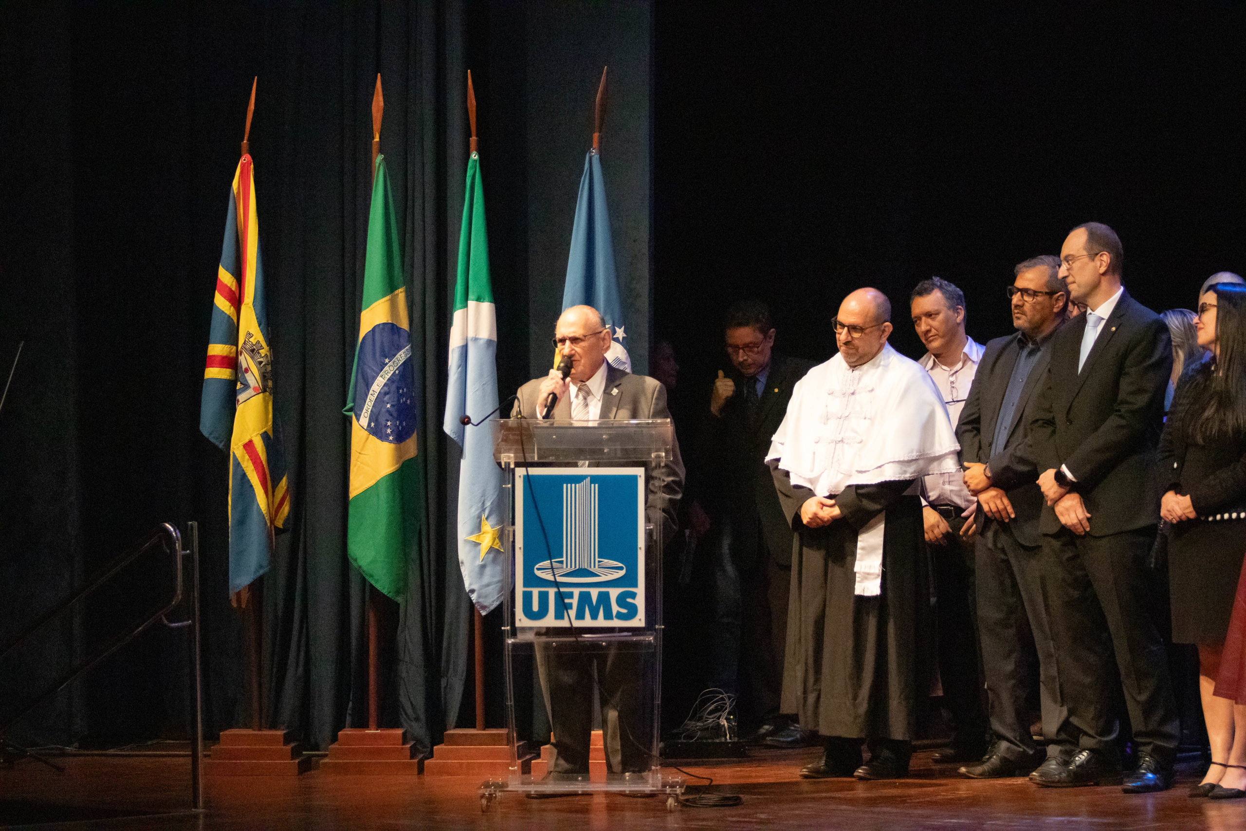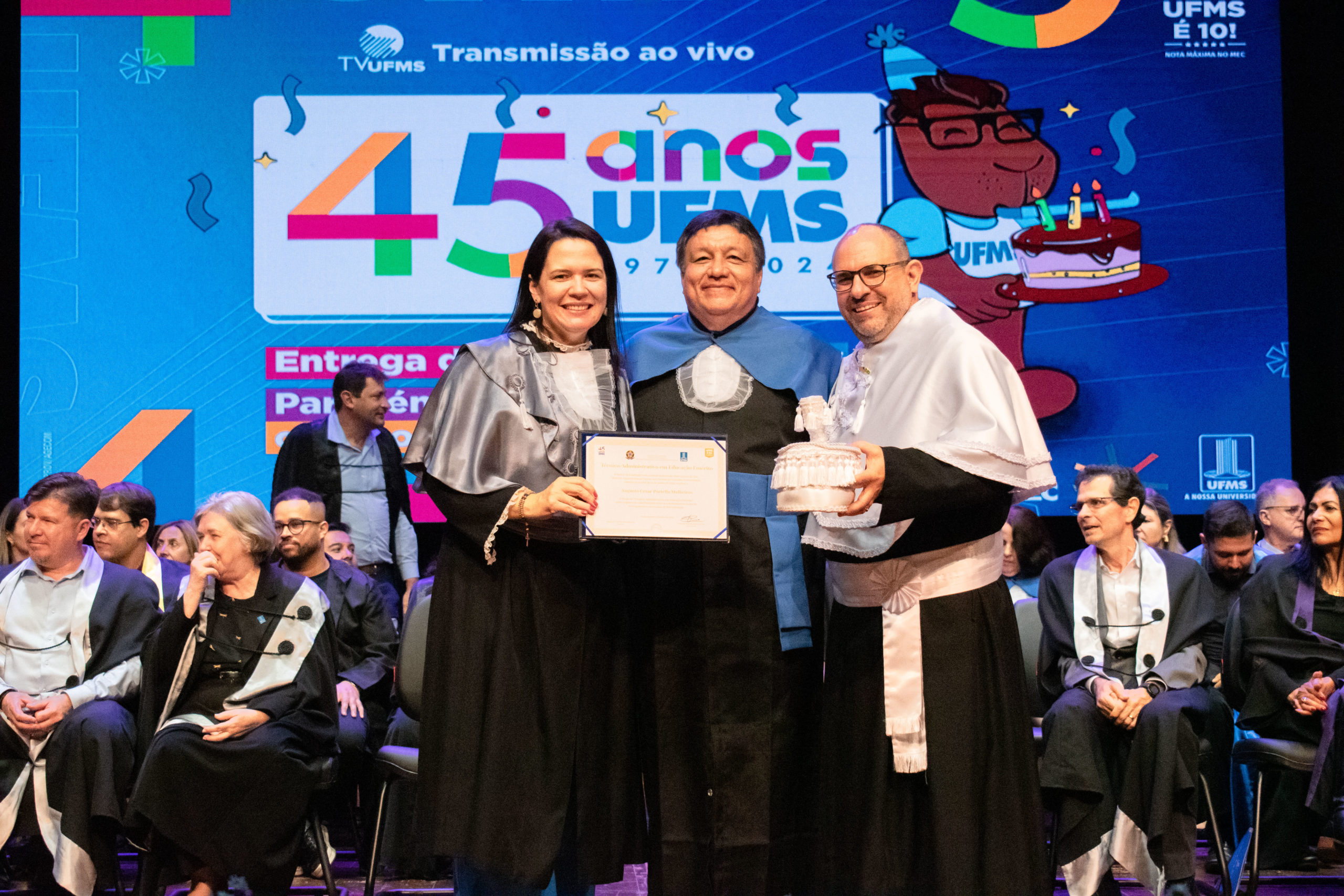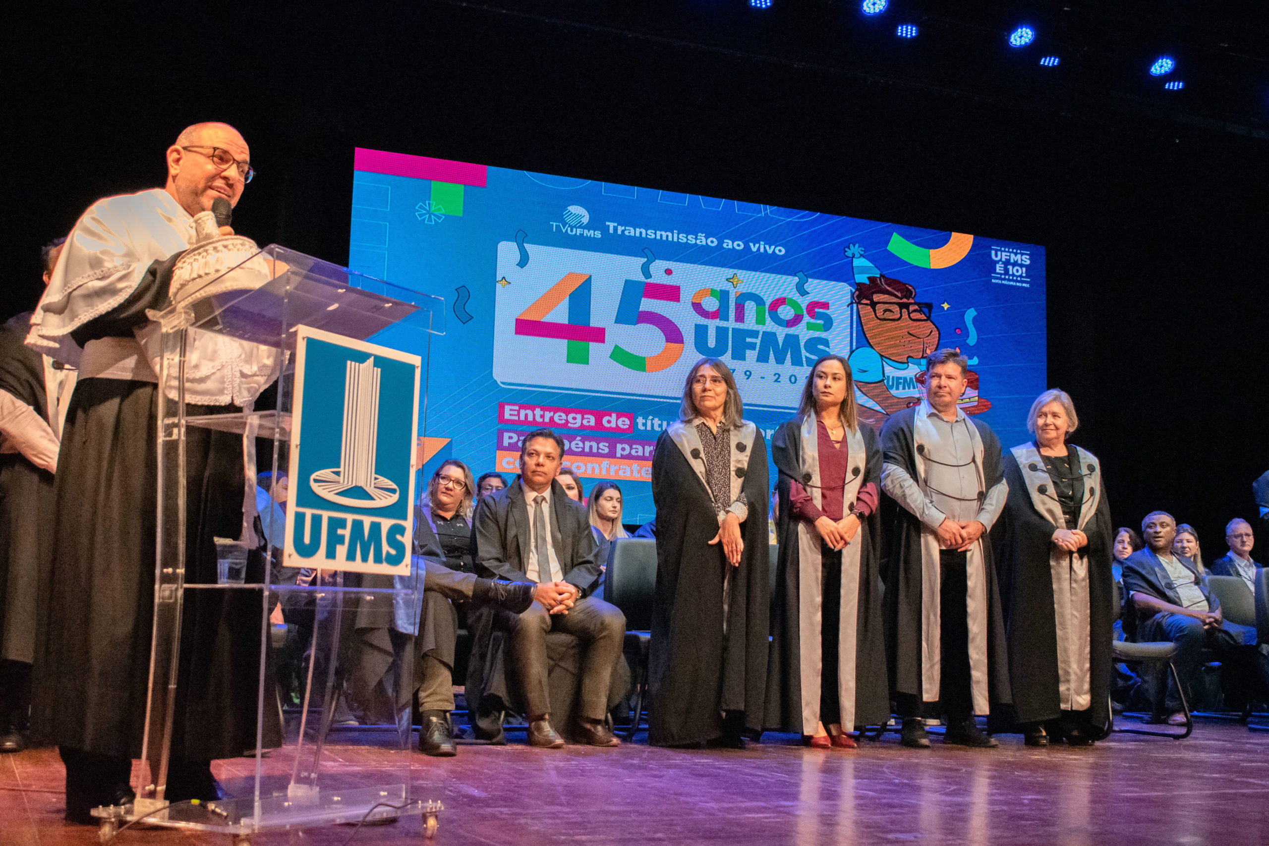 Durante a solenidade, diversas autoridades reforçaram a importância da UFMS para o desenvolvimento do Estado e do País. “É uma honra muito grande representar o Conselho de Reitores de Instituições de Ensino Superior de Mato Grosso do Sul e dizer pra vocês que vocês nos representam e são nossa referência no ensino, pesquisa, extensão, inclusão e internacionalização. Que bom comemorar os 45 anos da UFMS. Que venham 90, 150, 200 anos. Viva a UFMS, viva a educação de MS. Parabéns!”, disse o reitor da Universidade Estadual de Mato Grosso do Sul, Laércio de Carvalho.
