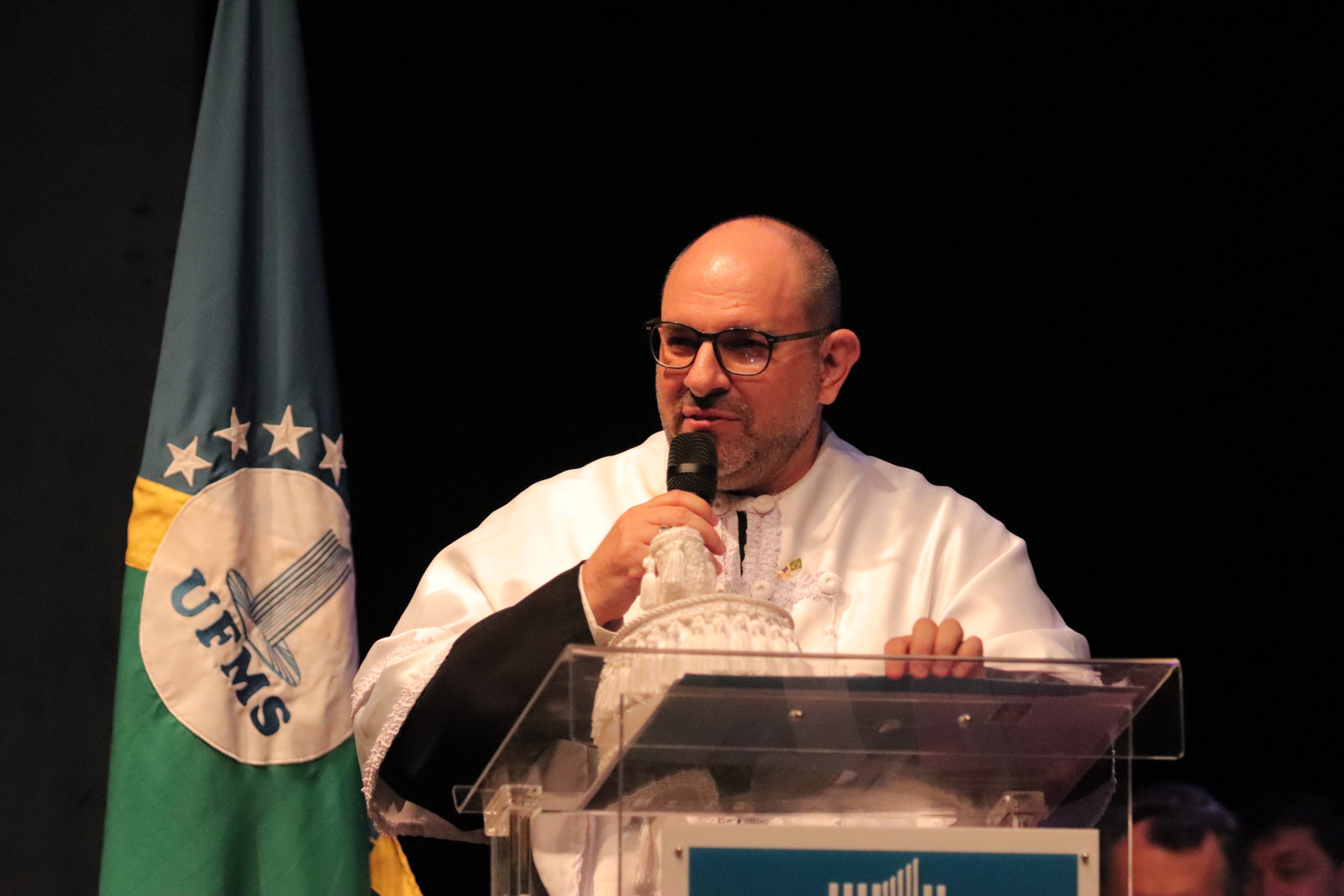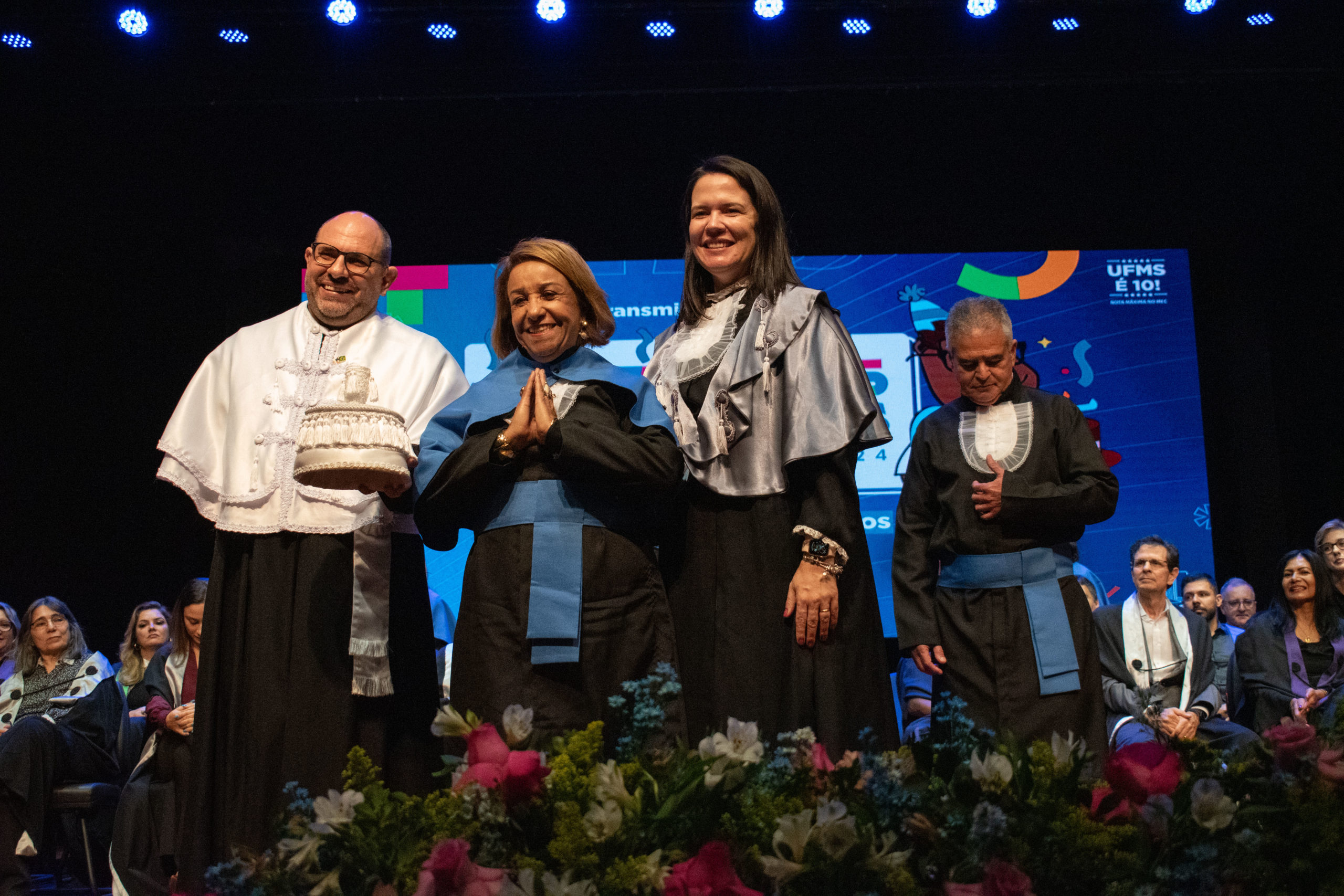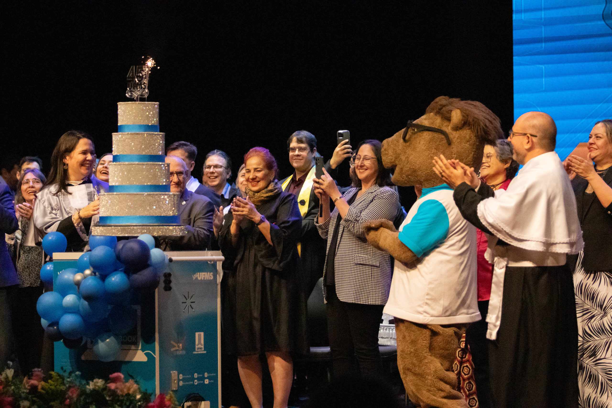 O reitor Marcelo Turine agradeceu o legado dos reitores que o antecederam, a dedicação dos diretores das 25 unidades da Administração Setorial e a parceria do Sindicato dos Trabalhadores das Instituições Federais de Ensino do Estado de Mato Grosso do Sul, a Associação dos Docentes da Universidade Federal de Mato Grosso do Sul e o Diretório Central dos Estudantes. “Agradeço a presença dos servidores e estudantes, amigos, amigas, de Mato Grosso do Sul e do Brasil nessa semana de festividades. Na verdade, celebraremos durante o ano todo. Reconhecer pessoas, nossos líderes é a base de sucesso da nossa Universidade. Com certeza teremos uma linda cerimônia, que foi organizada em vários momentos”, afirmou. “Em 1979, tínhamos três mil alunos, hoje são 40 mil. Agradeço a todos, em especial por essa transformação que ocorreu graças à equipe, que junto ao Conselho Universitário, propõe políticas públicas para transformar vidas. Sucesso, vida longa a UFMS! Vida longa a ciência de Mato Grosso do Sul e do Brasil”, celebrou.