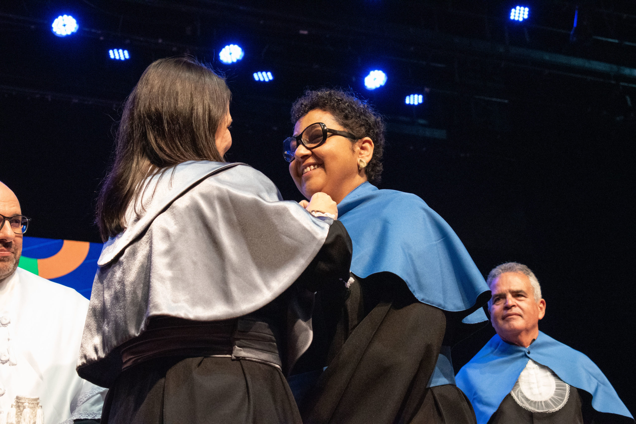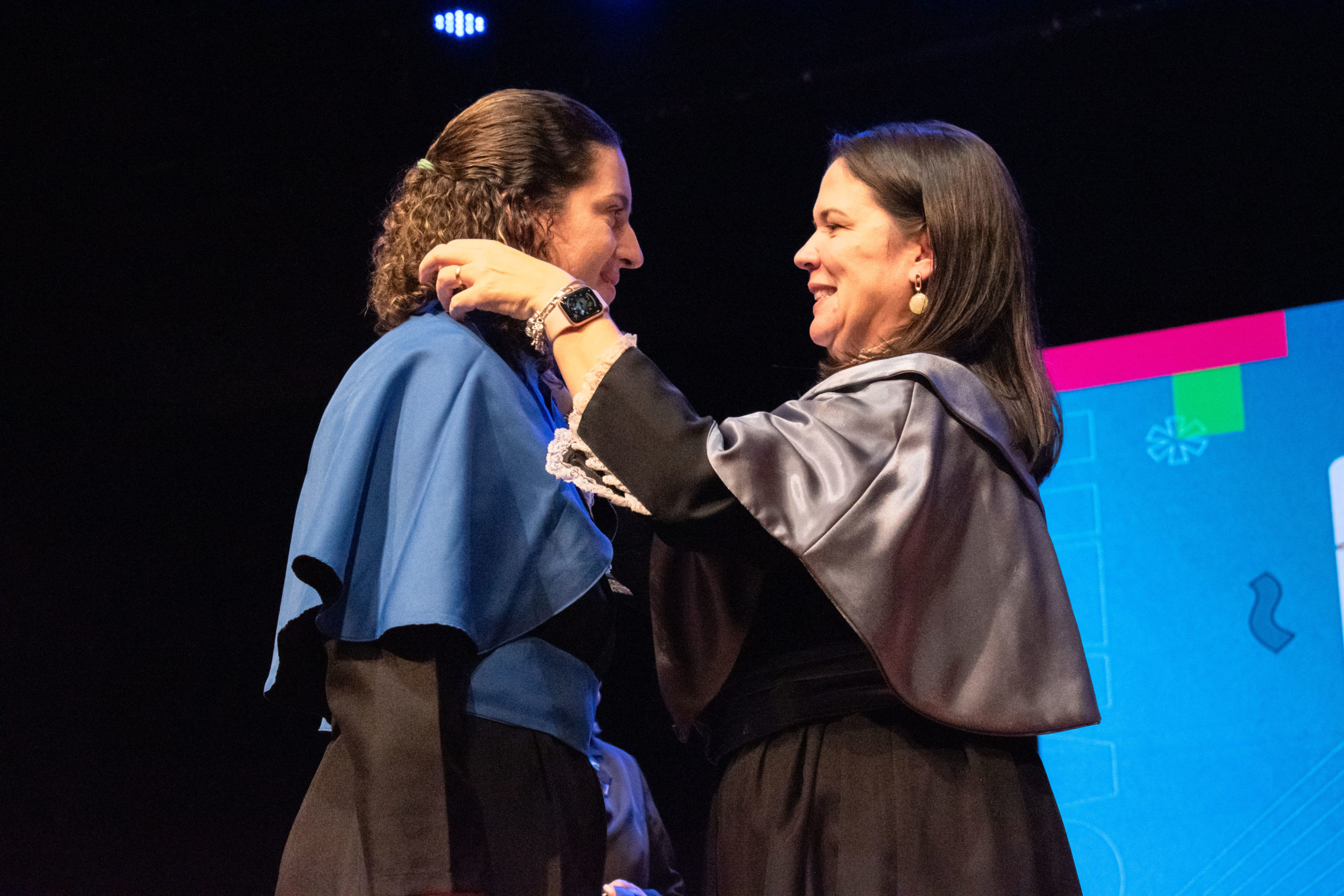 A egressa Ivani Marques da Costa Grance, que fundou a startup República das Arteiras incubada na Pantanal Incubadora Mista de Empresas da UFMS, recebeu a homenagem em nome de todos os profissionais formados pela Instituição. “Agradeço pela oportunidade de estar aqui novamente nesse local que ocupei, há oito anos, como oradora da turma de Ciências Sociais de 2012. Pela primeira vez, a costureira havia subido no púlpito para falar.