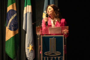 Além da gratidão e reconhecimento aos homenageados, a chefe de gabinete da Advocacia-Geral da União (AGU), Leila de Morais, ministrou a conferência Governança Pública e o papel da AGU no desenvolvimento do Brasil, representando o ministro Jorge Messias. “A UFMS é uma Instituição histórica que se organizou e se desenvolveu no próprio processo de desenvolvimento do Estado e se expandiu não apenas pelos números, mas pela qualidade dos trabalhos acadêmicos e científicos em áreas estratégicas como energia limpa, agronegócio e ambiental, para citar algumas. Trago o forte abraço do ministro a toda a comunidade acadêmica e todas as famílias de Mato Grosso do Sul”, relata.