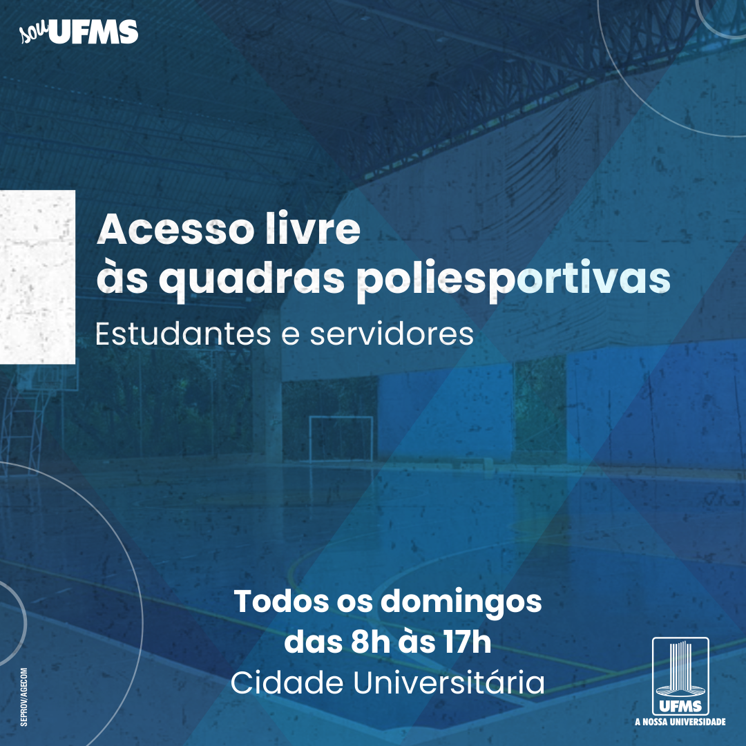 A partir do dia 19 de junho, as quadras poliesportivas da Cidade Universitária estarão liberadas para uso livre apenas para estudantes e servidores da UFMS, aos domingos, das 8h às 17h. Os interessados poderão usufruir do local que estará sob supervisão de um funcionário da Universidade e à disposição para atendimento da comunidade acadêmica.