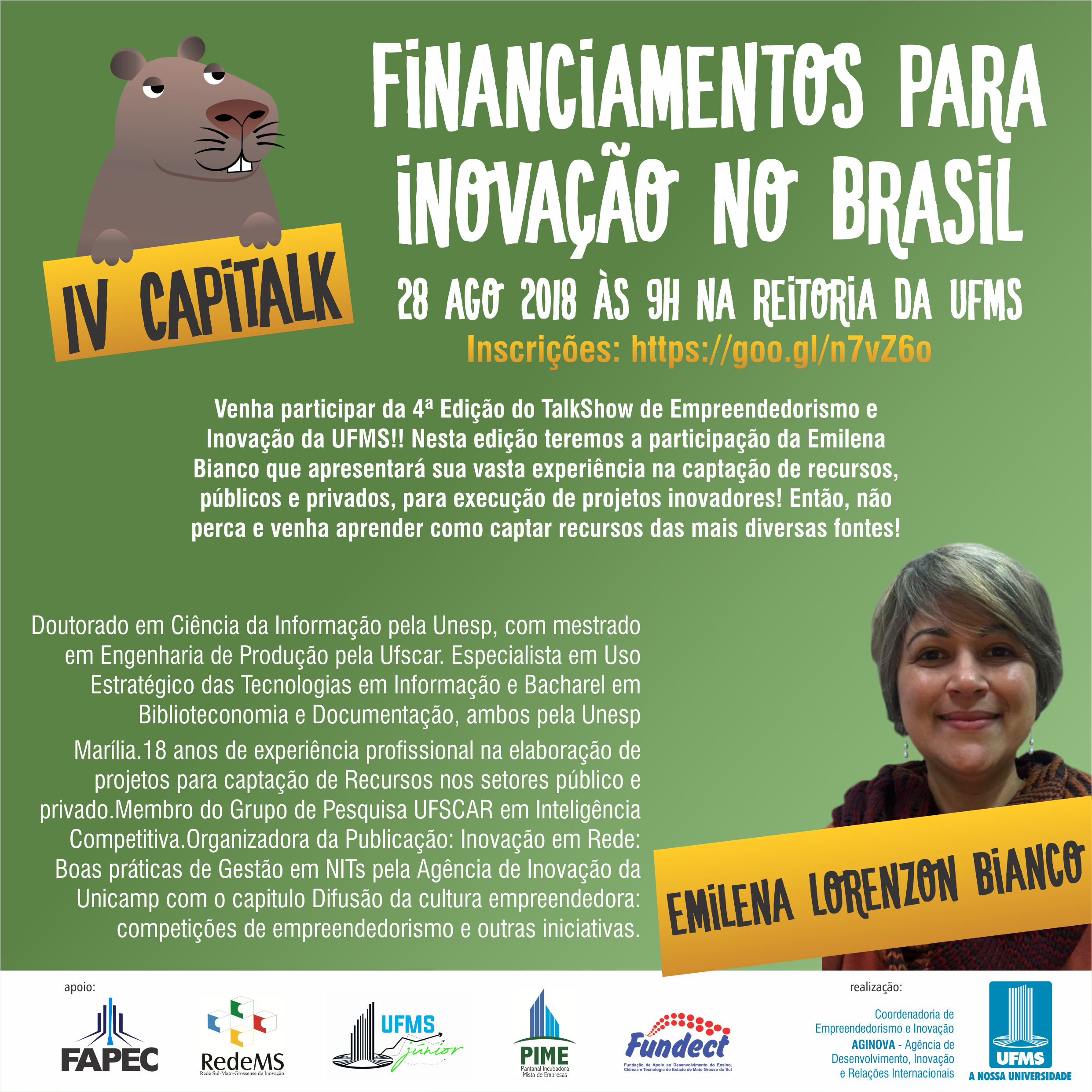 Nesta terça-feira (28), a UFMS sedia o “4º Capitalk- Financiamentos para inovação no Brasil”. Realizado pela Coordenadoria de Empreendedorismo e Inovação (CEI) da Aginova, o evento tem como objetivo reunir diversos palestrantes e oferecer conhecimento sobre essa temática, dinamizando o debate através do formato de talkshow.