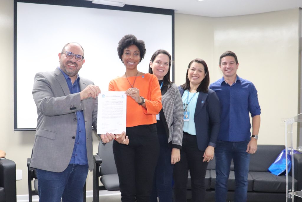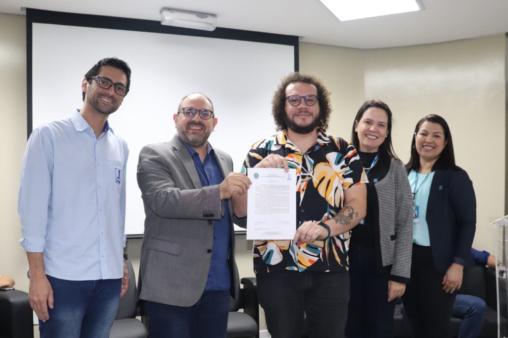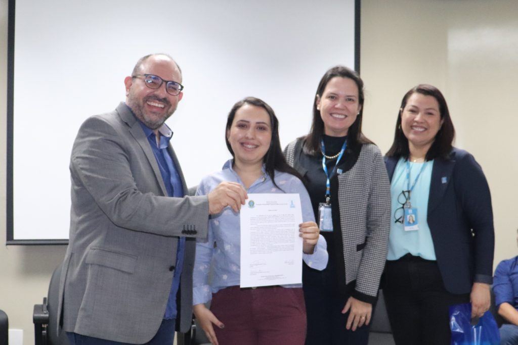 Três assistentes em Administração e um analista de Tecnologia da Informação tomaram posse na UFMS na manhã de hoje, 17. Os novos servidores atuarão na Cidade Universitária nas Agências de Internacionalização e de Inovação (Aginova) e de Tecnologia da Informação e Comunicação (Agetic) e na Pró-reitoria de Gestão de Pessoas (Progep).