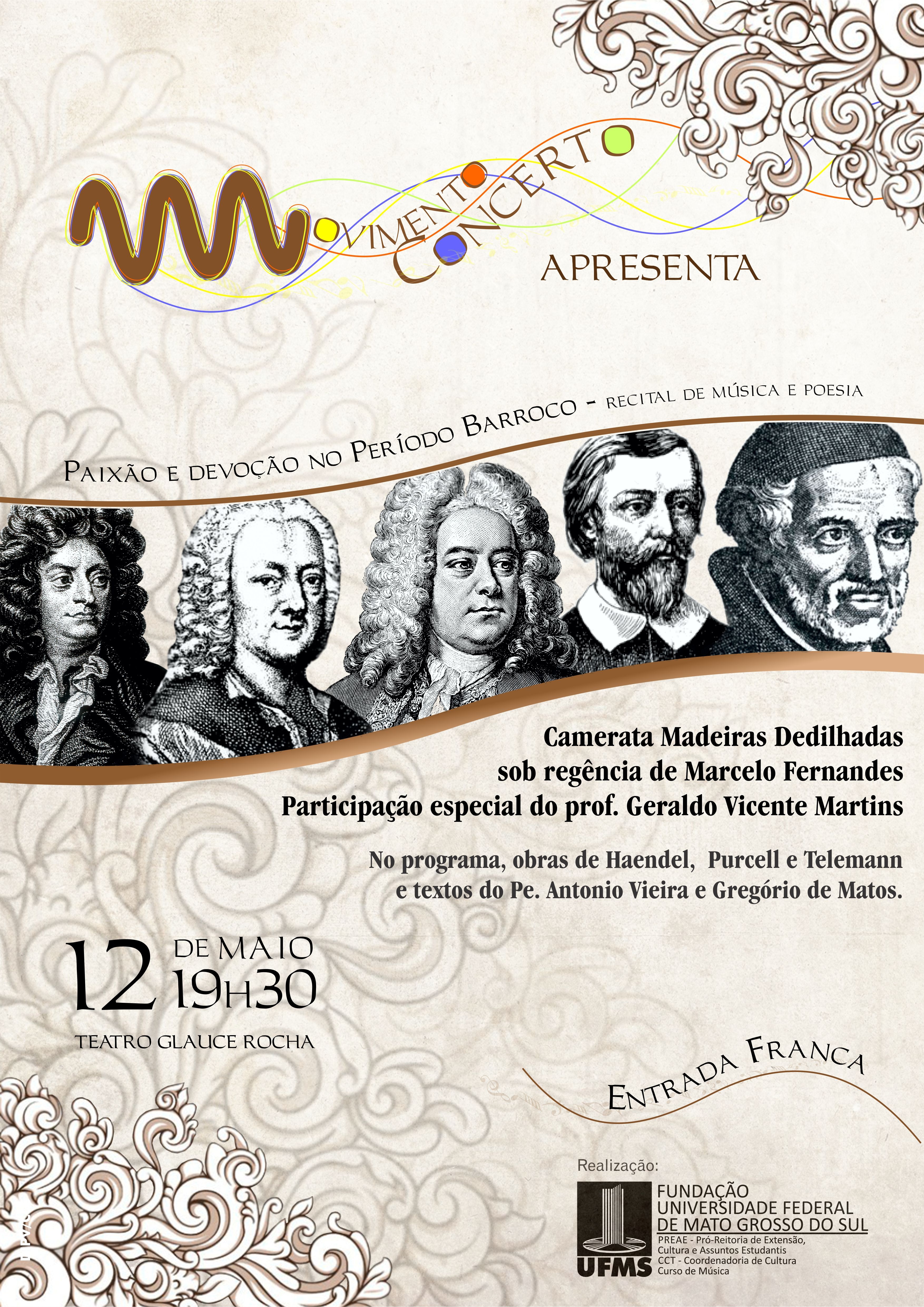 No dia 12 de maio, a partir das 19h30, o Teatro Glauce Rocha receberá o espetáculo de música e poesia Paixão e devoção no Período Barroco. O evento terá entrada franca e é uma realização do Projeto Movimento Concerto com a execução da Camerata Madeiras Dedilhadas sob a regência do professor Marcelo Fernandes. Serão apresentadas músicas dos séculos XVII e XVIII, com leituras de textos da época realizadas pelo prof. Geraldo Vicente Martins.