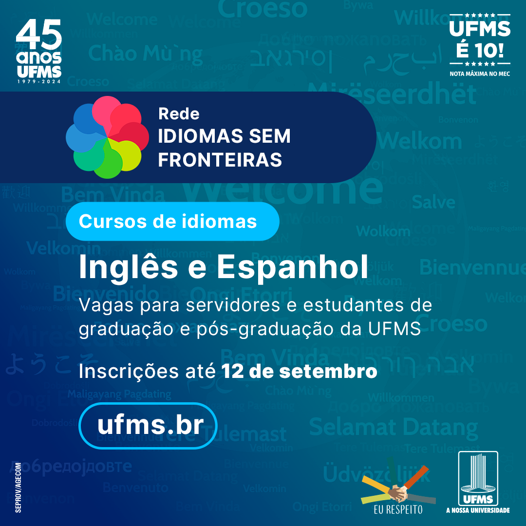 Os estudantes de graduação e pós-graduação, técnicos-administrativos e professores da UFMS têm até 12 de setembro para inscrições em cursos on-line de língua inglesa e língua espanhola. São cem vagas para encontros síncronos gratuitos ofertados pela Rede Idiomas sem Fronteiras da Associação Nacional dos Dirigentes das Instituições Federais de Ensino Superior. Os interessados devem fazer a inscrição pelo Sistema de Informação e Gestão de Projetos (Sigproj).