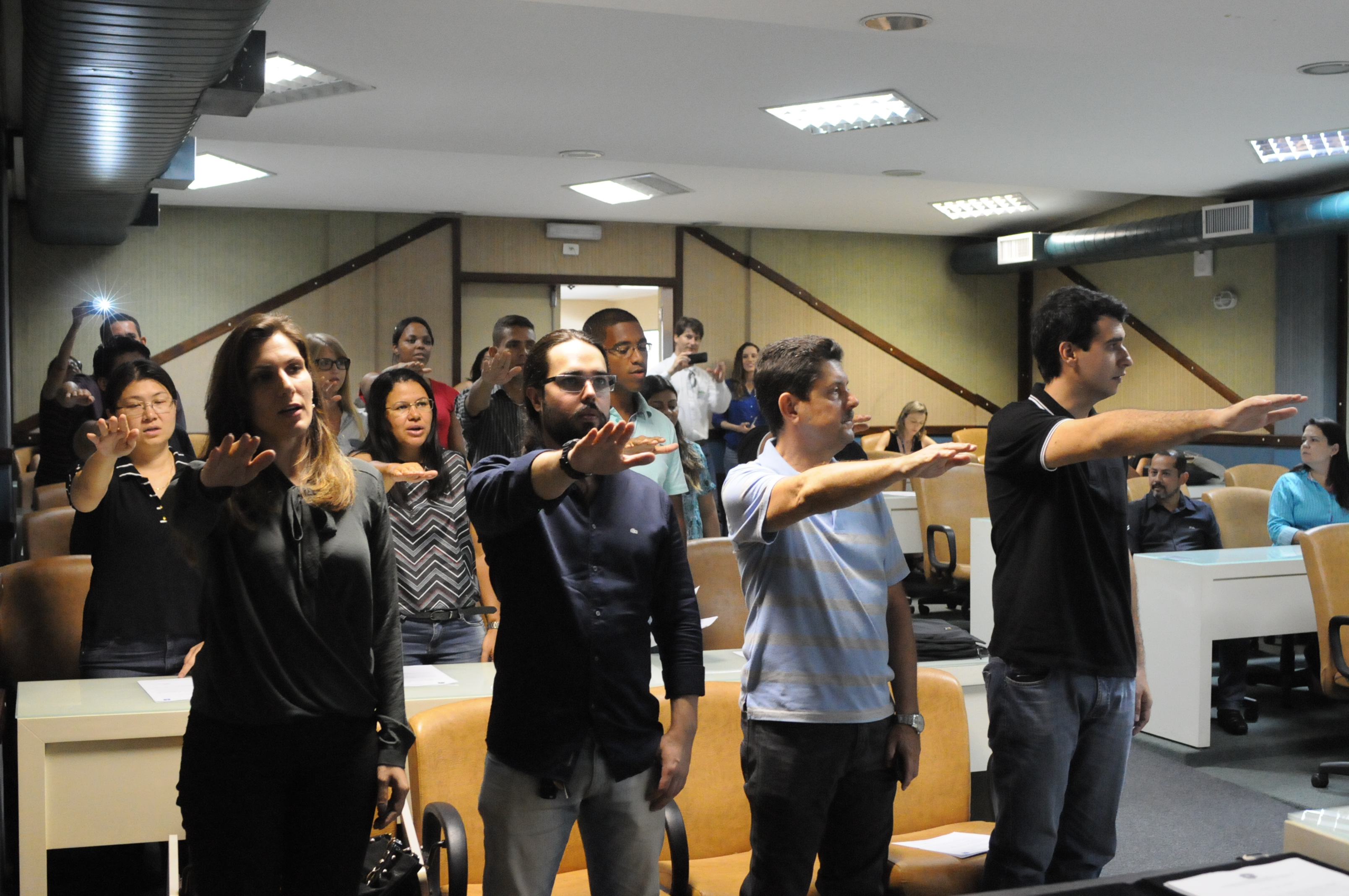 Após o juramento, os servidores foram empossados, o Cerimonial fez a leitura da Ata de Posse, e os membros da mesa deram as boas-vindas aos colegas.