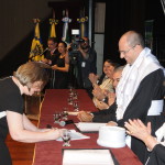 A solenidade teve continuidade com uma breve apresentação da Camerata Madeiras Dedilhadas, a leitura do termo de posse e a transmissão do cargo de Reitor. Após a leitura do termo de entrada em exercício a esposa do professor Marcelo Turine, Joseliza Alessandra Vanzela Turine, o auxiliou com as vestes talares, insígnias de sua elevada investidura. A professora Célia entregou então ao novo Reitor o capelo de cor branca, que simboliza a soma de todo o conhecimento humano, com o qual, como Reitor, conferirá o grau acadêmico e os títulos de doutor honoris causa nas solenidades oficiais da UFMS.