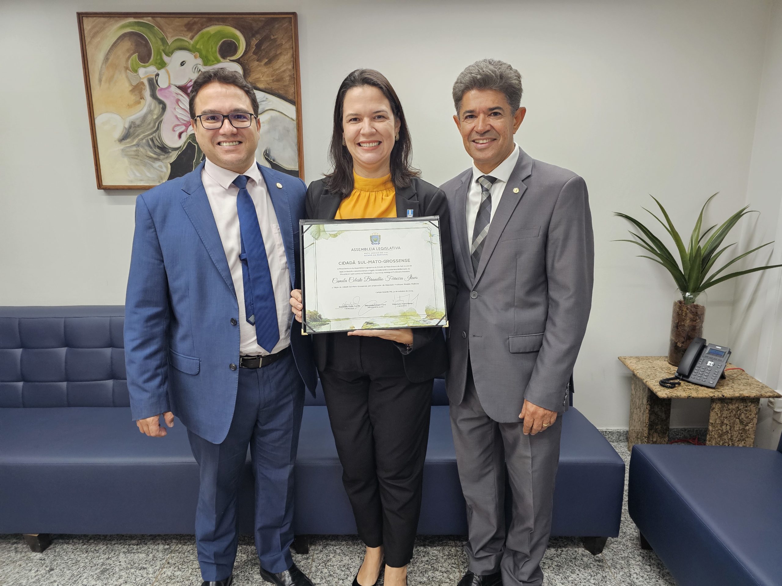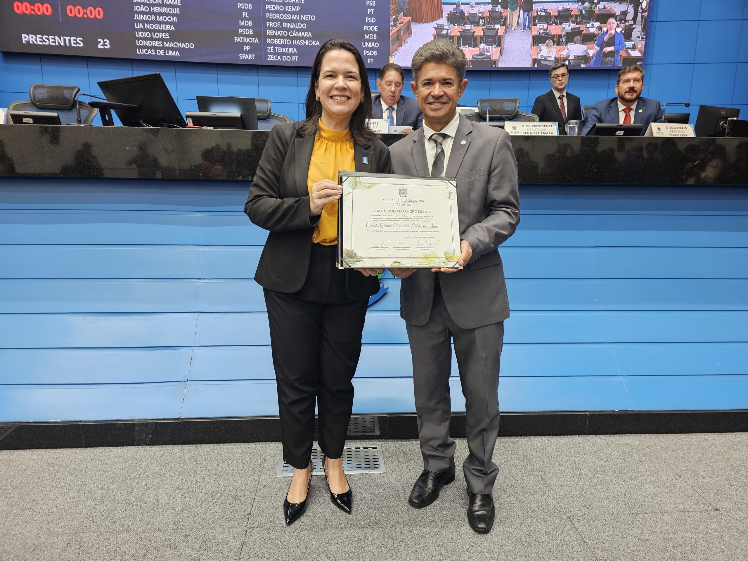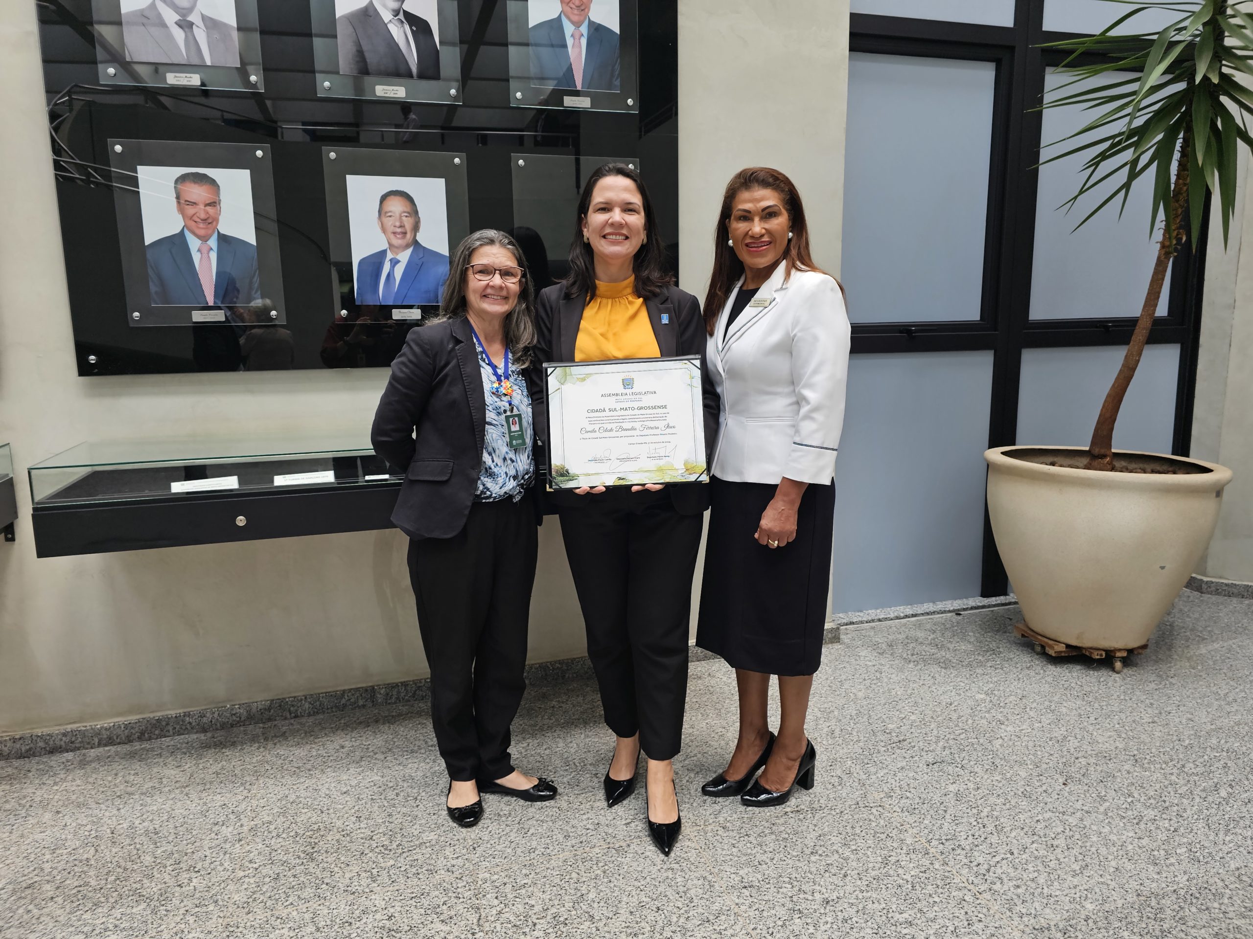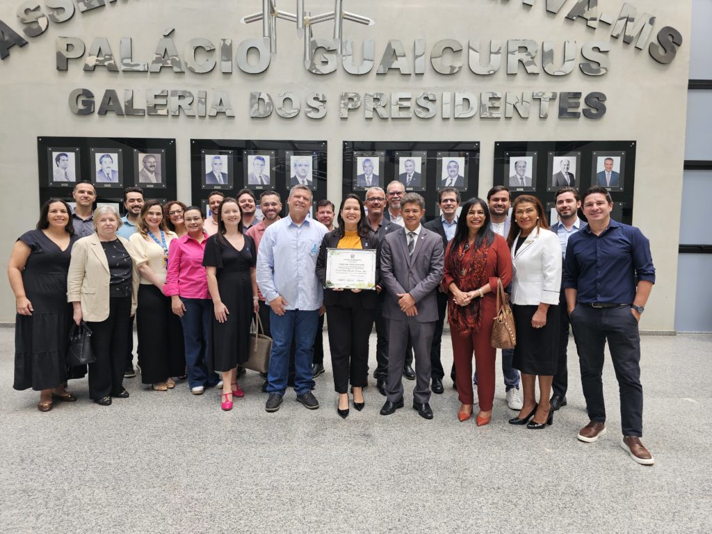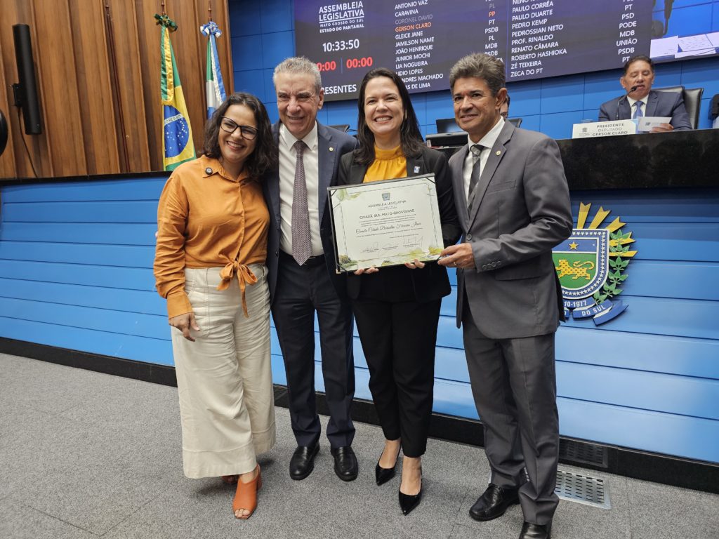 A reitora Camila Ítavo recebeu o título de cidadã sul-mato-grossense concedido pela Assembleia Legislativa de Mato Grosso do Sul (Alems) na manhã desta quarta-feira, 19. A homenagem foi proposta pelo deputado estadual e presidente da Comissão de Educação, Rinaldo Modesto, pela contribuição para a educação superior no Estado.