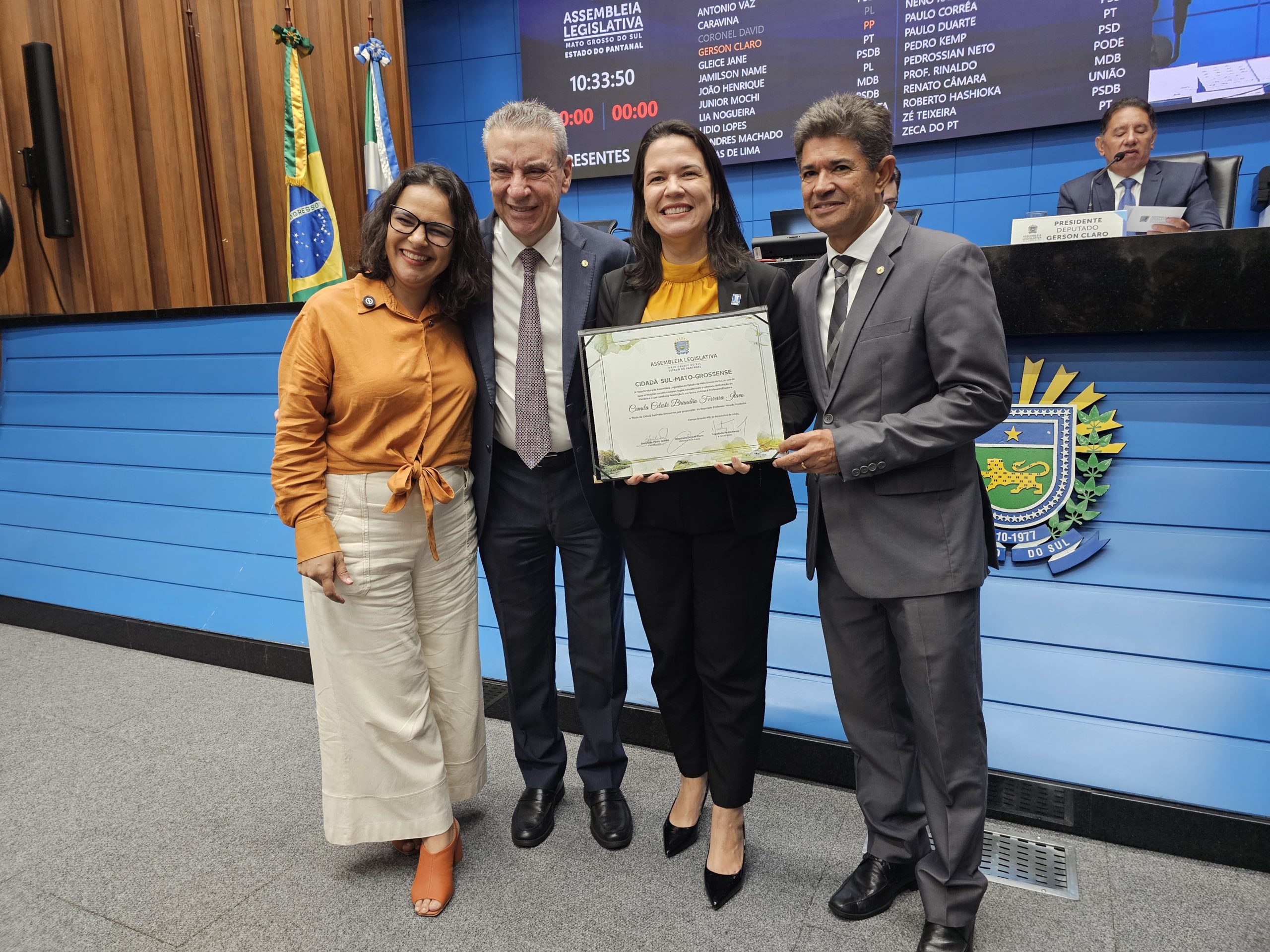 “É com muita honra que recebo esse título no dia de hoje e com muita alegria e muita humildade. Cheguei em Mato Grosso do Sul com 22 anos. Fui acolhida por esse Estado. Meus filhos nasceram aqui, são sul-mato-grossenses. Fiz a etapa de formação também aqui na Universidade Federal de Mato Grosso do Sul e é um Estado que me acolheu, onde eu tive meu primeiro emprego, onde eu tive a oportunidade de formar minha família, de ter meus filhos e de atuar como profissional. E, agora, estando à serviço da sociedade, como professora da Universidade Federal, como gestora, podendo auxiliar cidadãos e cidadãs sul-mato-grossenses e brasileiros a transformar as suas vidas por meio da educação, da ciência, podendo ajudar os gestores públicos na governança, produzindo ciência e prestando serviços de alta qualidade para toda a população”, celebrou Camila.