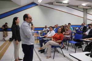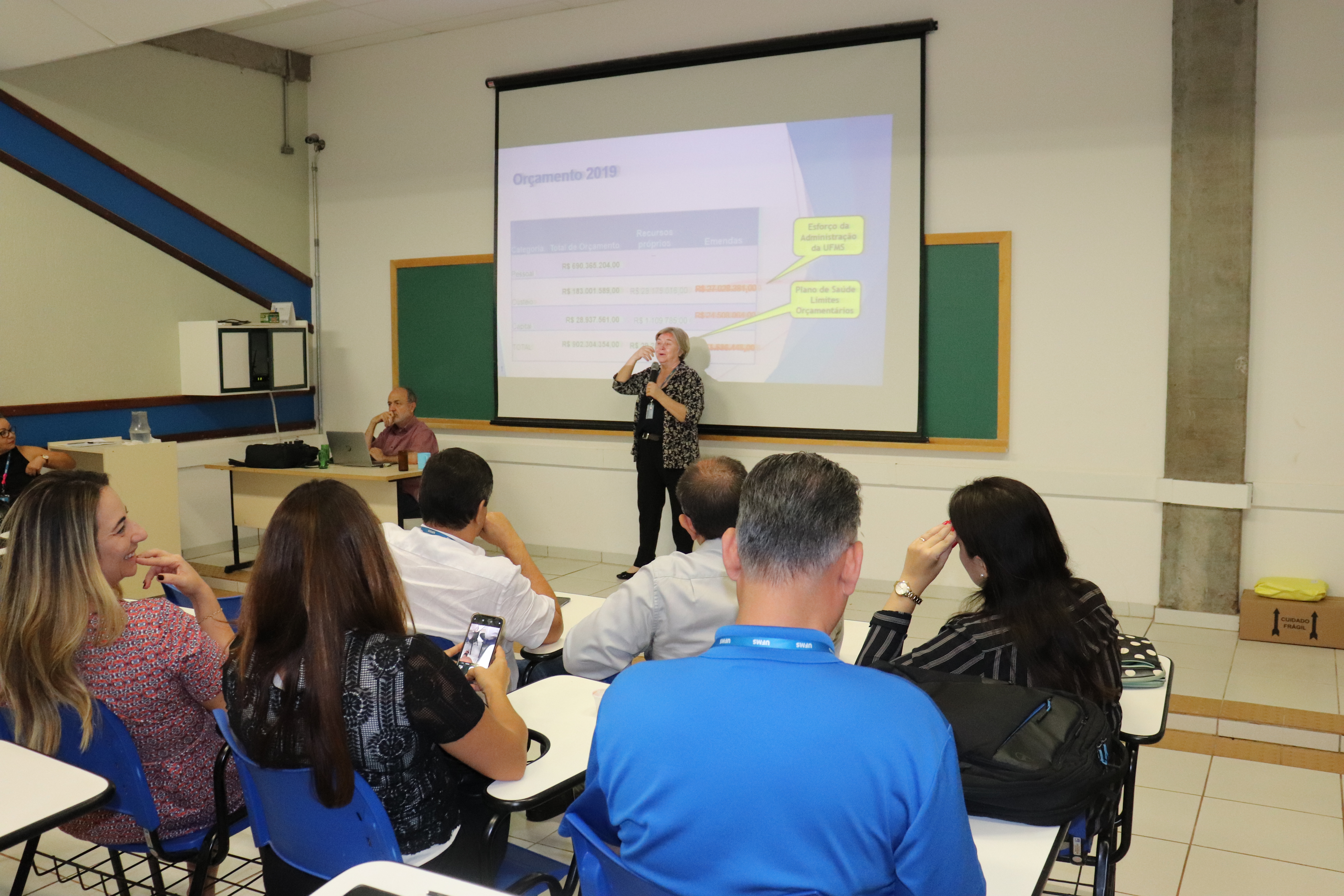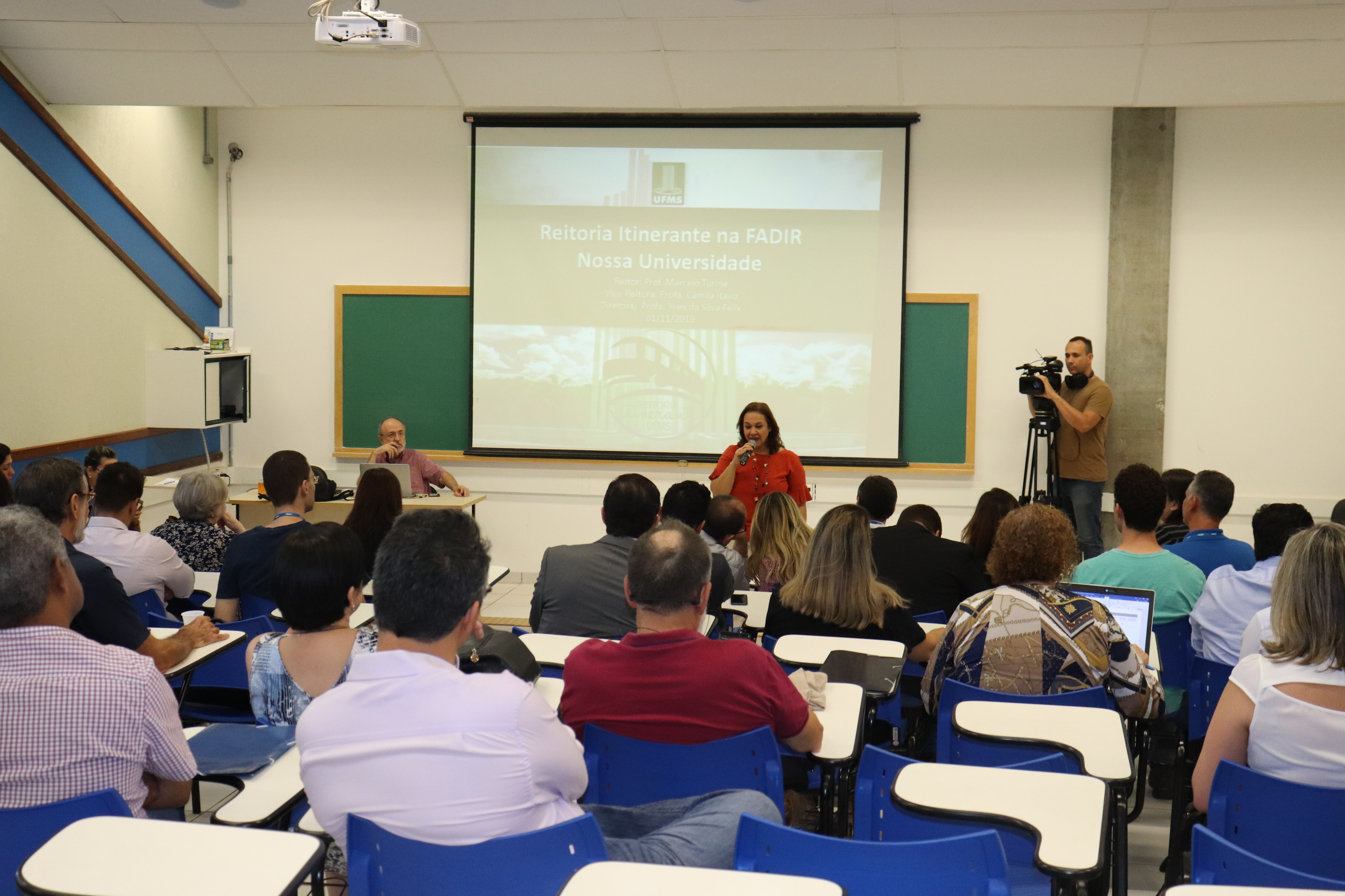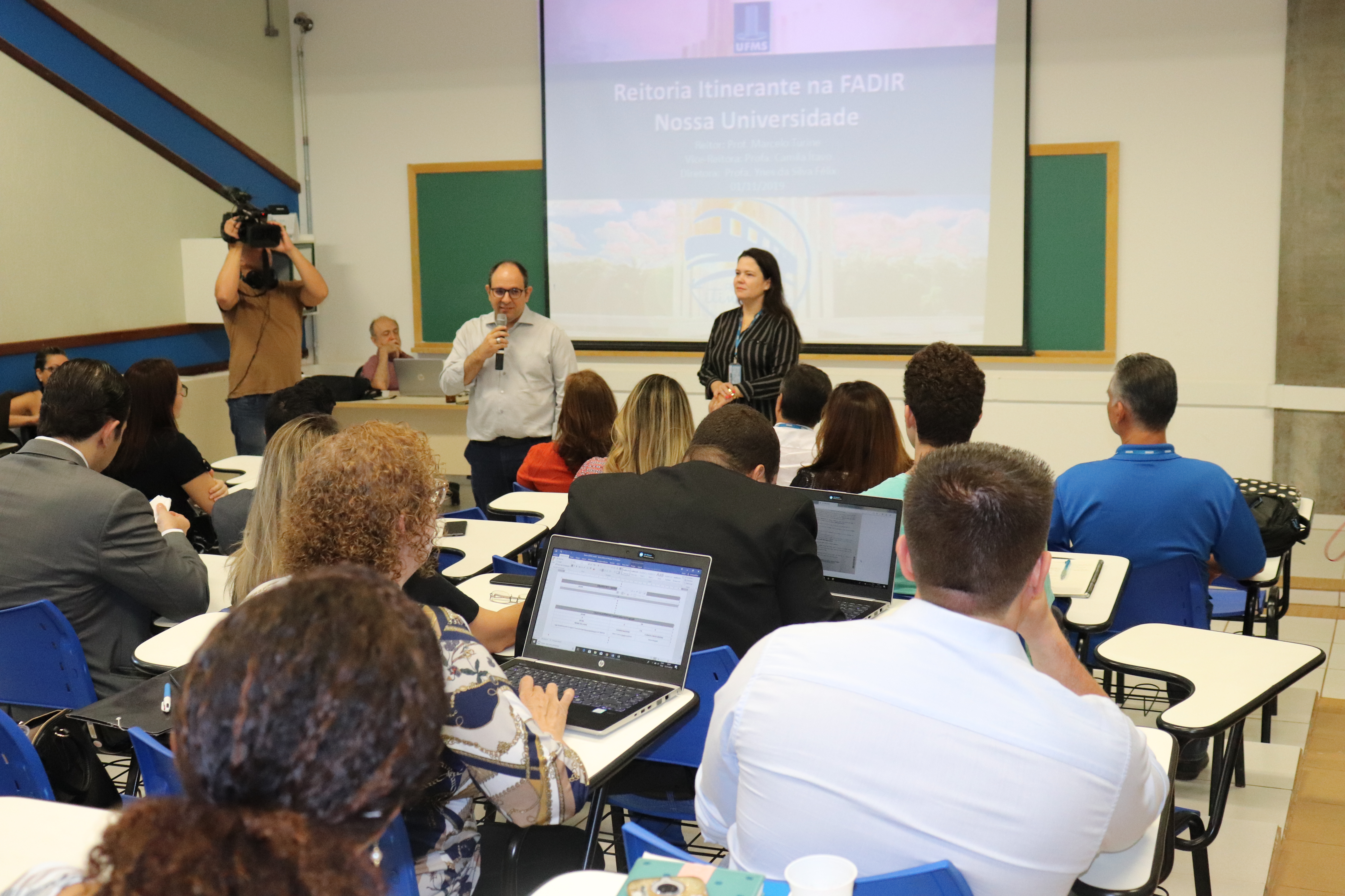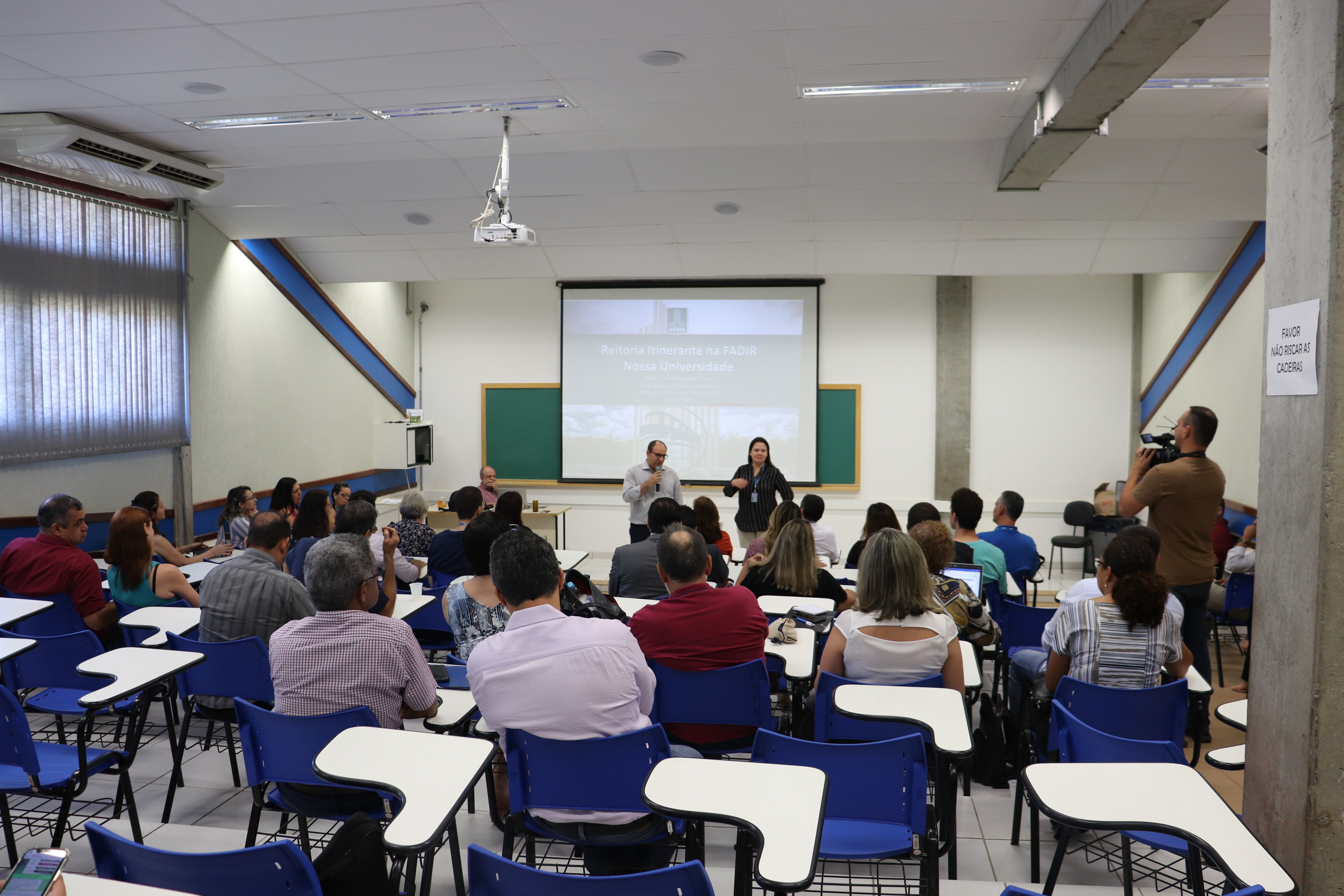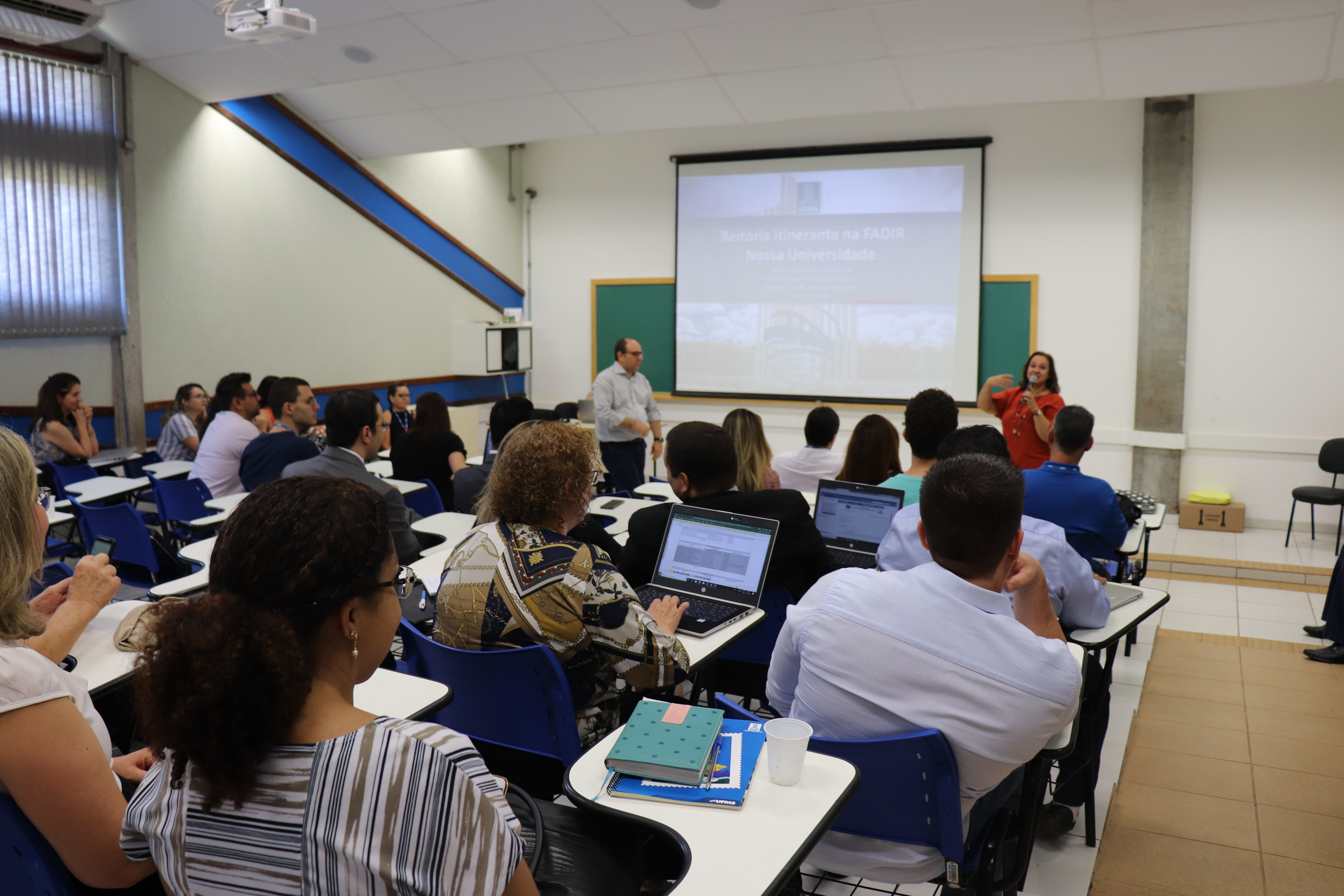 Após o término das reuniões, todos se dirigiram para o auditório 1, localizado no prédio da Faculdade de Computação, para a reunião geral com o reitor Marcelo Turine e a vice-reitora Camila Ítavo, contando também com a participação de professores e alunos. “É a primeira vez que isso acontece, que temos acesso direto a toda administração em um único momento. Trata-se de uma oportunidade importante para que os gestores possam conhecer melhor as necessidades e conquistas de cada unidade. Agradecemos pelo esforço e sensibilidade da Reitoria que possibilitou o aumento no número de docentes do curso e também iniciar as obras da construção de um prédio, que é um sonho antigo da Faculdade”, comentou a diretora da Fadir, Ynes da Silva Félix.