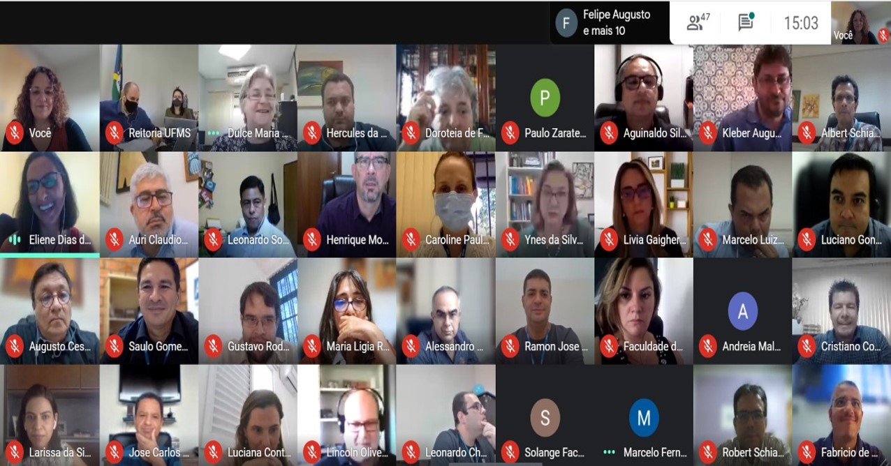 Todos os diretores das 25 unidades setoriais da UFMS participaram de uma reunião virtual pelo Google Meet na tarde de ontem (10) com o reitor Marcelo Turine, a vice Camila Ítavo e toda a Administração Central. O objetivo foi discutir as ações estratégicas da Universidade.