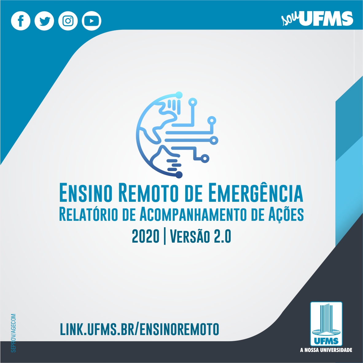 Está disponível na página do Coronavírus, no site da UFMS, o Relatório de Acompanhamento de Ações durante o Ensino Remoto de Emergência 2020. Seguindo as orientações dos órgãos sanitários, a UFMS não suspendeu suas atividades, dando continuidade às ações acadêmicas e administrativas de forma remota.