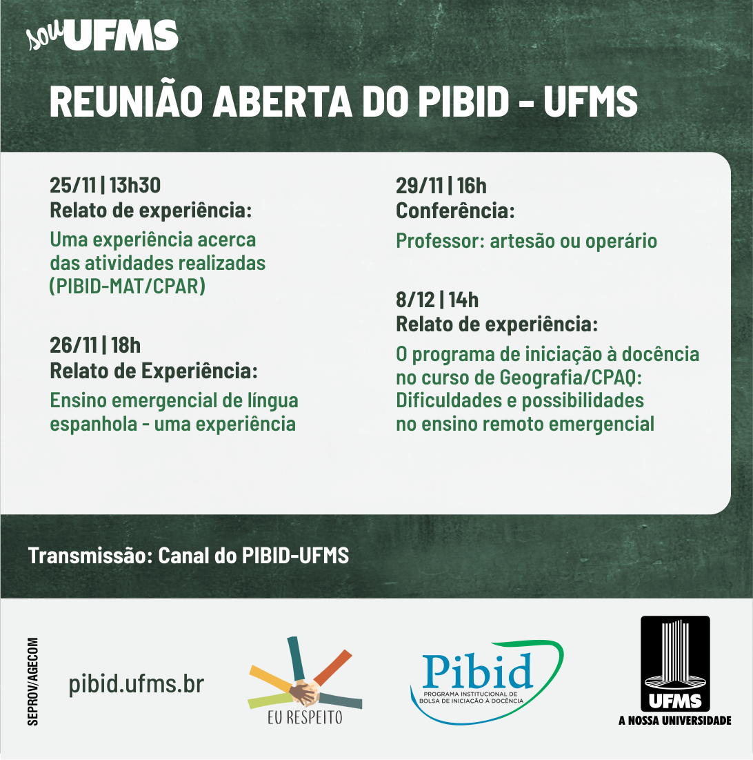 O projeto de extensão Reunião Aberta do Programa Institucional de Bolsa de Iniciação à Docência (Pibid) da UFMS tem programados para novembro e dezembro mais quatro encontros virtuais: três relatos de experiência e uma conferência. As atividades serão transmitidas no canal do Pibid e fazem parte da campanha Eu Respeito, que em novembro promove o conhecimento em suas diversas maneiras.