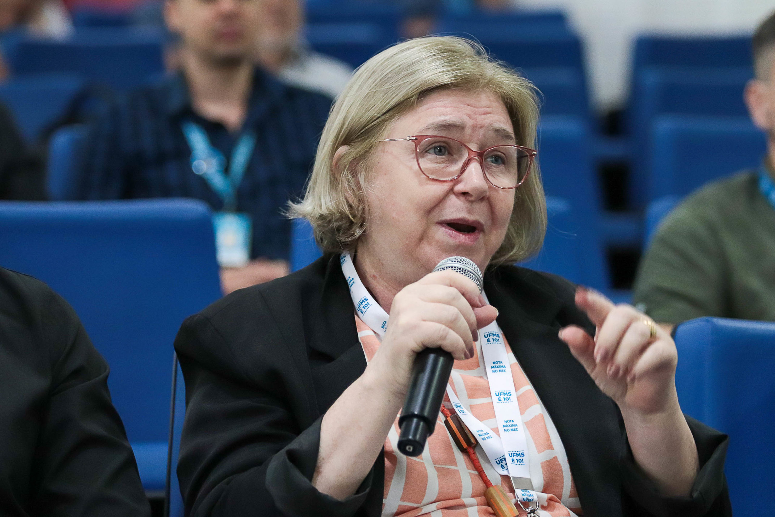 “Agradeço muito pela oportunidade de estar na UFMS, conhecer melhor vocês e poder compartilhar um pouco sobre o que temos pensados a respeito da educação superior, em relação às diretrizes estratégicas para as universidades federais. No Brasil, temos uma estrutura híbrida, com instituições de ensino superior públicas e privadas. Olhando para o Censo vemos que cerca de 80% do ensino superior é privado. Em termos de quantidades de estudantes, na rede federal, temos mais de um milhão na graduação e quase o mesmo número na pós-graduação. Mais de 28 milhões pelo menos de pessoas da sociedade se beneficiam de programas de extensão desenvolvidos pelas instituições federais. A rede está em mais de 500 municípios do país. É uma abrangência grande”, iniciou Tânia.