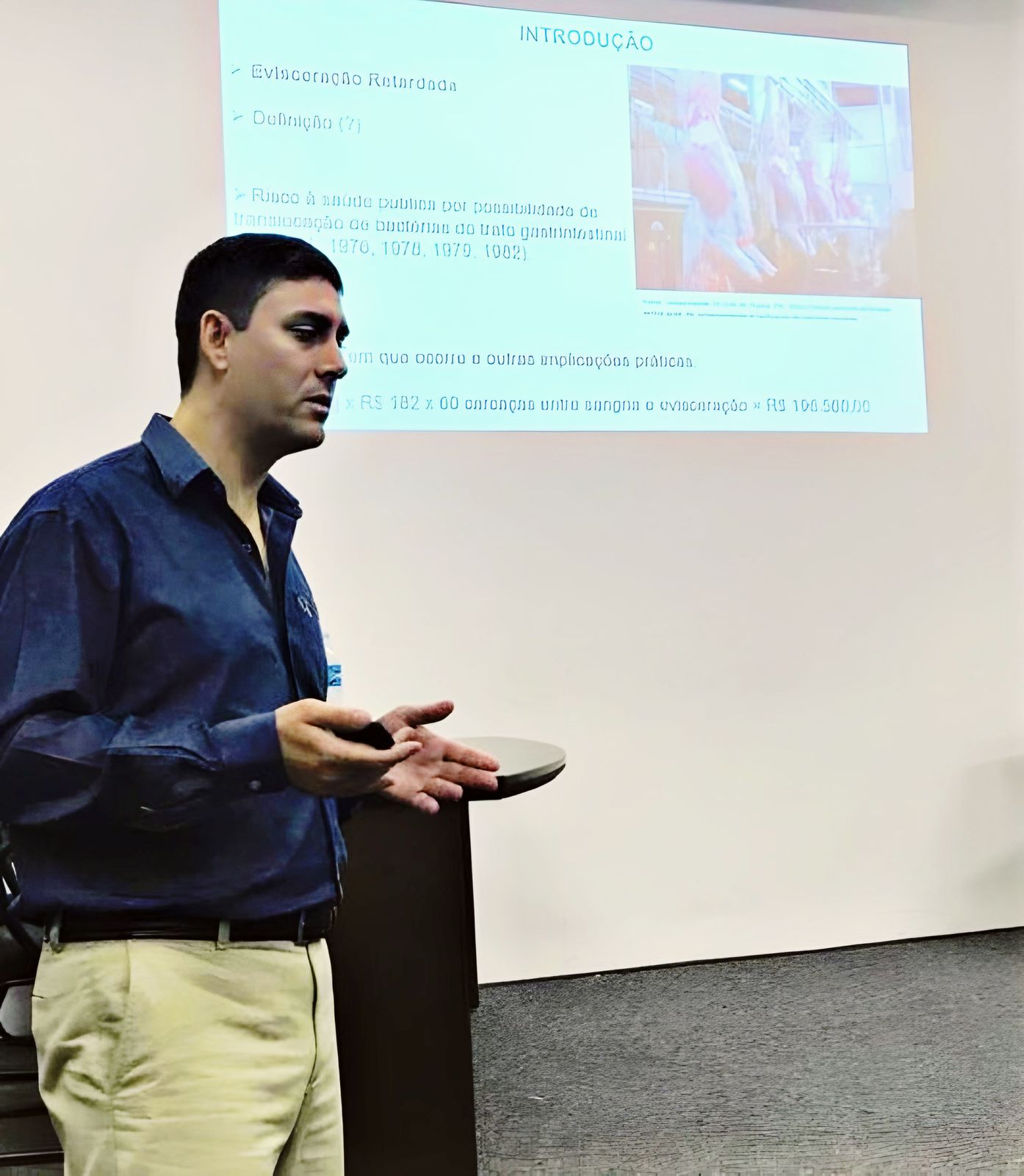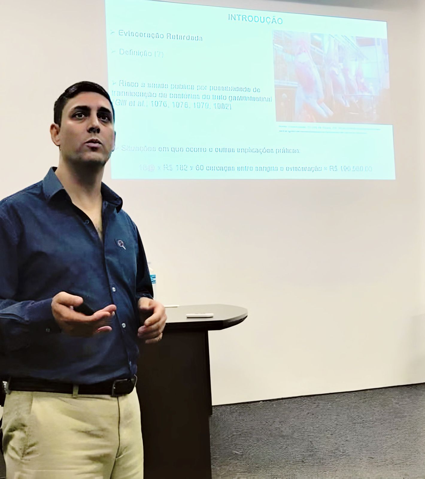 Antes de chegar às mesas do consumidor, um longo caminho é percorrido e o produto passa por muitas fases. Uma delas é fundamental na determinação não apena da qualidade, mas da proteção à saúde de quem consome: trata-se do manejo das carcaças nos frigoríficos. Pesquisa desenvolvida no Mestrado em Ciência Animal pelo médico veterinário Alexandre Lopes Junqueira abordou a influência do atraso na evisceração das carcaças bovinas e a relação com a contagem de microrganismos patogênicos nelas presentes. “É um estudo de extrema importância para a indústria alimentícia e a saúde pública. A evisceração é uma etapa crítica no processamento da carne, e qualquer atraso nesse processo pode criar condições favoráveis para o crescimento e multiplicação de microrganismos patogênicos”, explica Alexandre, que é auditor fiscal agropecuário no Ministério da Agricultura e Pecuária (Mapa).