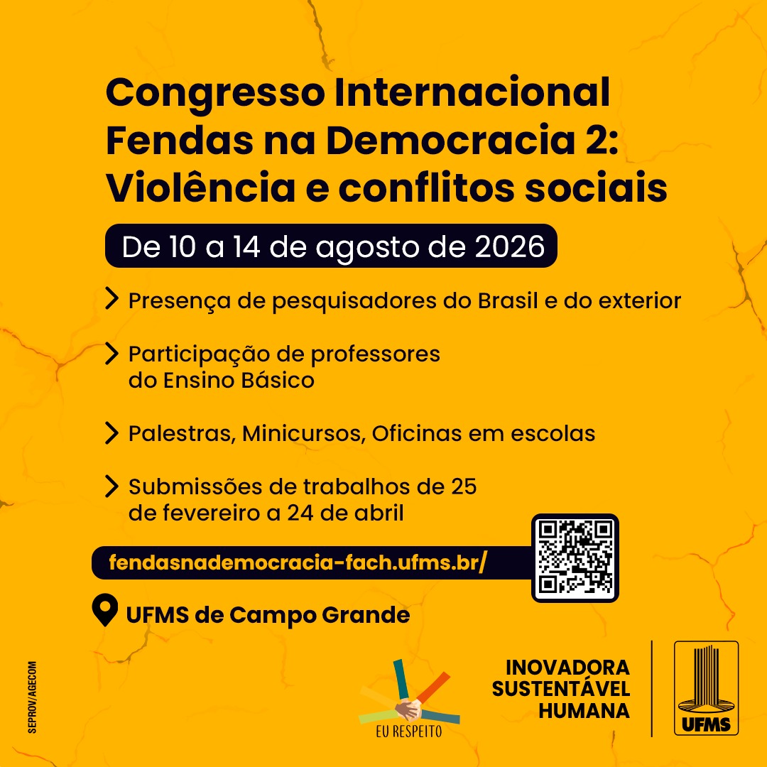 A segunda edição do Congresso Internacional Fendas da Democracia já tem data marcada: de 10 a 14 de agosto. As inscrições para submissão de trabalhos de estudantes, professores universitários e docentes da educação básica estão abertas e podem ser feitas até 24 de abril. O tema desta edição será “violência e conflitos sociais”.