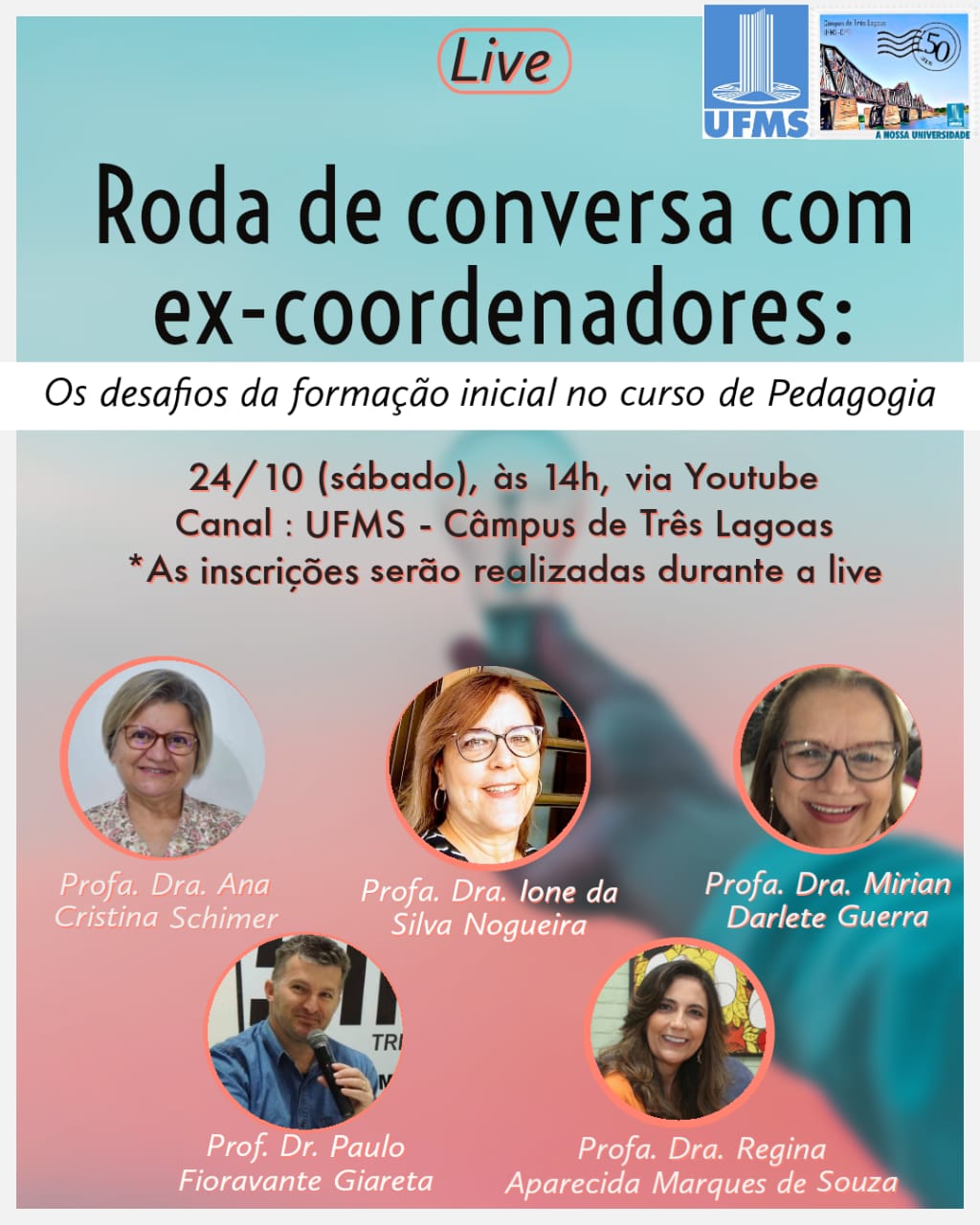 Neste sábado, 24, às 14h, será transmitido no canal UFMS – Campus de Três Lagoas, o terceiro encontro desta série de eventos. A roda de conversa com ex-coordenadores abordará os desafios da formação inicial no curso de Pedagogia.