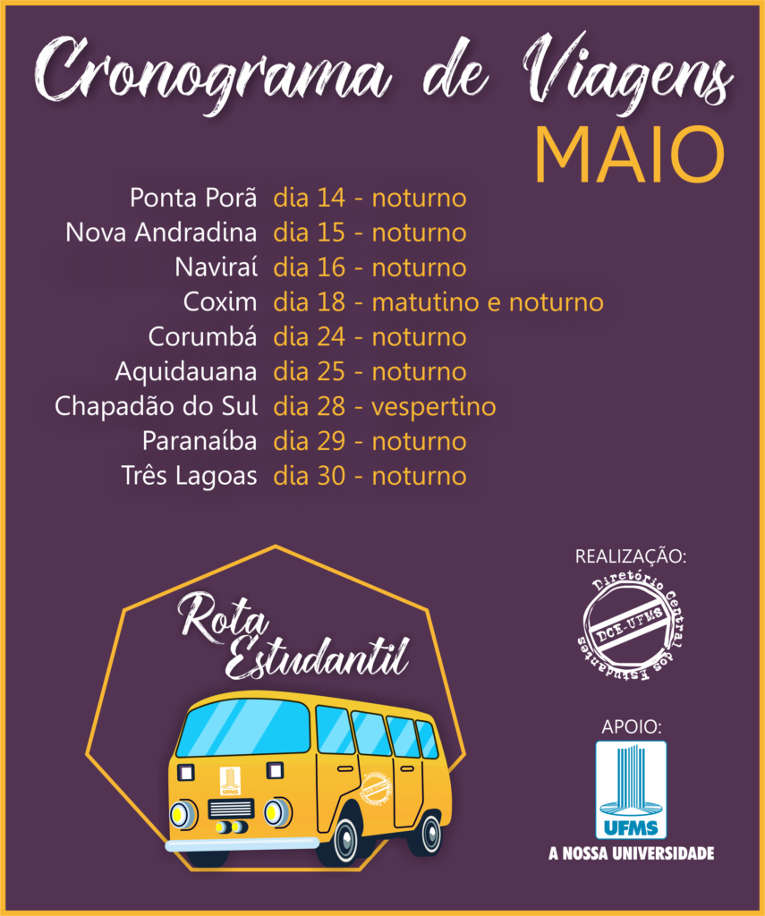 As viagens do Rota Estudantil contam também com o apoio da Liga das Atléticas da UFMS (LAUFMS) e da Federação das Empresas Juniores de Mato Grosso do Sul (Fejems).