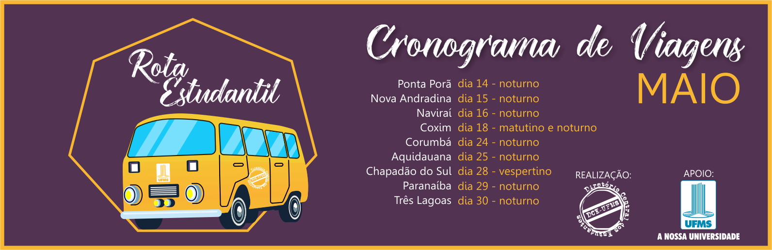As viagens do Rota Estudantil contam também com o apoio da Liga das Atléticas da UFMS (LAUFMS) e da Federação das Empresas Juniores de Mato Grosso do Sul (Fejems).