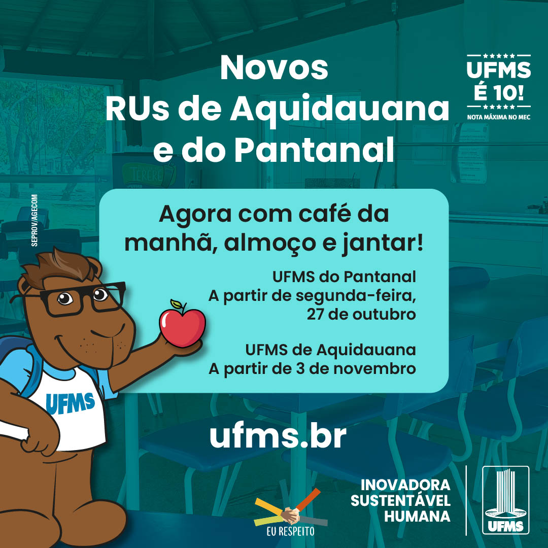 Os Restaurantes Universitários (RUs) dos Câmpus da UFMS do Pantanal e de Aquidauana iniciam uma nova fase a partir da semana que vem com oferta de café da manhã, almoço e jantar. Os espaços receberam melhorias de infraestrutura, com nova pintura interna e externa e manutenção hidráulica e elétrica.