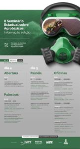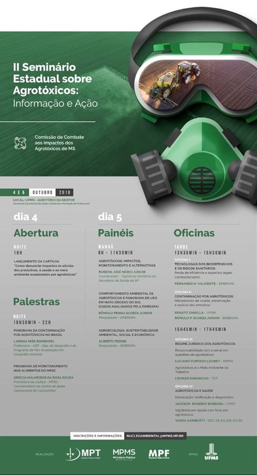 Durante os dois dias de evento, a programação reúne palestras, painéis e oficinas, que serão ministradas por grandes profissionais da área, no auditório da SEDFOR. A partir das 19 horas, será realizada abertura do seminário e o lançamento da cartilha “Como denunciar impactos às atividades produtivas, à saúde e ao meio ambiente ocasionados por agrotóxicos”. Os interessados em participar, devem preencher o formulário, disponível no aqui. Mais informações, entre em contato pelo e-mail nucleoambiental@mpms.mp.br